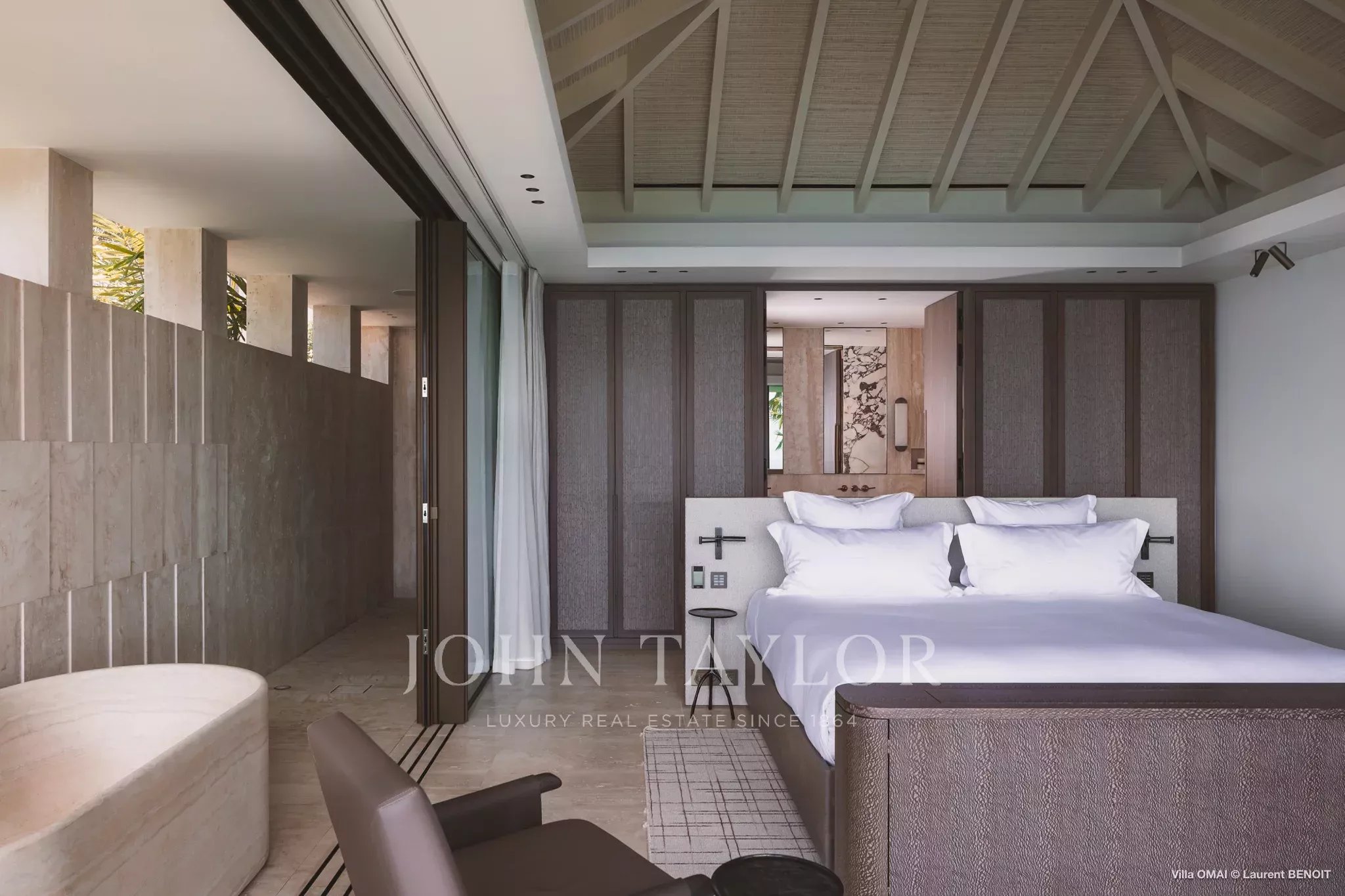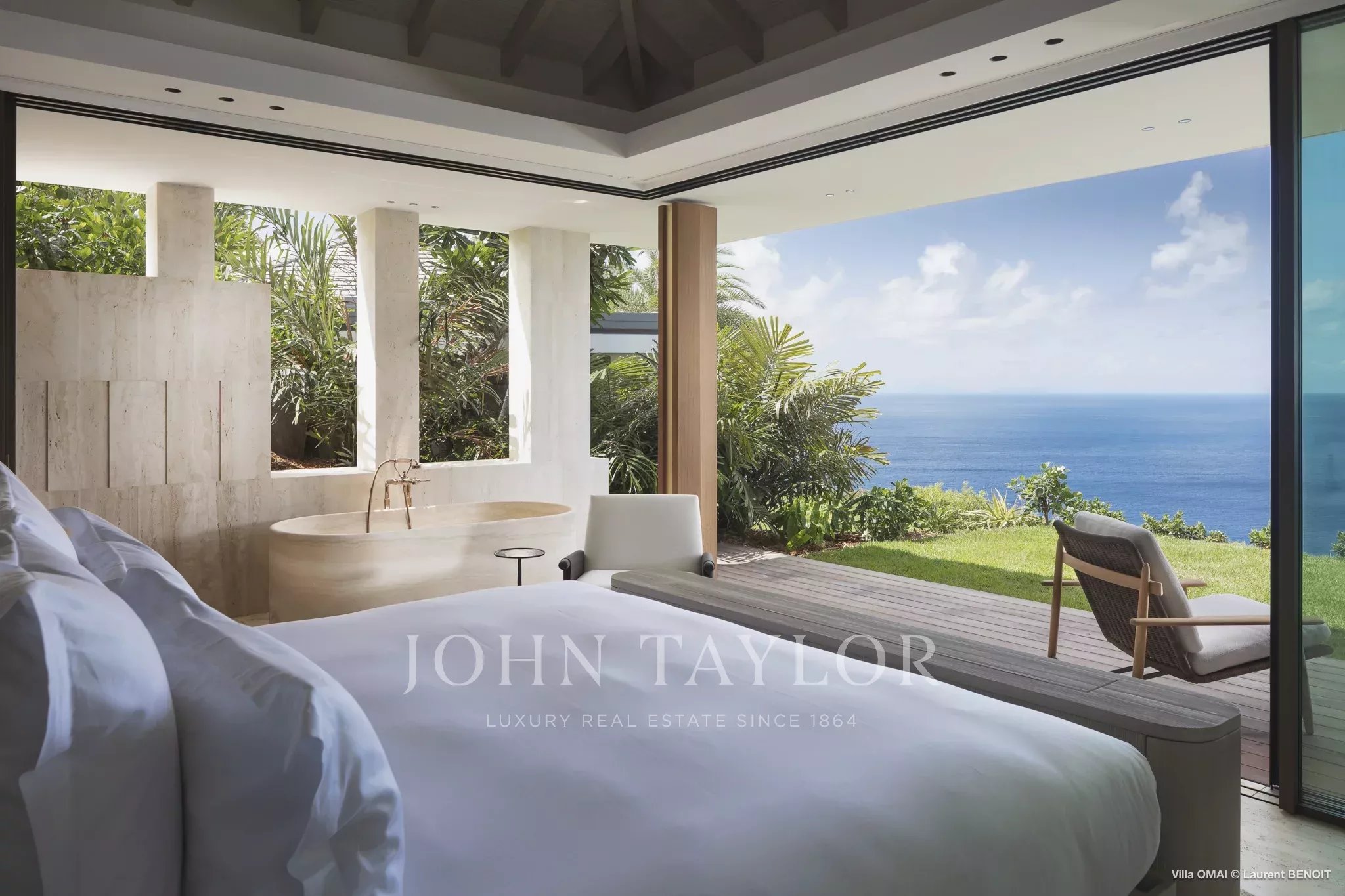 Les six suites, véritables refuges privés, disposent de lits king-size, de prestations domotiques modernes et de terrasses offrant une vue directe sur l’océan. L’architecture favorise une continuité naturelle entre intérieur et extérieur, avec de larges espaces de réception s’ouvrant sur des jardins paysagers, des terrasses ensoleillées et des piscines à débordement semblant se fondre dans l’horizon.