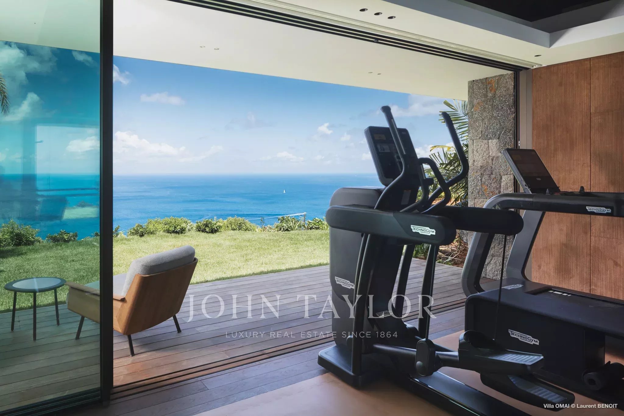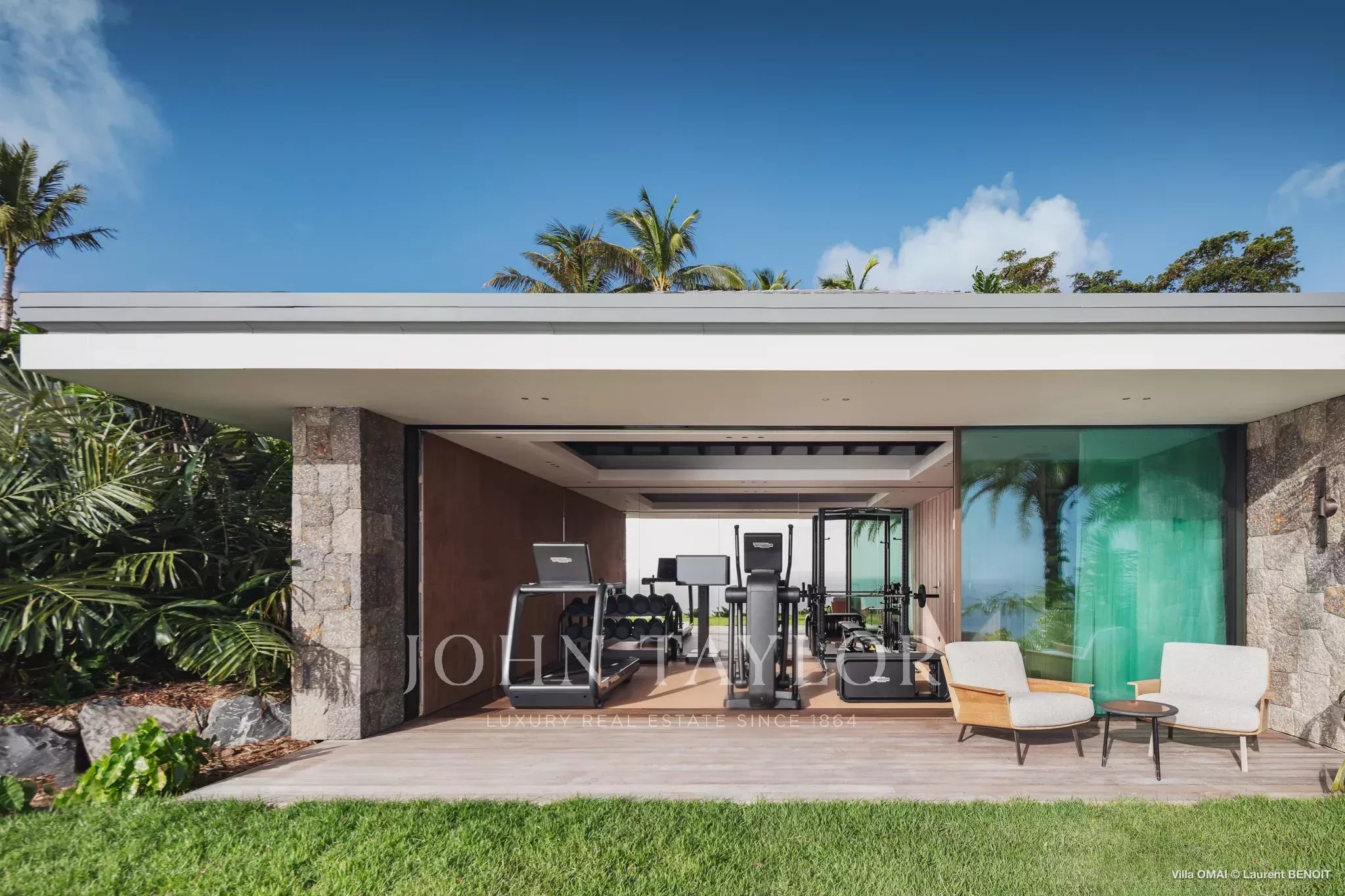 La Villa Omai Zilé propose également des équipements rares sur l’île : un studio de fitness Technogym, un espace yoga, des zones dédiées aux soins bien-être, ainsi que le seul terrain de padel privé de Saint-Barth, surplombant la baie de Flamands. Pour prolonger les soirées, un espace club privé permet d’organiser des événements exclusifs dans un cadre résolument unique.