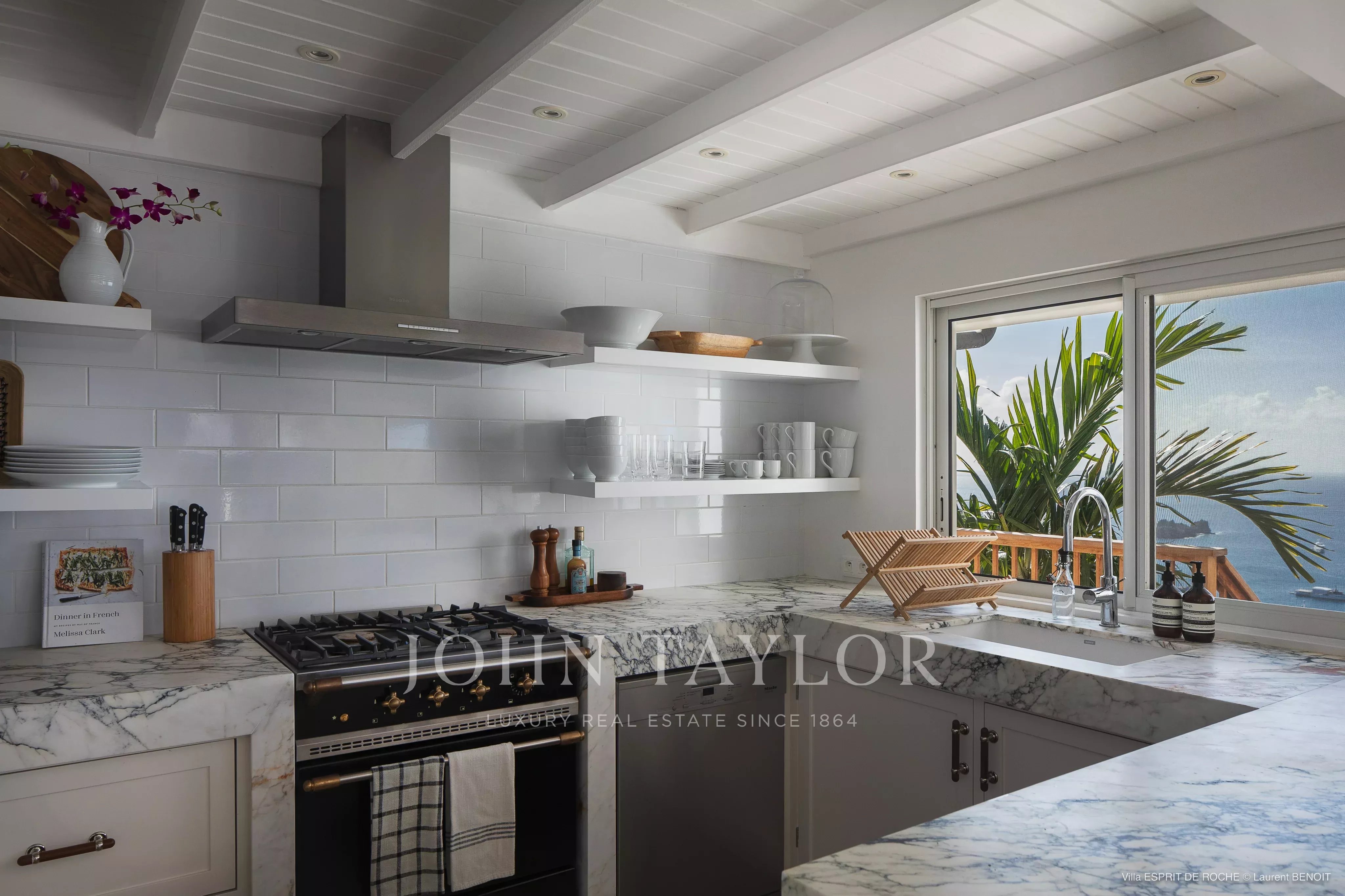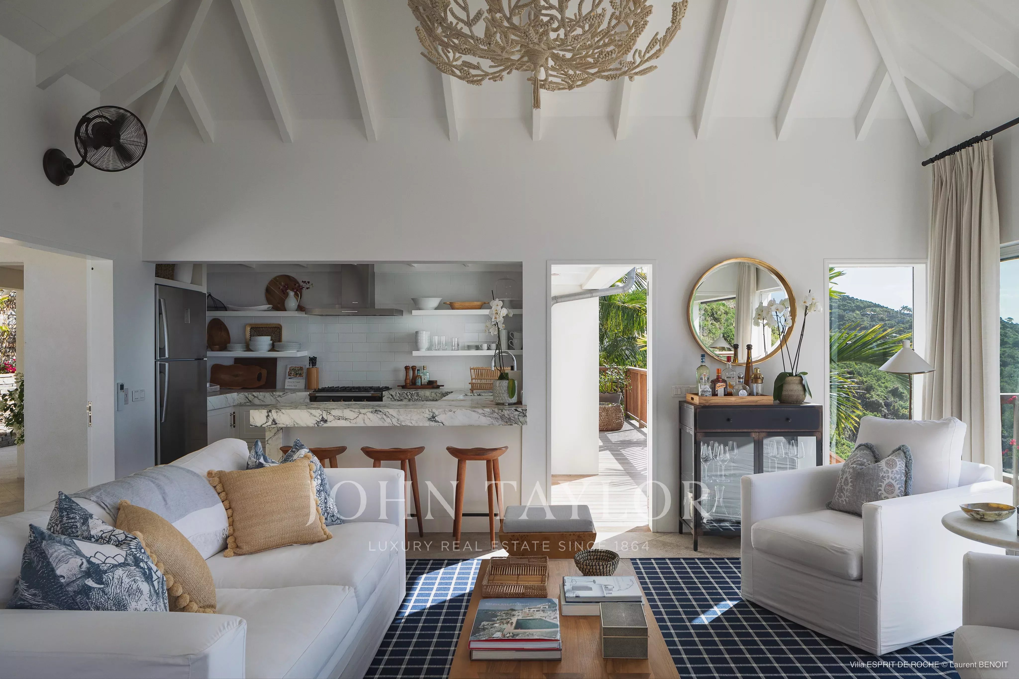 Entièrement repensée avec goût, la villa se déploie sur plusieurs niveaux et pavillons, révélant à chaque instant des perspectives spectaculaires. Depuis ses espaces de vie, le regard s’étend jusqu’aux îles voisines de Nevis, Saint-Kitts, Statia et Saba, composant un panorama d’une beauté saisissante. Le niveau principal s’ouvre harmonieusement sur l’extérieur : un salon lumineux, habillé de lignes contemporaines, dialogue avec une cuisine ouverte élégamment équipée et son bar. La salle à manger, subtilement installée entre intérieur et extérieur sur une terrasse couverte, invite à recevoir jusqu’à huit convives dans une atmosphère douce, caressée par les alizés. Un salon extérieur prolonge cet espace, parfait pour savourer la quiétude du lieu.