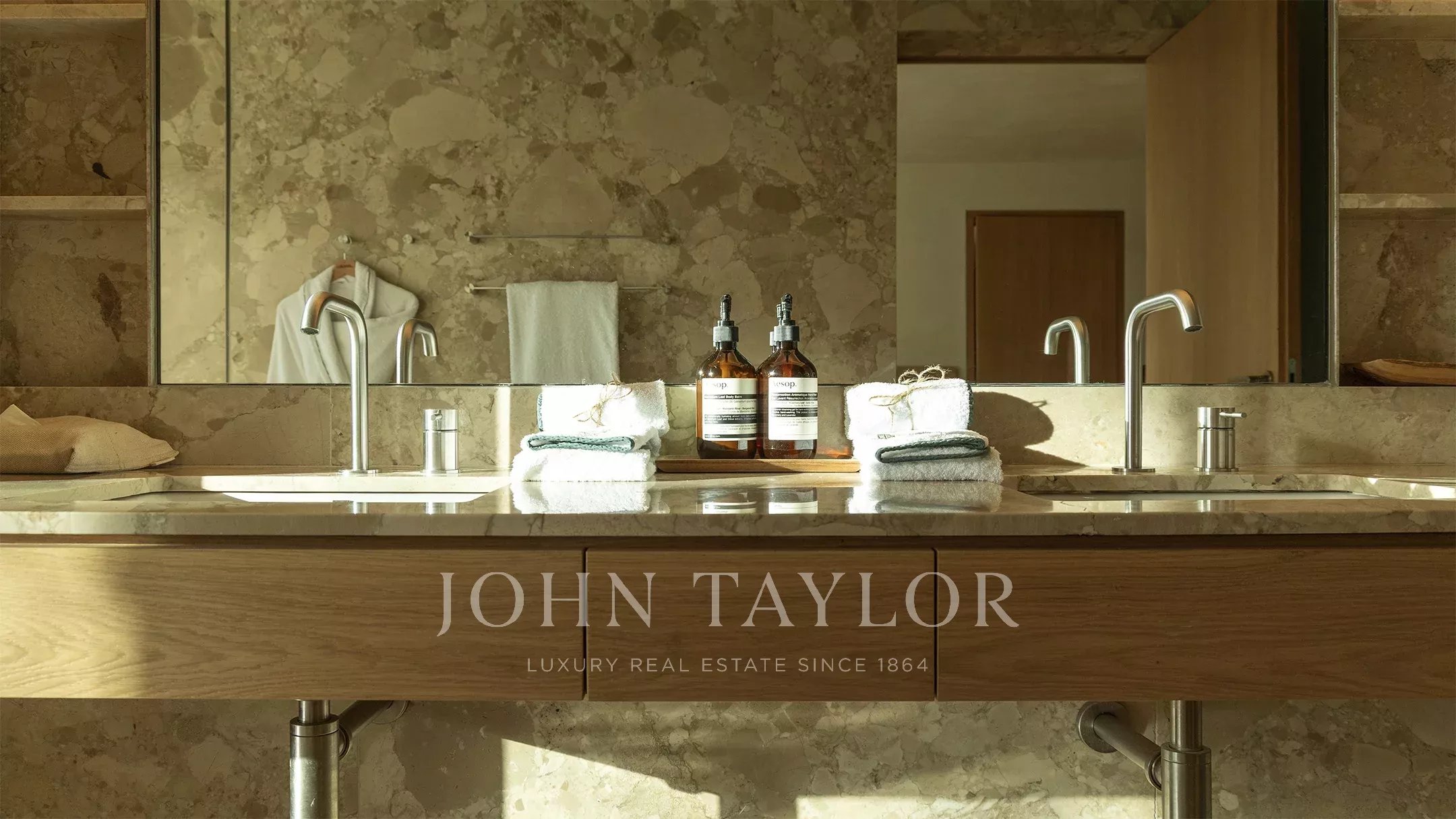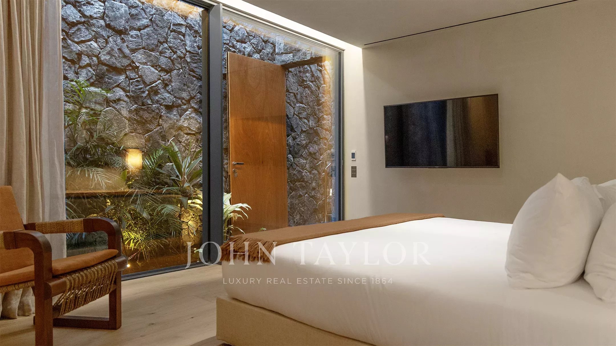 Les cinq chambres, toutes situées au niveau inférieur, présentent des dimensions équivalentes et une décoration épurée, à la fois contemporaine et accueillante. Chacune bénéficie d’un accès direct aux jardins, offrant une réelle indépendance tout en conservant une cohérence architecturale d’ensemble.