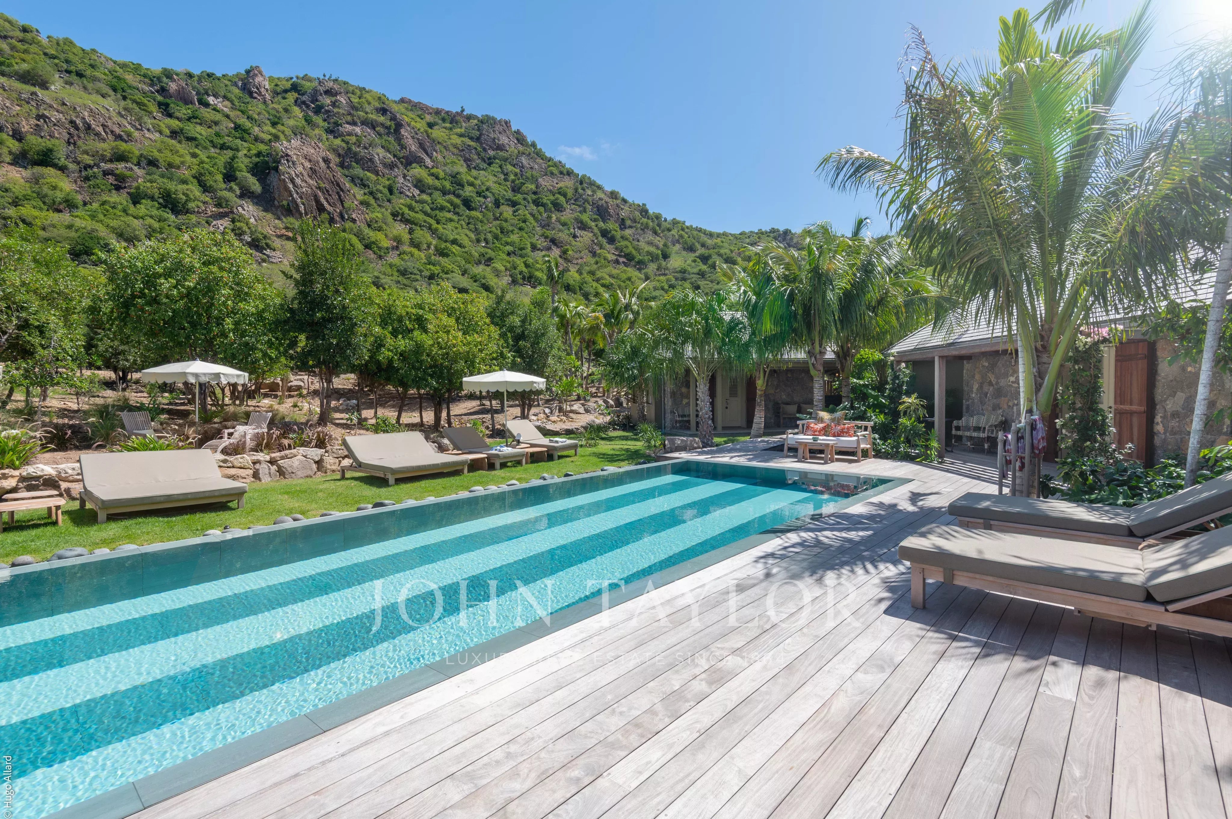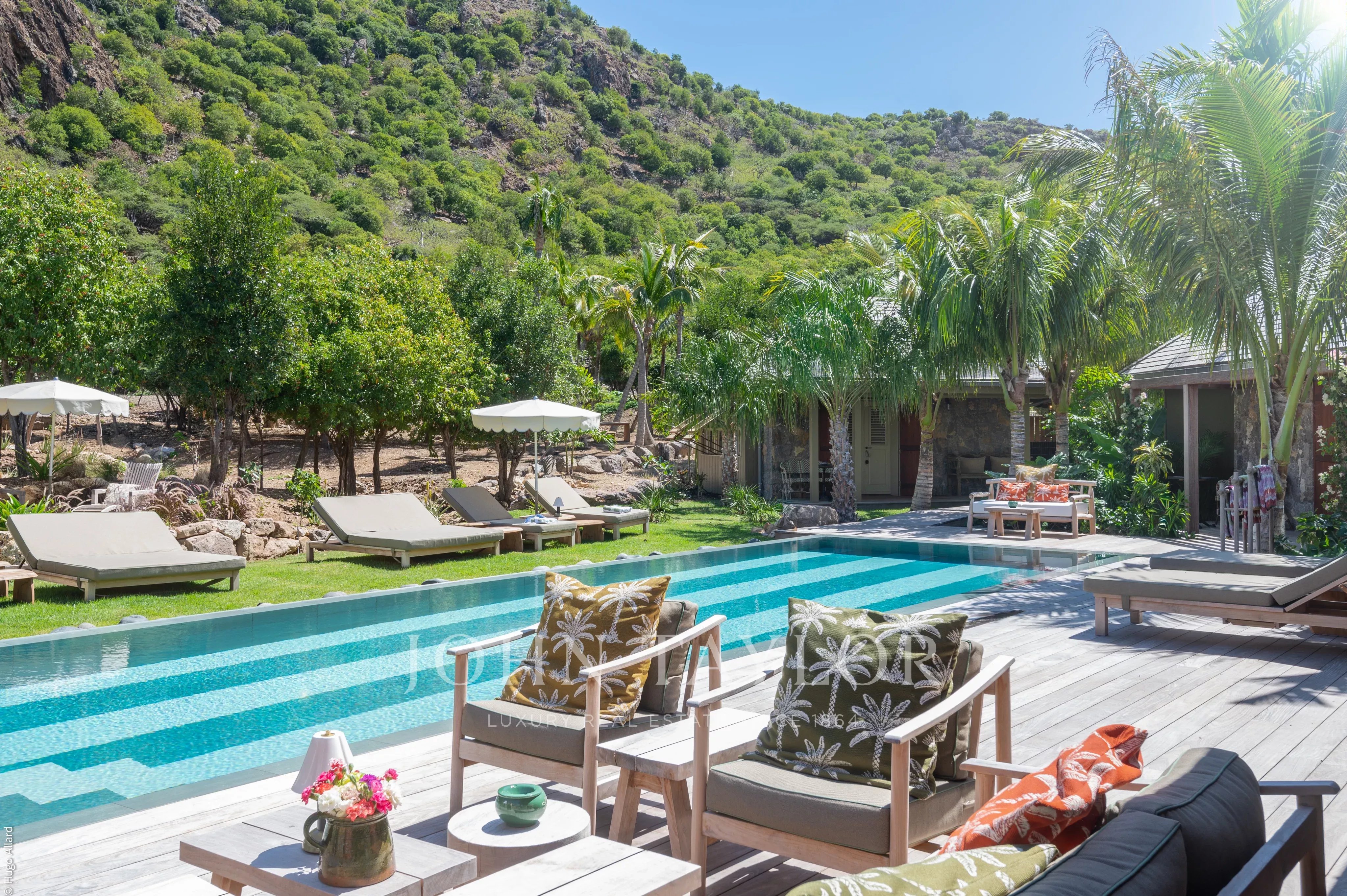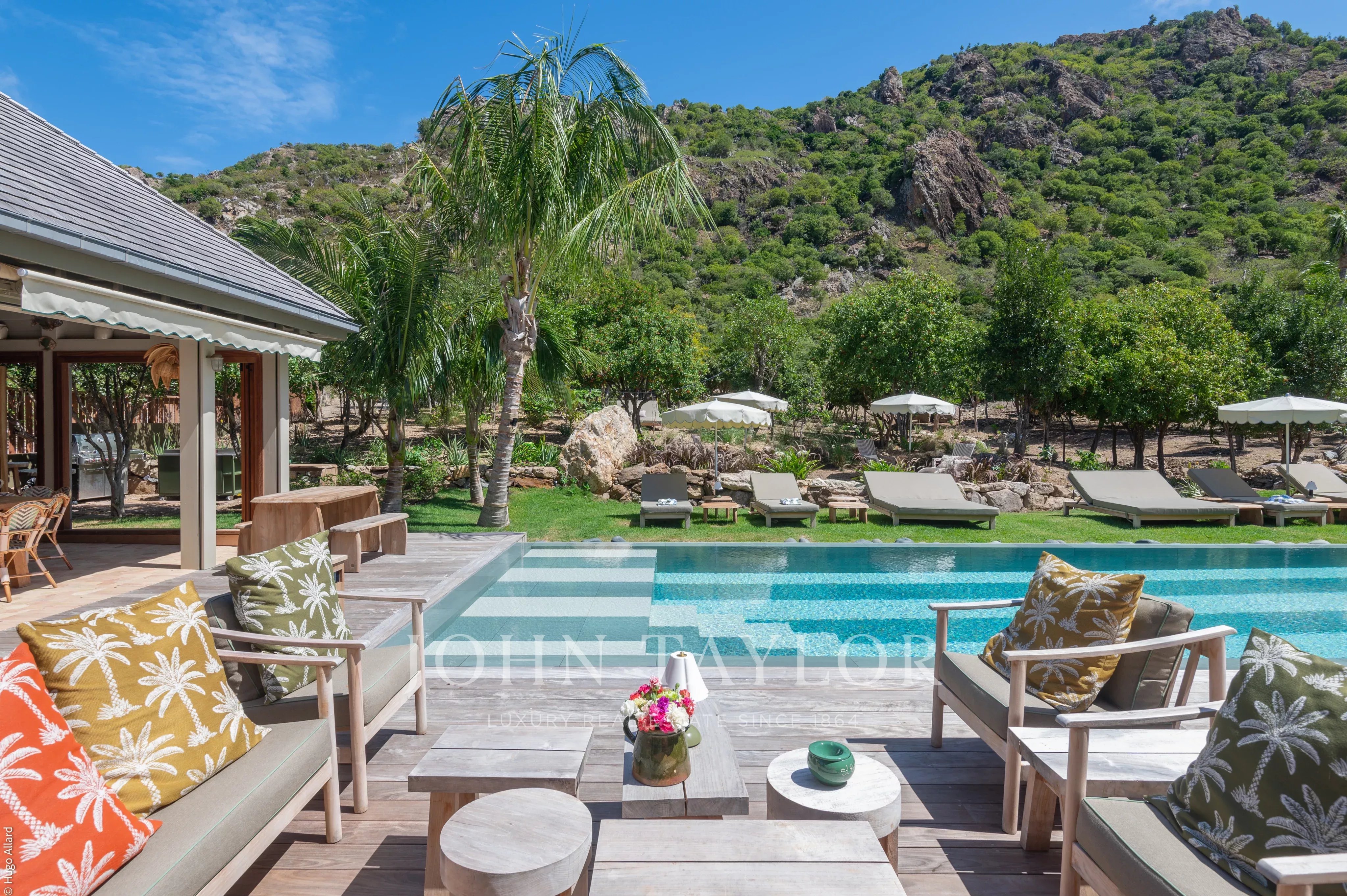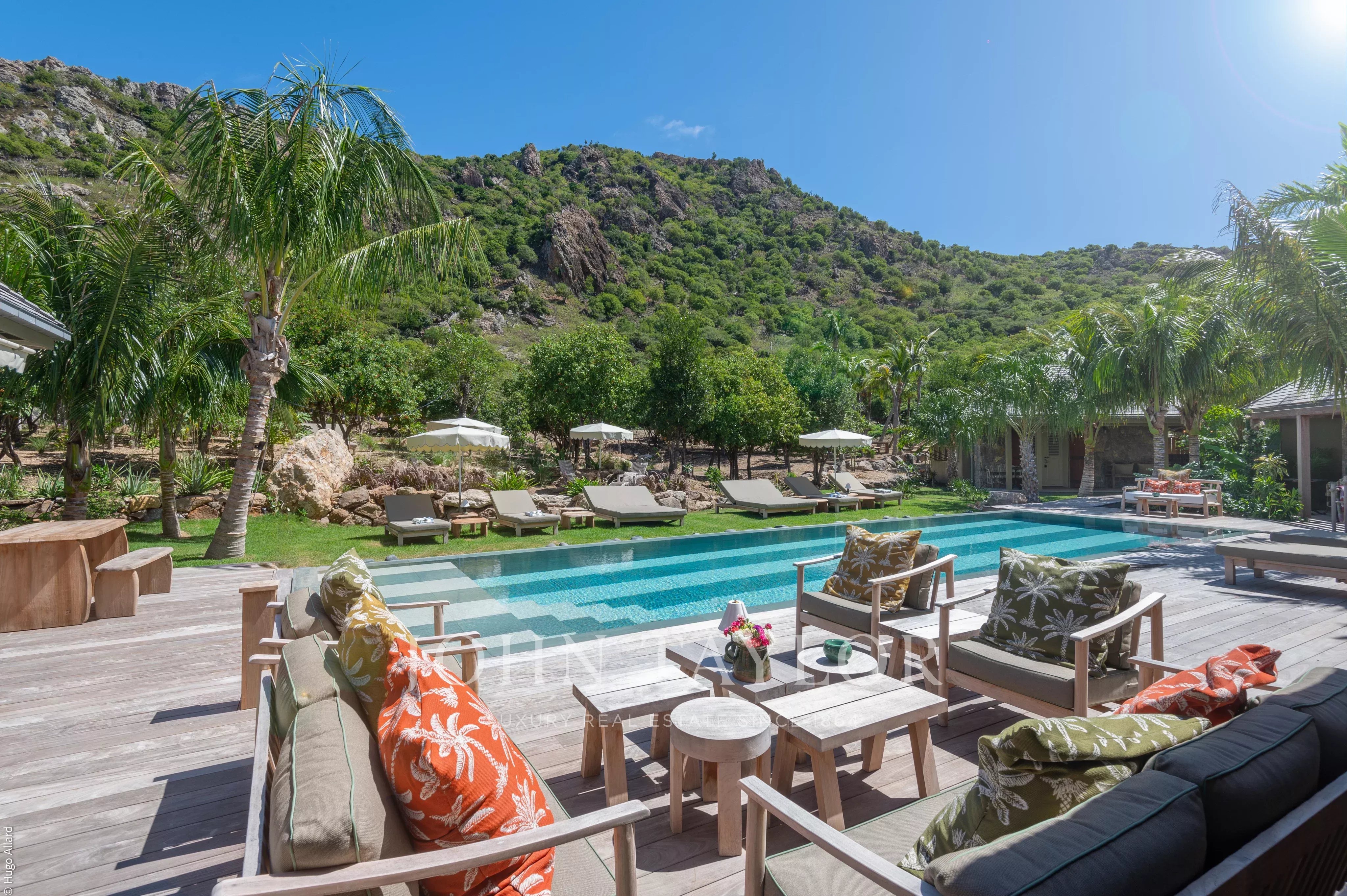 Au centre de la propriété, la terrasse avec piscine chauffée constitue un véritable lieu de vie, entourée de végétation tropicale et adossée aux reliefs verdoyants de Saline, invitant à la détente dans un cadre naturel et préservé.