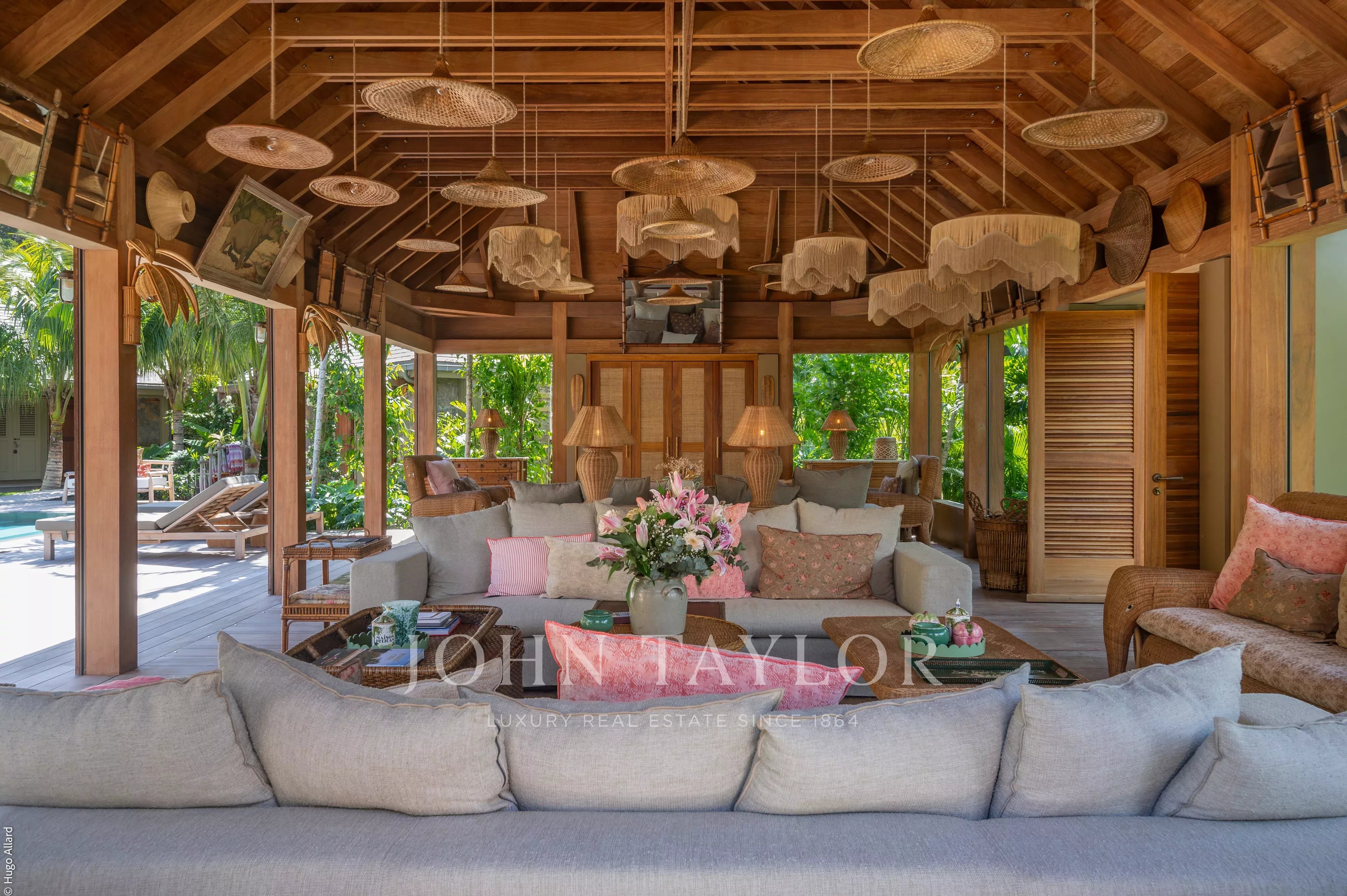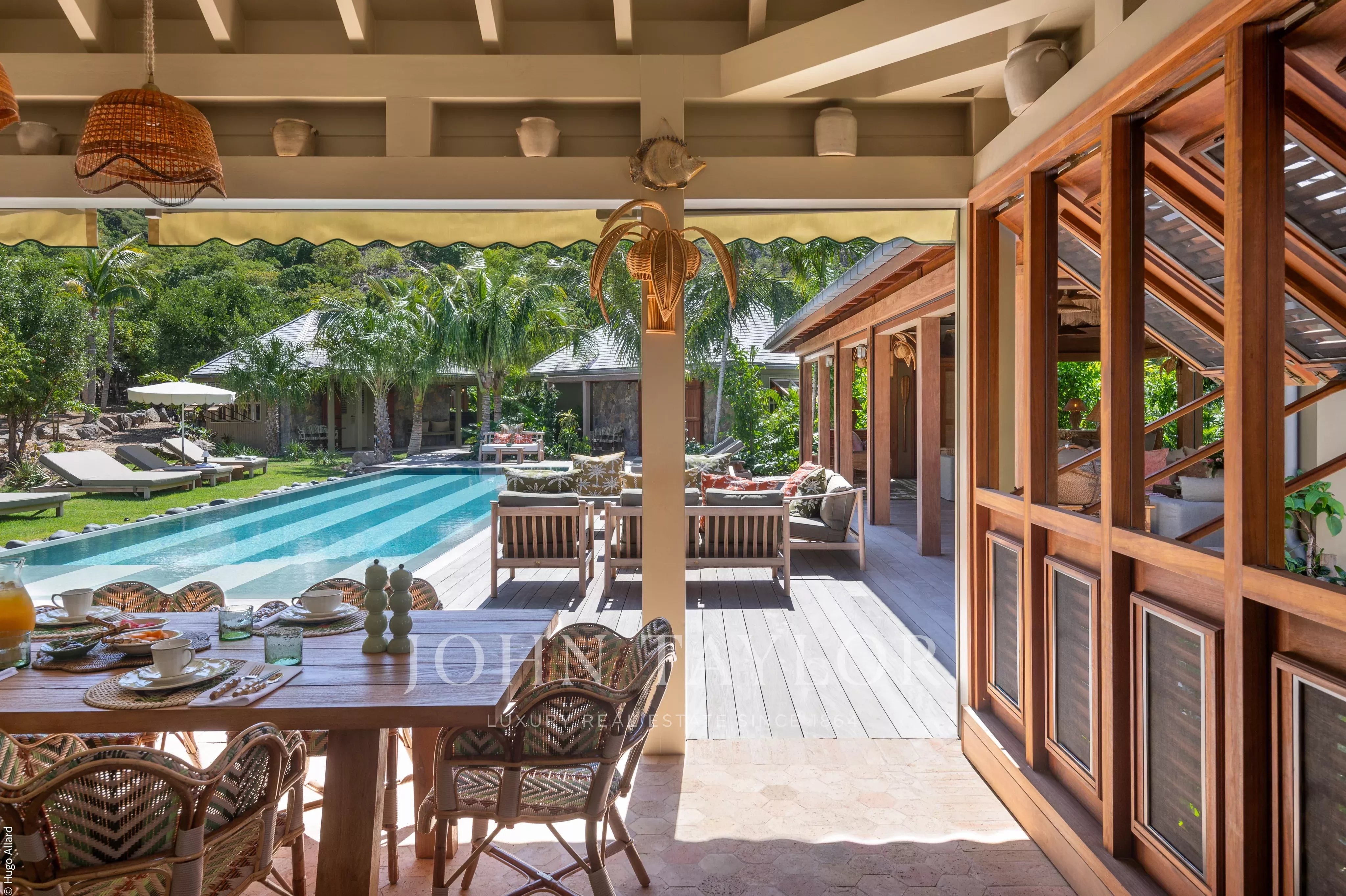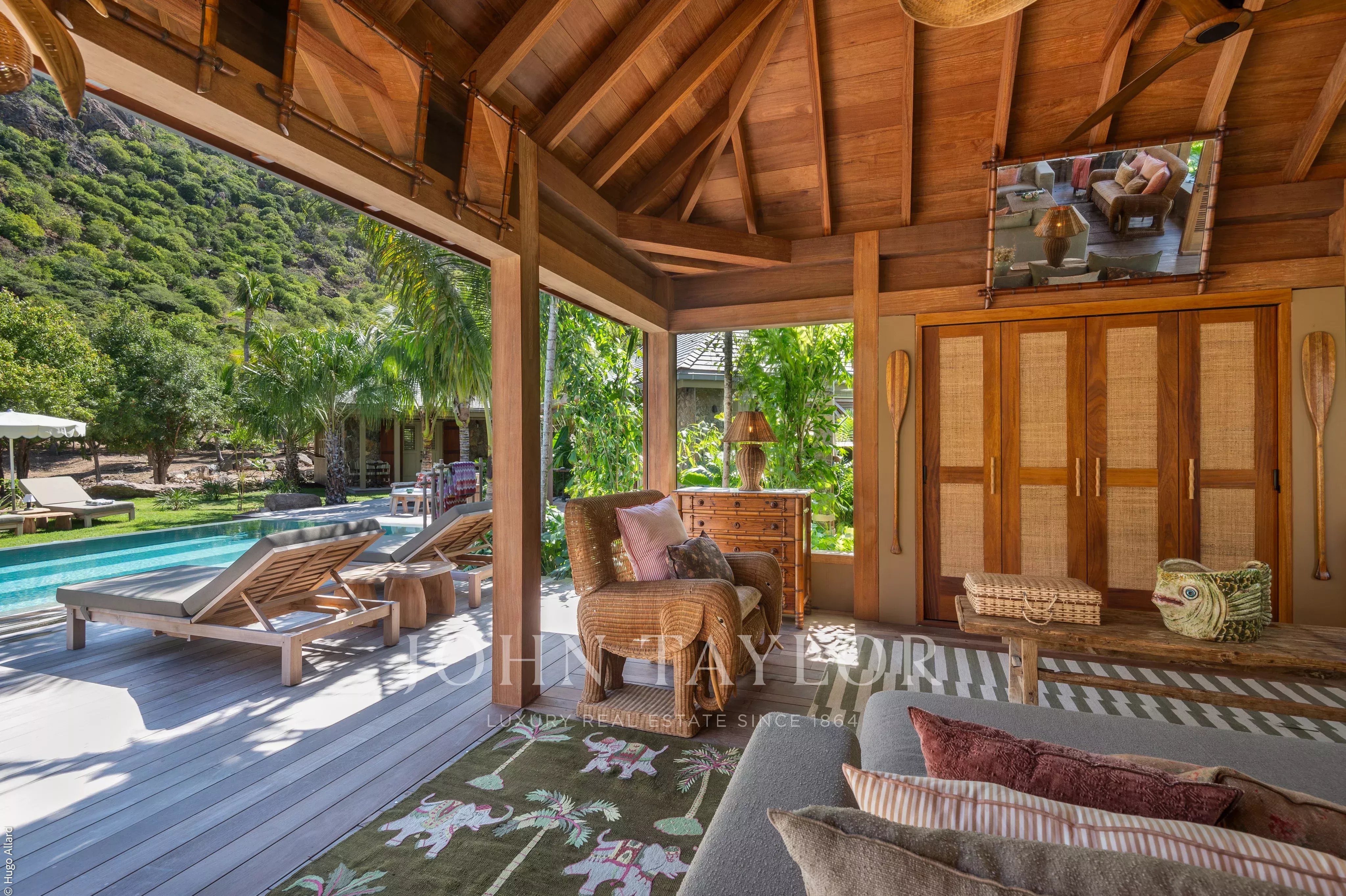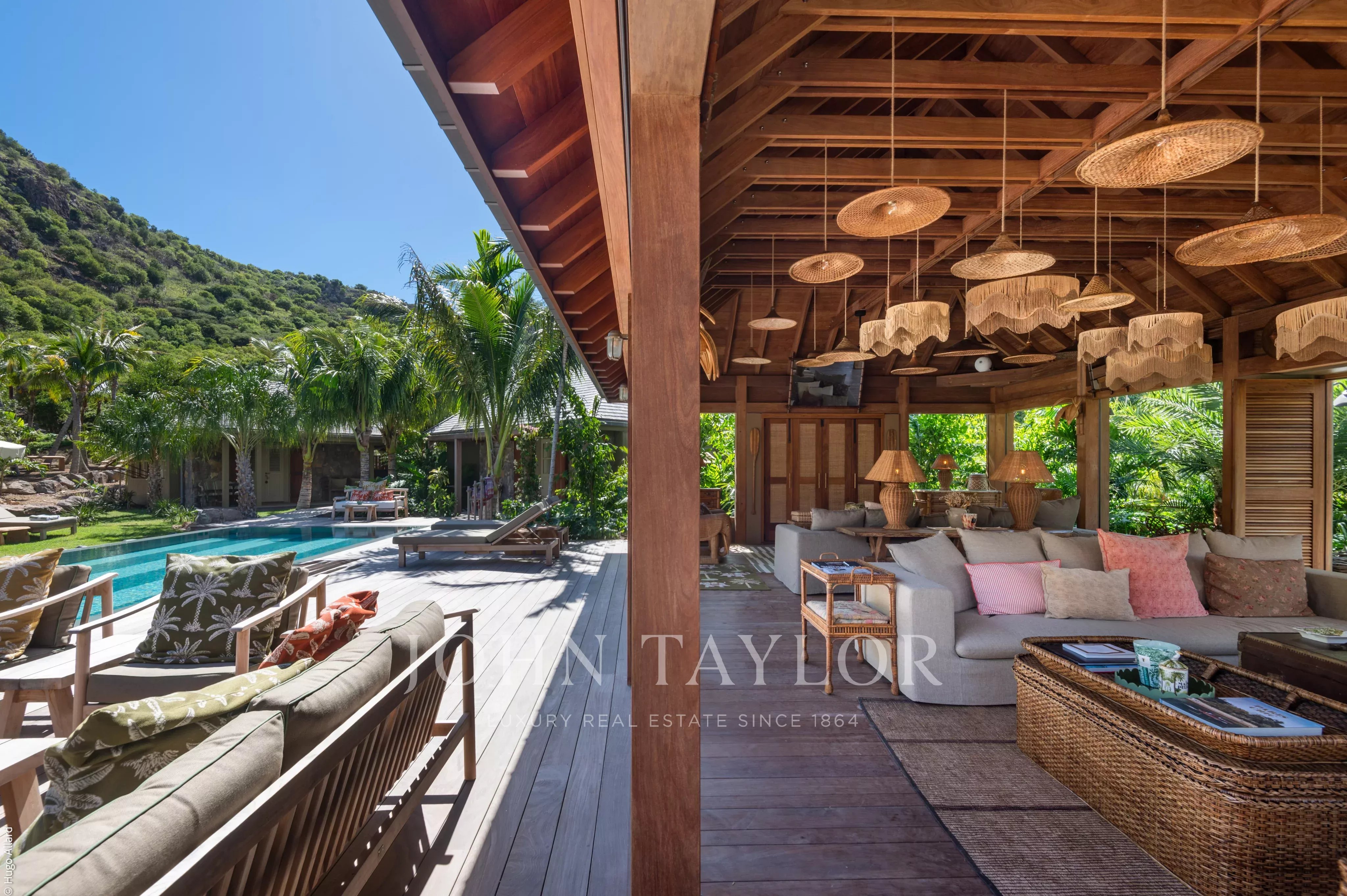 Au centre de la propriété, la terrasse avec piscine chauffée constitue un véritable lieu de vie, entourée de végétation tropicale et adossée aux reliefs verdoyants de Saline, invitant à la détente dans un cadre naturel et préservé.