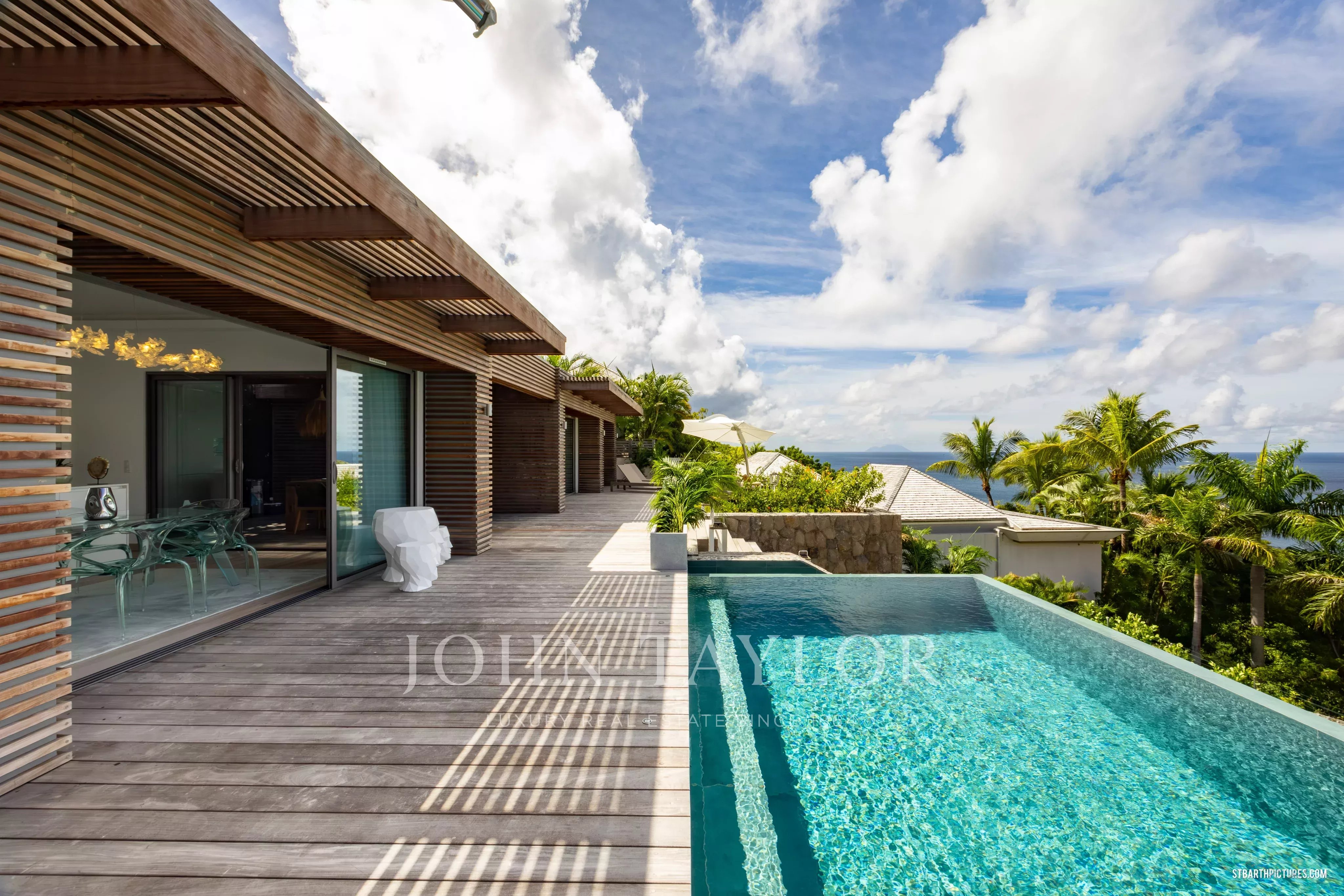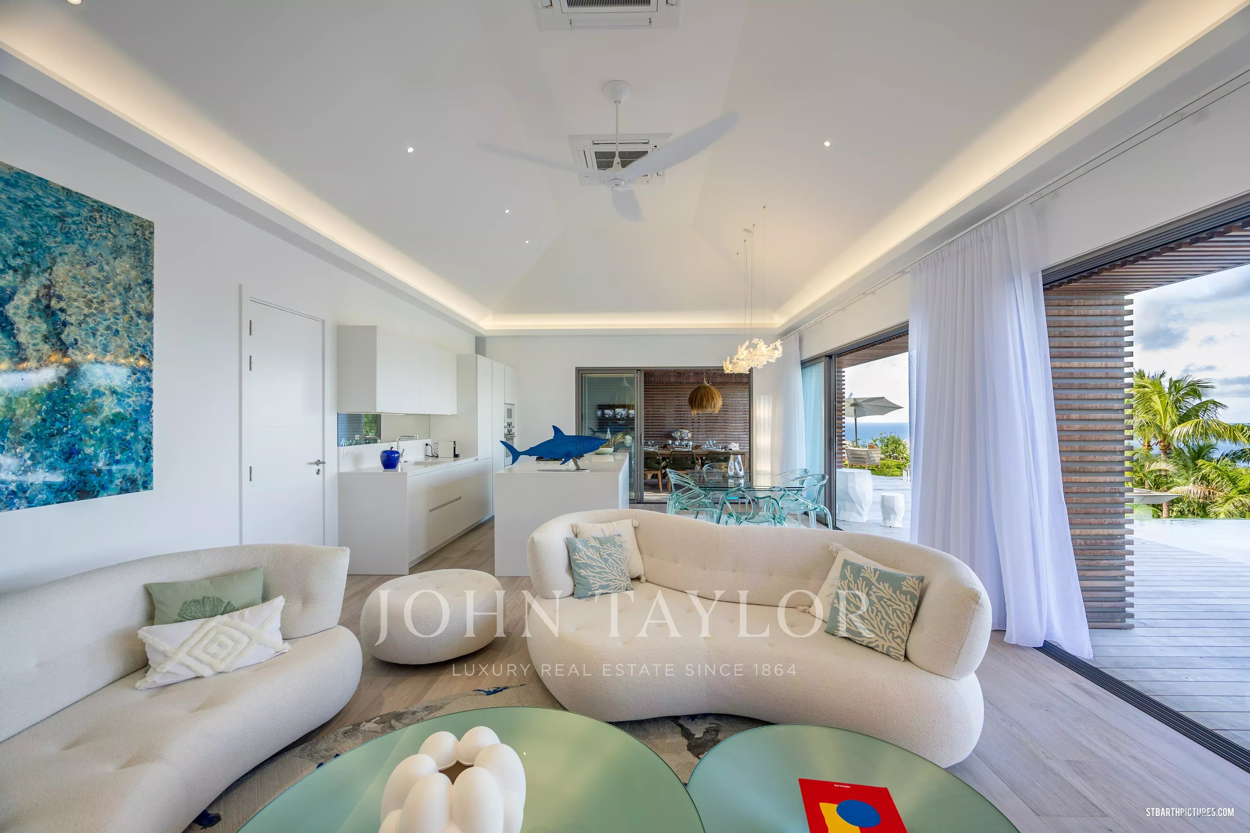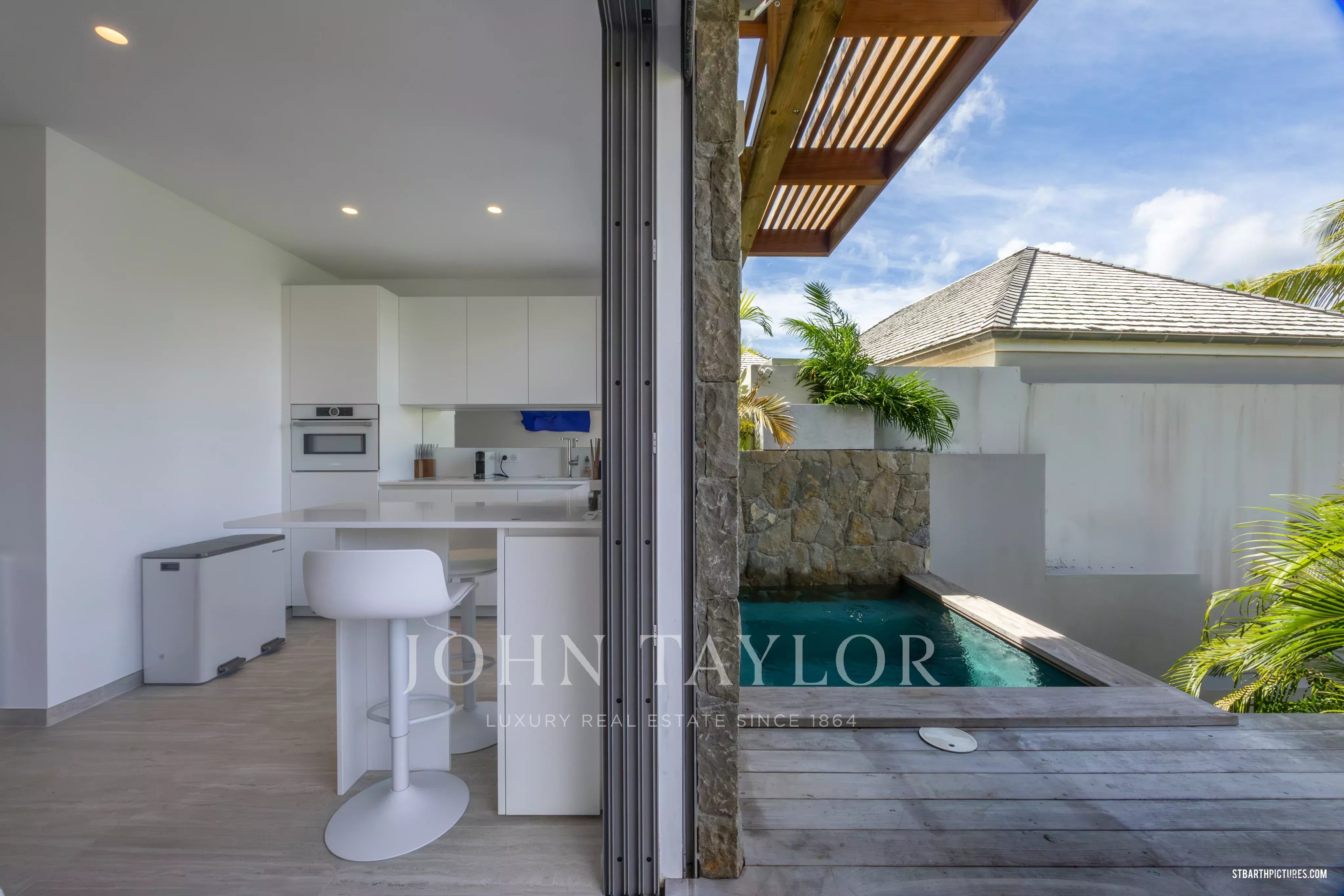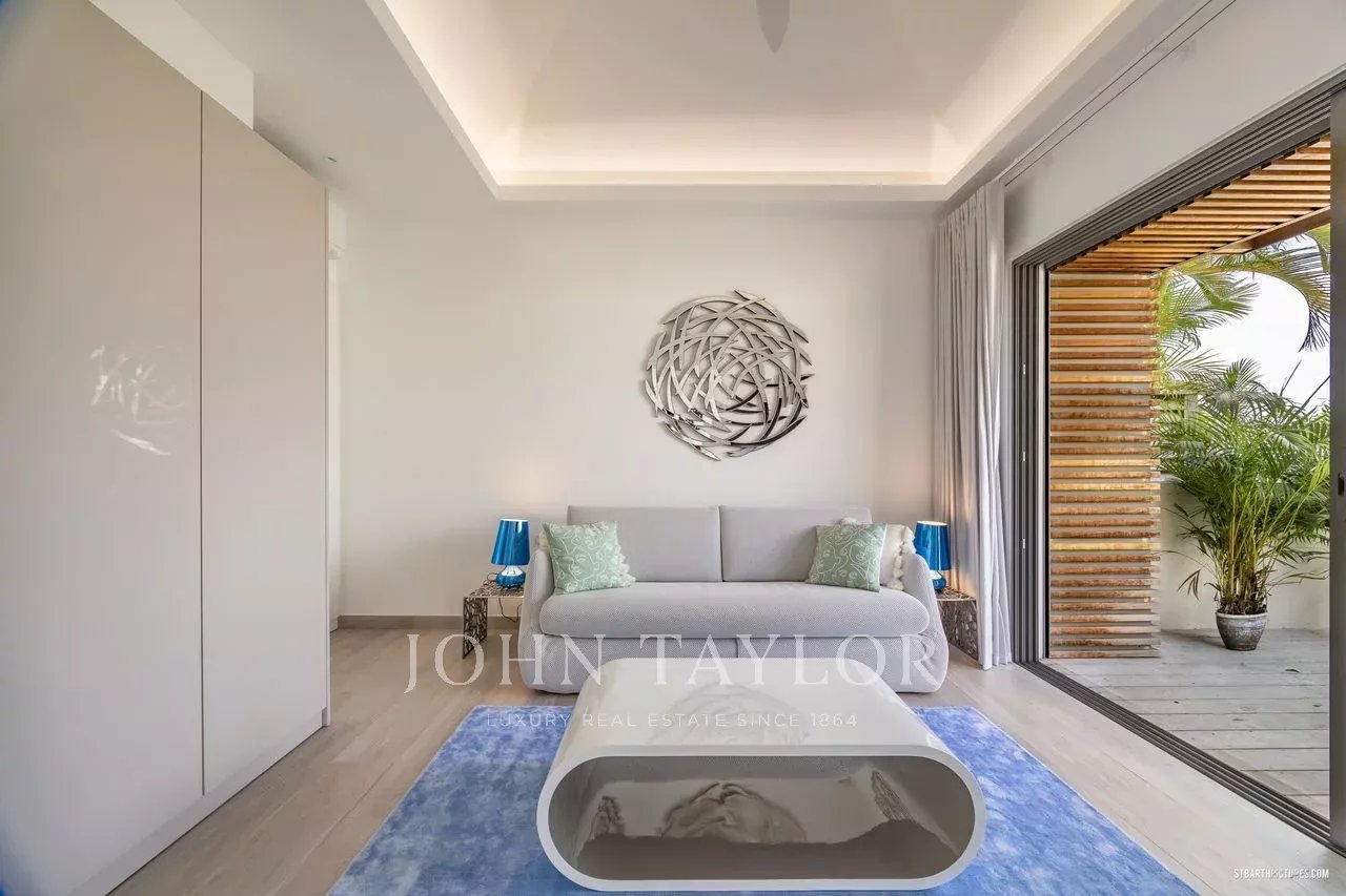 Les espaces de vie principaux se distinguent par leurs volumes généreux et leur ouverture sur l’extérieur. Le salon, la cuisine moderne entièrement équipée et la salle à manger s’articulent autour d’une vaste terrasse et d’une piscine élégante, véritable pièce maîtresse de la villa. L’ensemble invite à une vie intérieure-extérieure raffinée, typique de l’art de vivre caribéen haut de gamme.