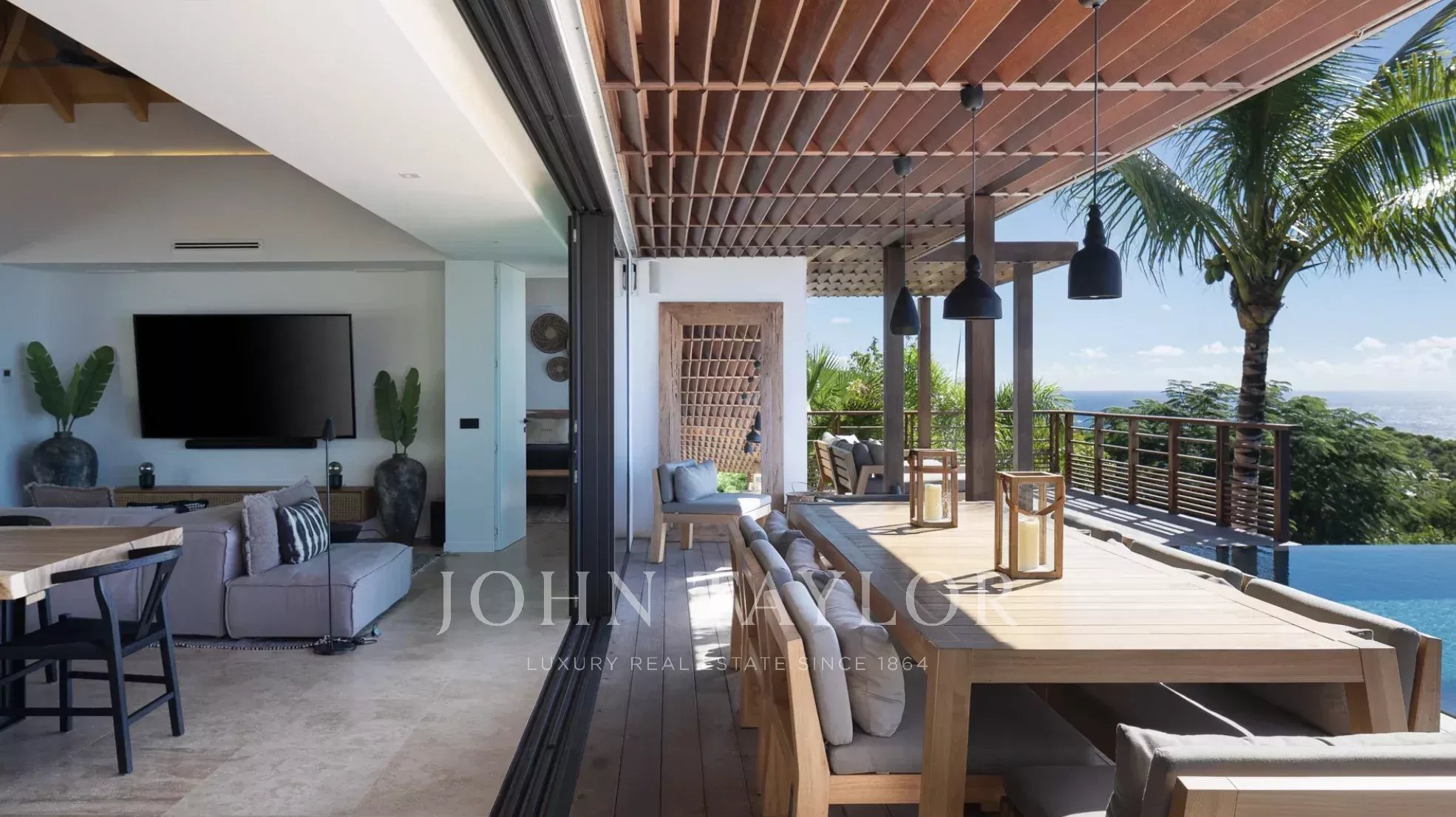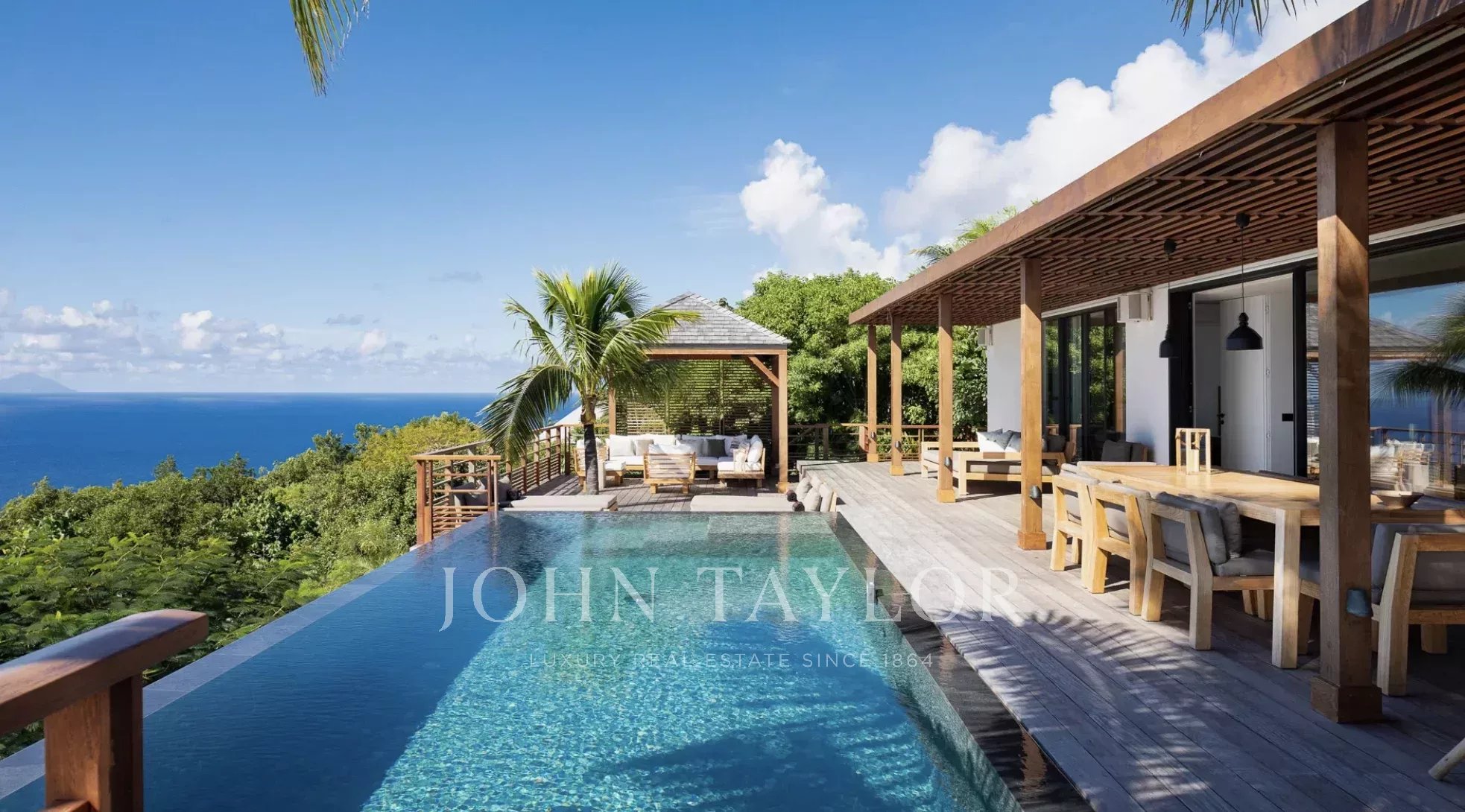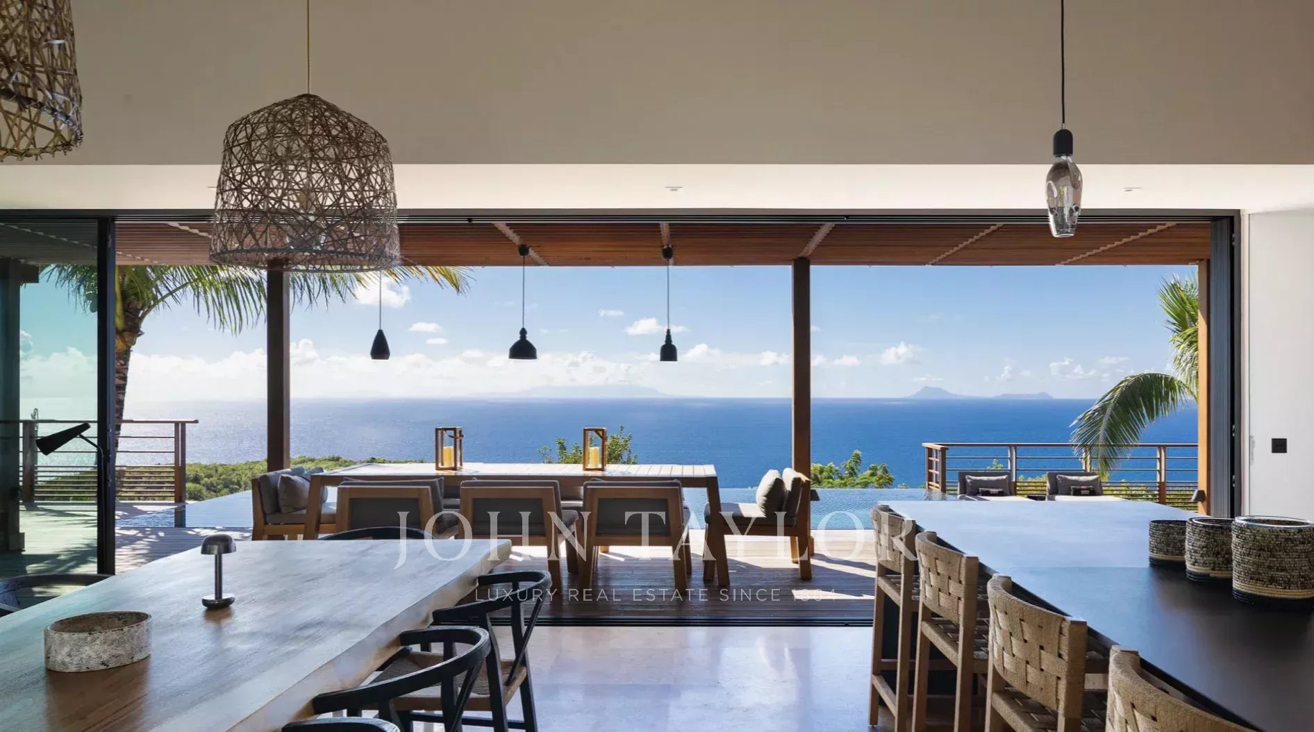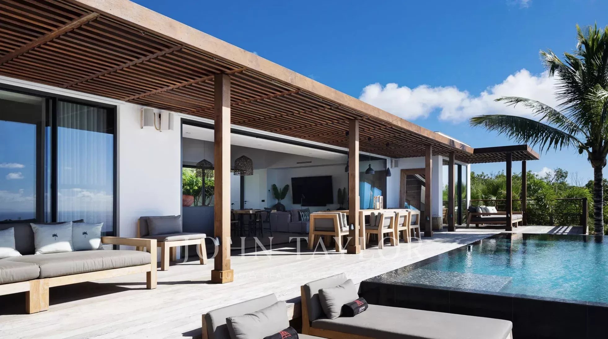 La terrasse principale est tout simplement spectaculaire, centrée autour d’une piscine à débordement qui semble se fondre dans l’horizon. Des lits de repos bordent la piscine, tandis qu’un élégant gazebo abrite un salon extérieur confortable aux coussins aux tons neutres, idéalement placé pour admirer la vue panoramique sur l’océan. Sous la partie couverte de la terrasse, une salle à manger extérieure pour huit personnes invite à de longs repas conviviaux, accompagnée de banquettes intégrées parfaites pour lire ou converser. Entouré de palmiers ondoyants et caressé par la brise marine, ce cadre idyllique incarne l’essence d’un art de vivre insulaire intemporel.