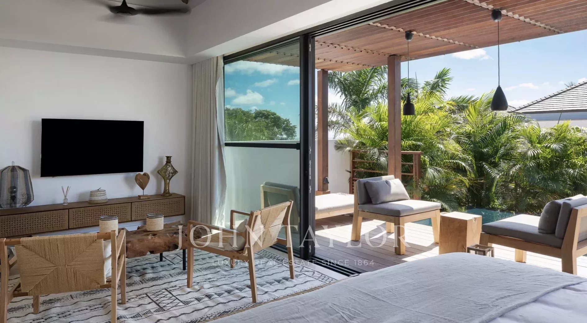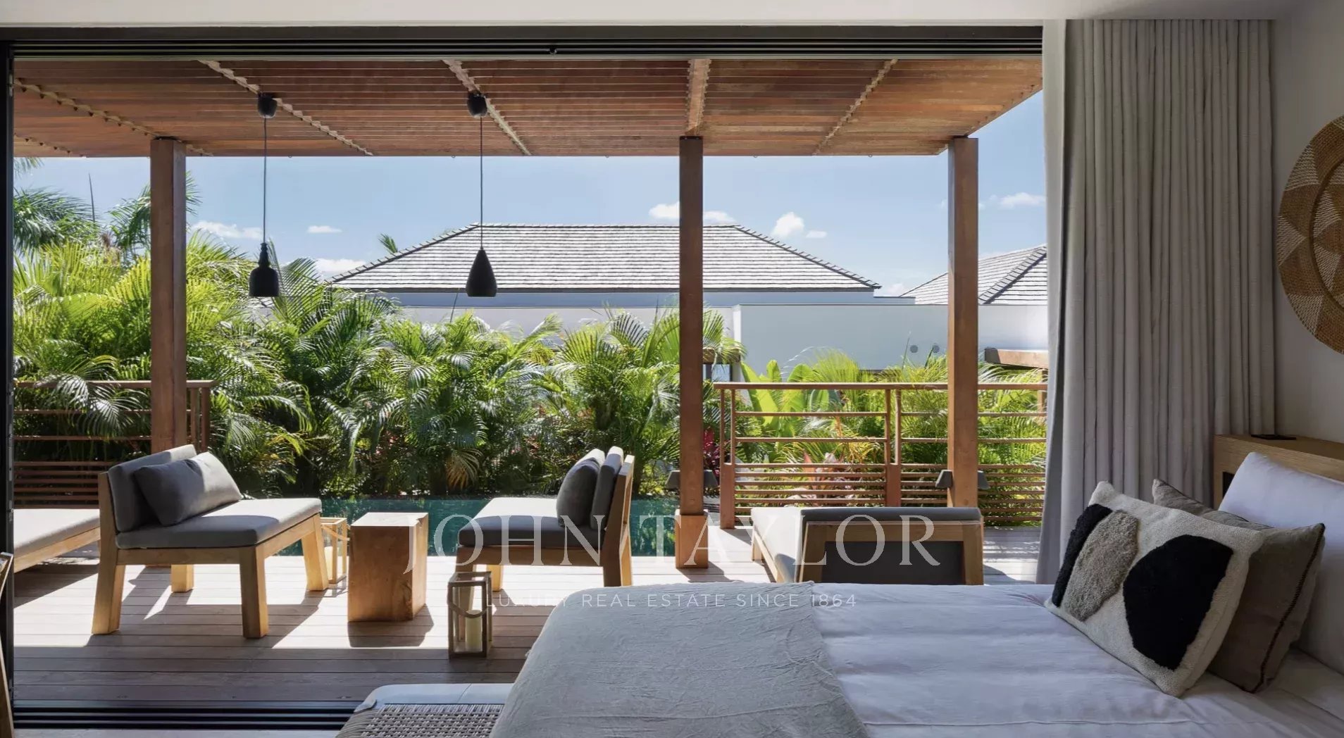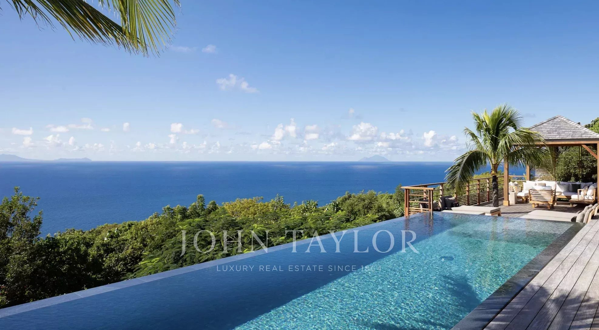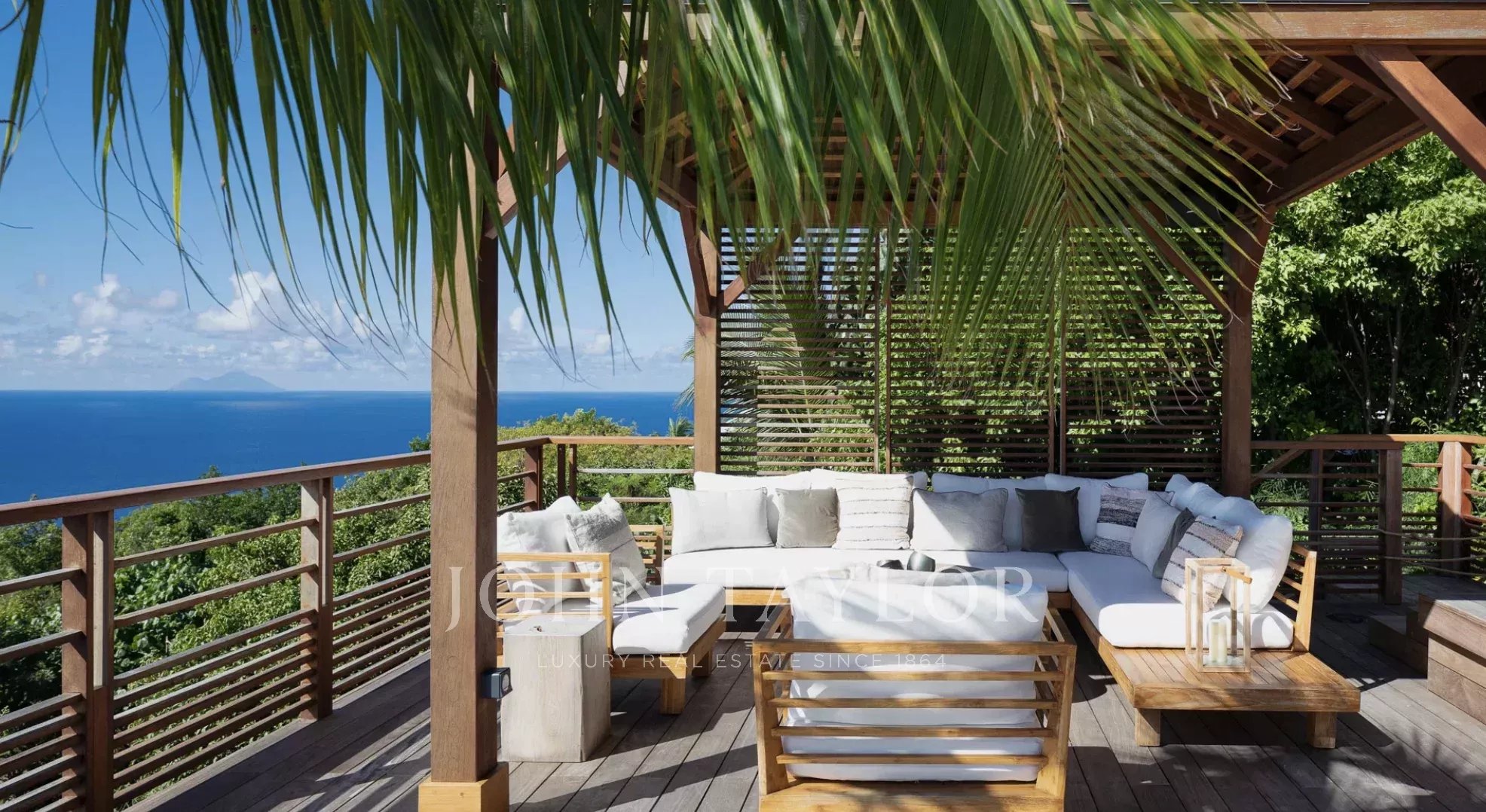 La terrasse principale est tout simplement spectaculaire, centrée autour d’une piscine à débordement qui semble se fondre dans l’horizon. Des lits de repos bordent la piscine, tandis qu’un élégant gazebo abrite un salon extérieur confortable aux coussins aux tons neutres, idéalement placé pour admirer la vue panoramique sur l’océan. Sous la partie couverte de la terrasse, une salle à manger extérieure pour huit personnes invite à de longs repas conviviaux, accompagnée de banquettes intégrées parfaites pour lire ou converser. Entouré de palmiers ondoyants et caressé par la brise marine, ce cadre idyllique incarne l’essence d’un art de vivre insulaire intemporel.