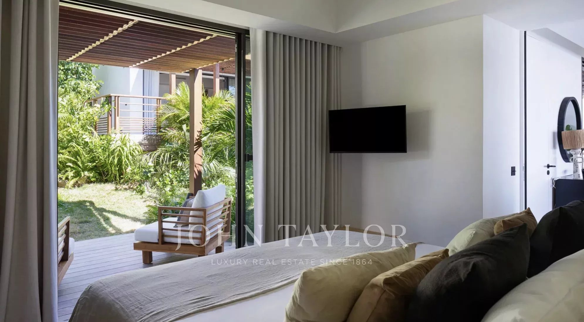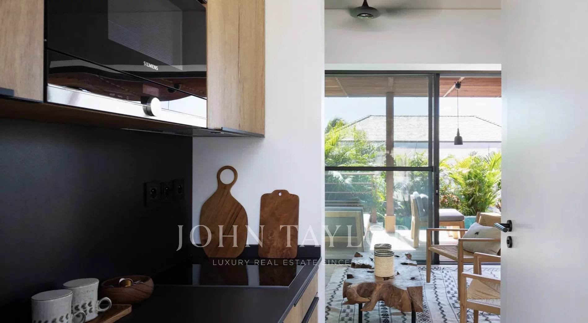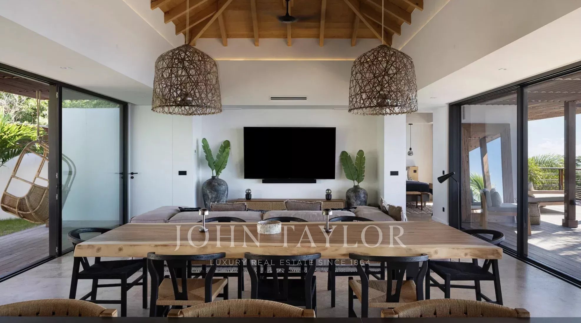 Le salon, chaleureux et accueillant, est aménagé autour d’un canapé confortable face à un grand écran, parfait pour des soirées cinéma en toute détente. À proximité, la salle à manger accueille jusqu’à huit convives autour d’une superbe table en bois massif, complétée par une cuisine entièrement équipée avec bar et espace petit-déjeuner. Les tonalités douces de bois et de taupe renforcent l’atmosphère apaisante, tandis que la lumière éclatante de l’île pénètre par les ouvertures à l’avant et à l’arrière. À l’arrière, un charmant espace engazonné avec des fauteuils suspendus offre un coin paisible pour se relaxer, bercé par les alizés des Caraïbes.