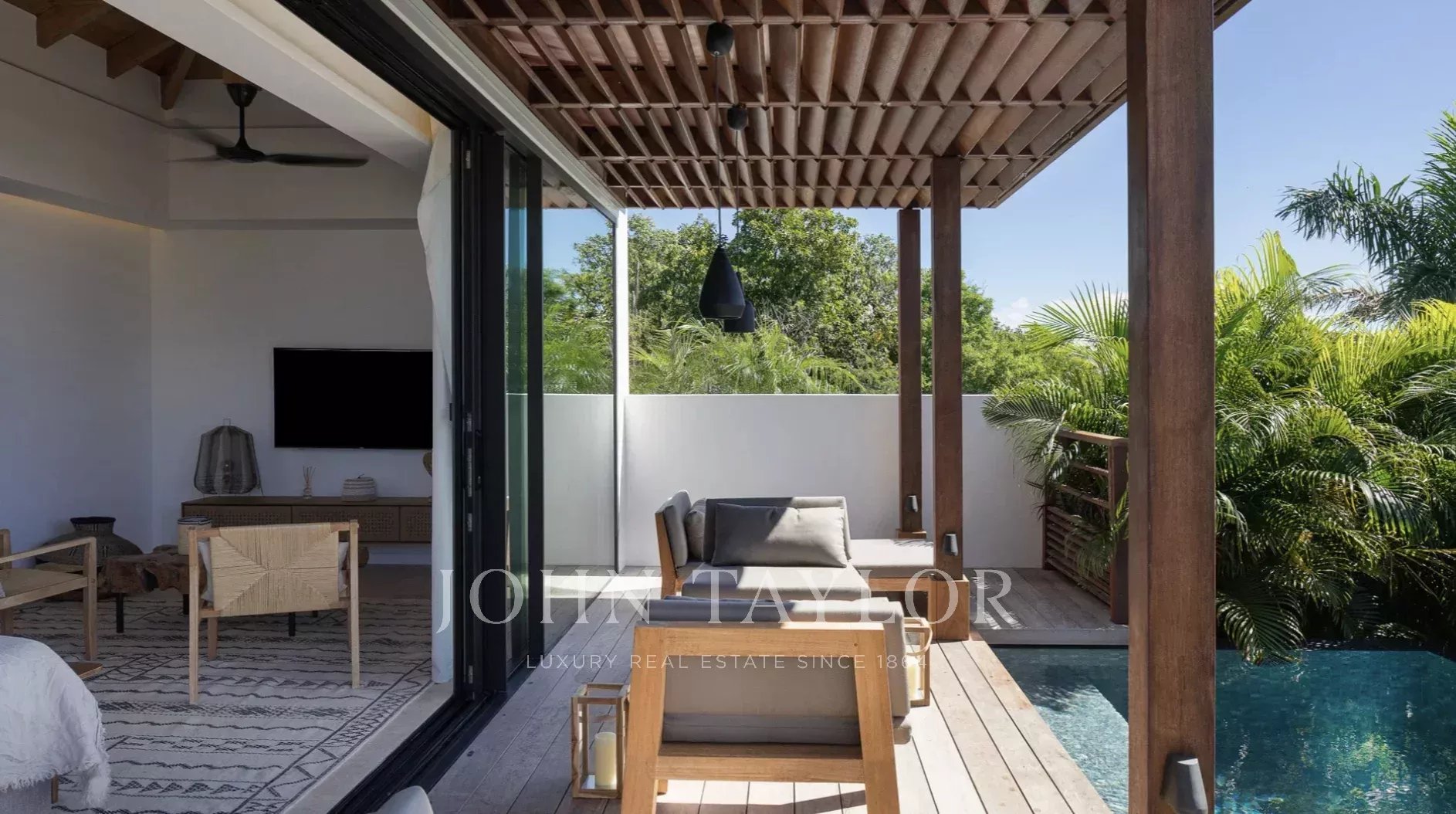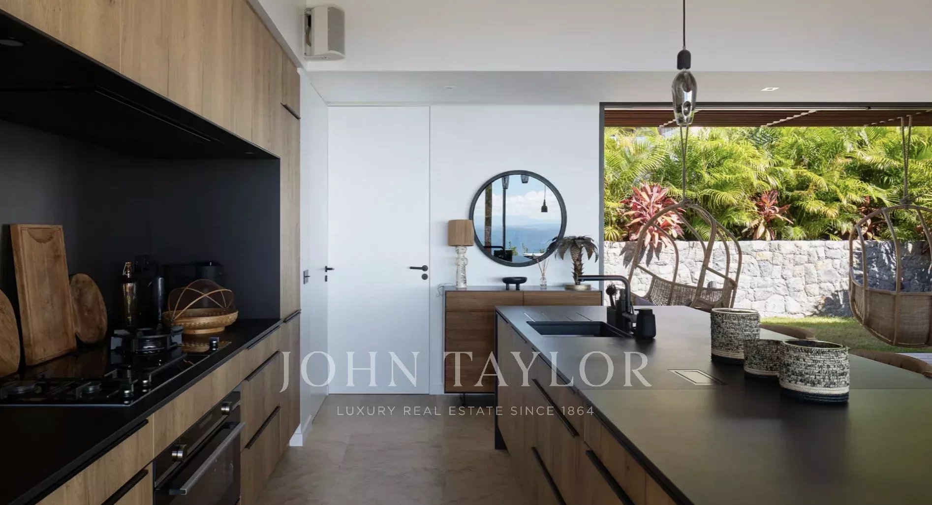 Conçue dans une esthétique contemporaine épurée, la villa s’ouvre sur de vastes espaces de vie baignés de lumière naturelle, où intérieur et extérieur se fondent harmonieusement entre panoramas marins et végétation tropicale luxuriante.