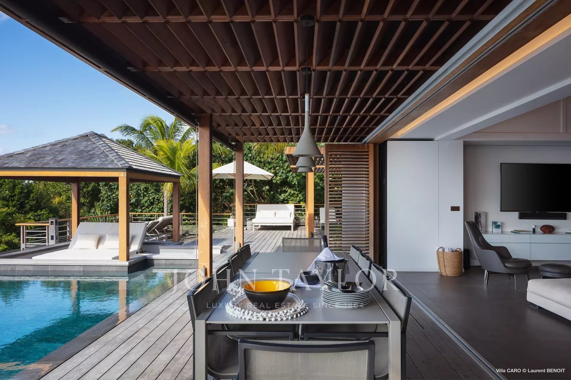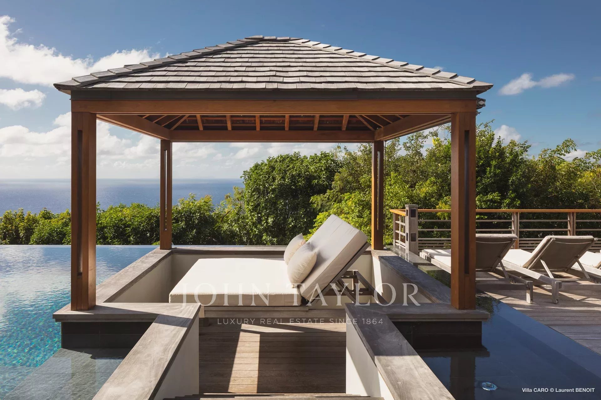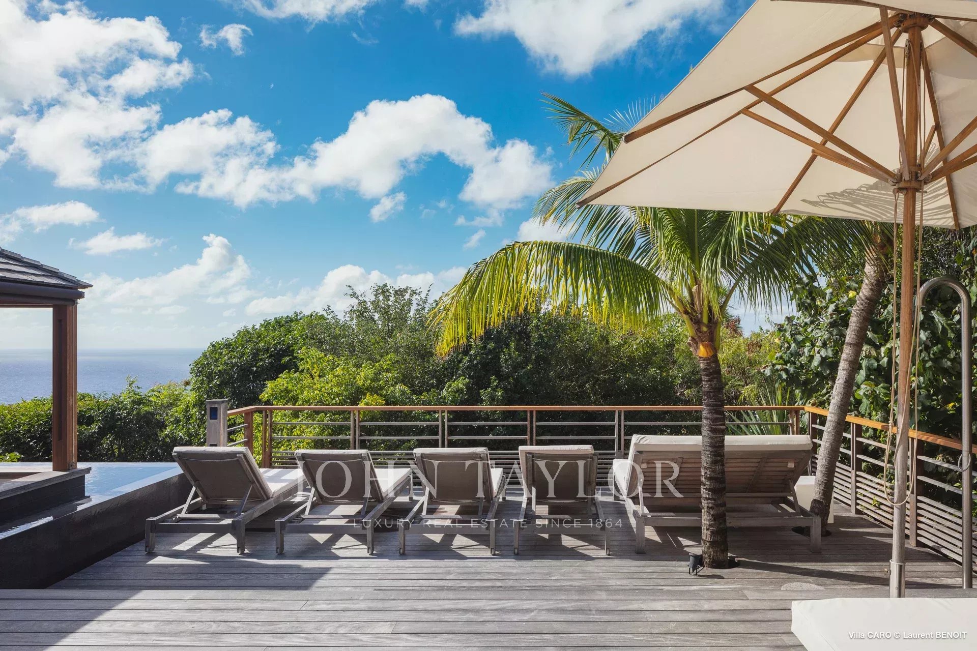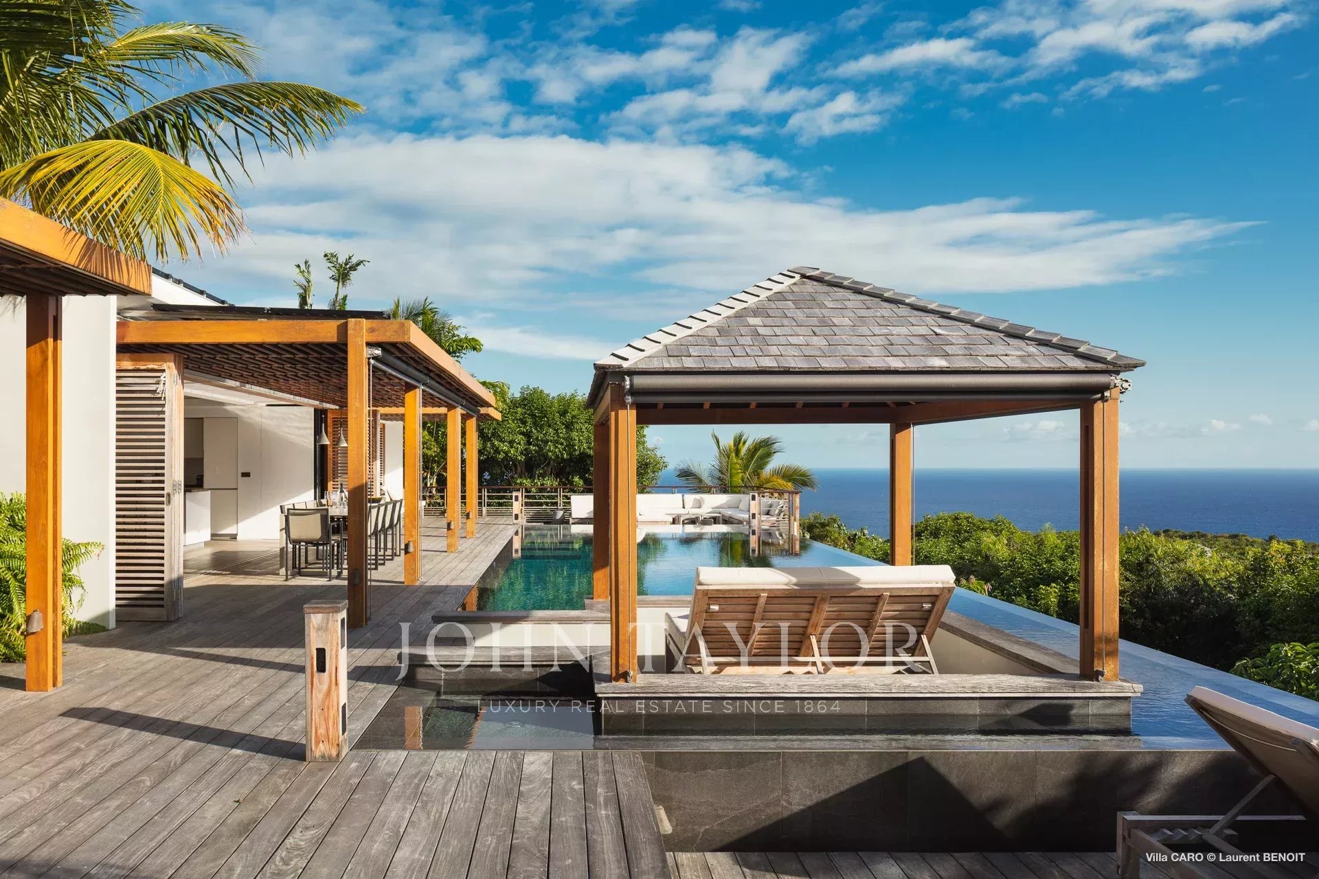 La terrasse en bois accueille une magnifique piscine chauffée à débordement, dont l’horizon se confond avec l’océan. À ses abords, une pergola aménagée d’un canapé d’angle et d’une table basse semble flotter au-dessus de l’eau scintillante. Plus loin, des transats invitent au repos et à la contemplation du panorama. De l’autre côté de la terrasse, un salon extérieur ombragé, équipé de parasols et de canapés, offre un espace privilégié pour partager des moments de convivialité. L’ensemble, entouré d’une végétation tropicale luxuriante, crée une atmosphère de sérénité et d’évasion absolue.