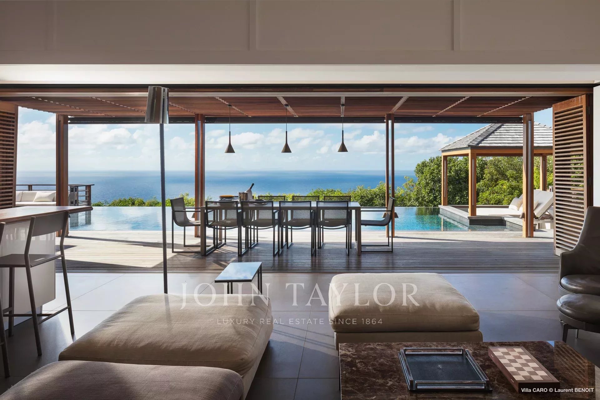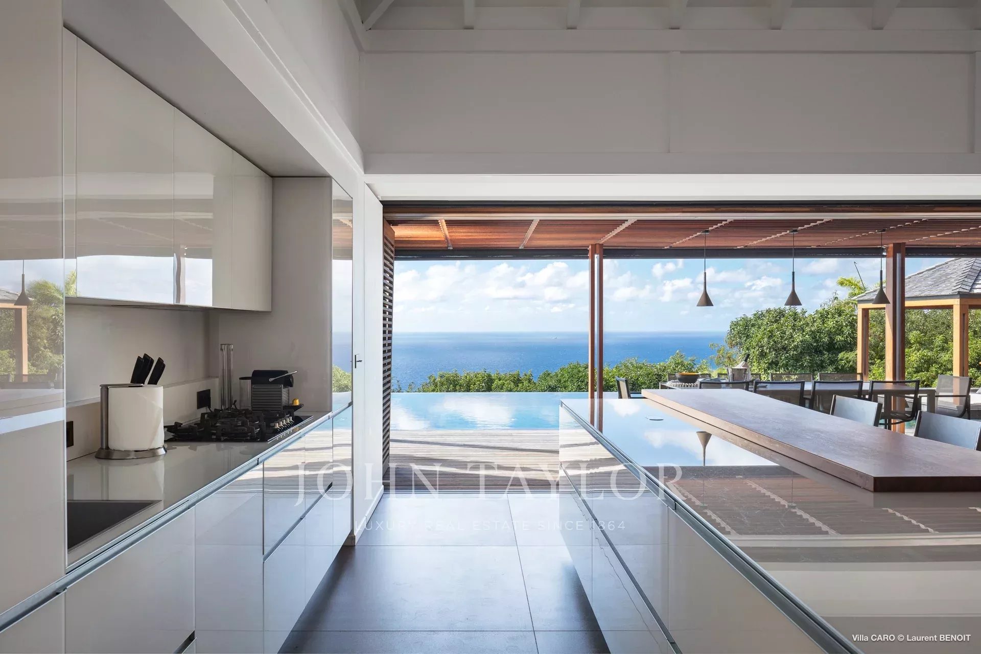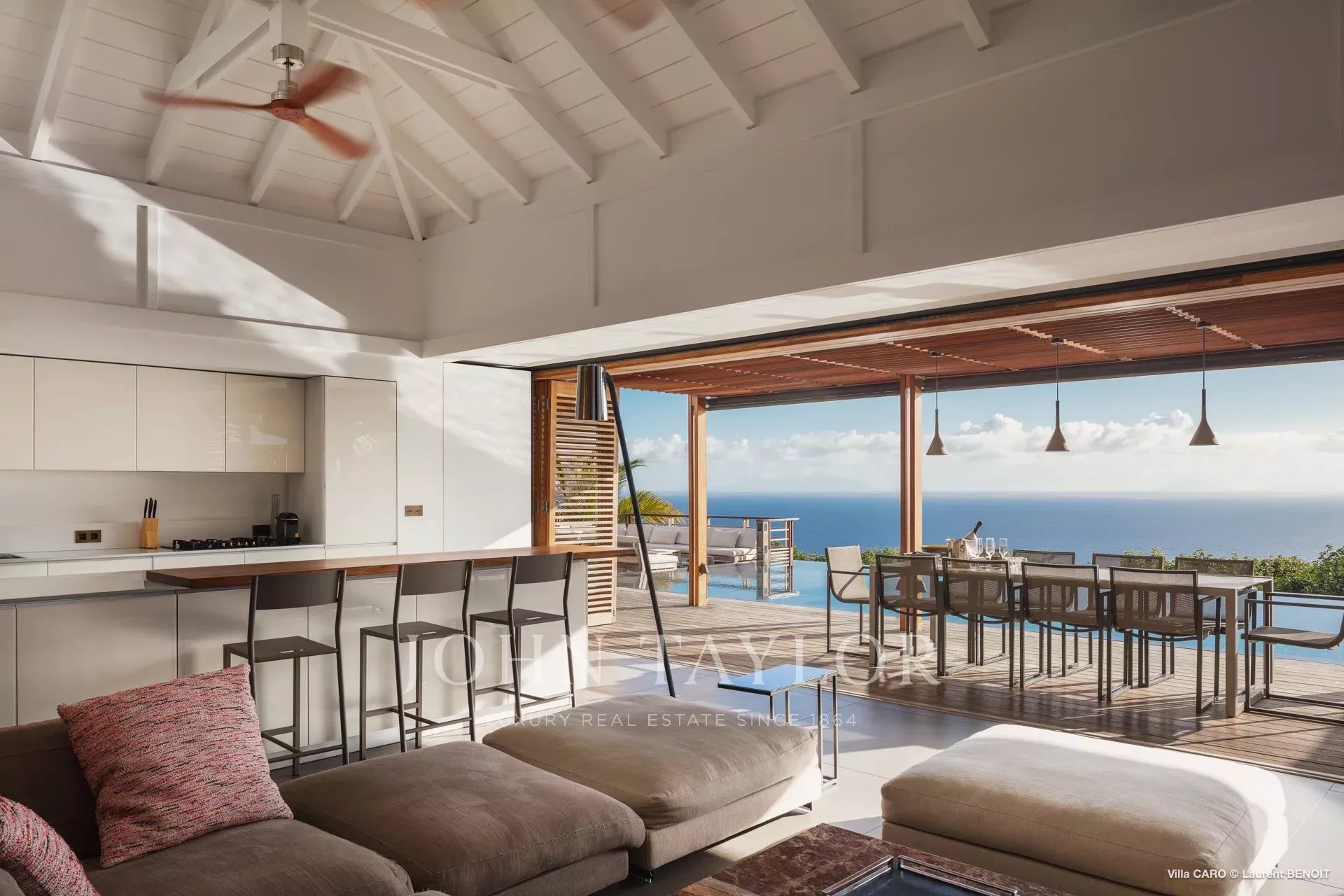 Les espaces de vie, ouverts sur l’extérieur, dévoilent des perspectives saisissantes sur la nature environnante et la mer. Le salon, aménagé avec de généreux canapés et coussins, invite à la détente et incarne parfaitement l’art de vivre à Saint-Barths. Dans une atmosphère aux lignes minérales, la cuisine entièrement équipée dispose d’un bar convivial pour le petit déjeuner et permet de préparer de délicieux repas, à compléter grâce au barbecue extérieur. Face à l’océan, la salle à manger, sublimée par de élégantes suspensions au design épuré, est dotée d’une grande table pouvant recevoir jusqu’à quatorze convives.