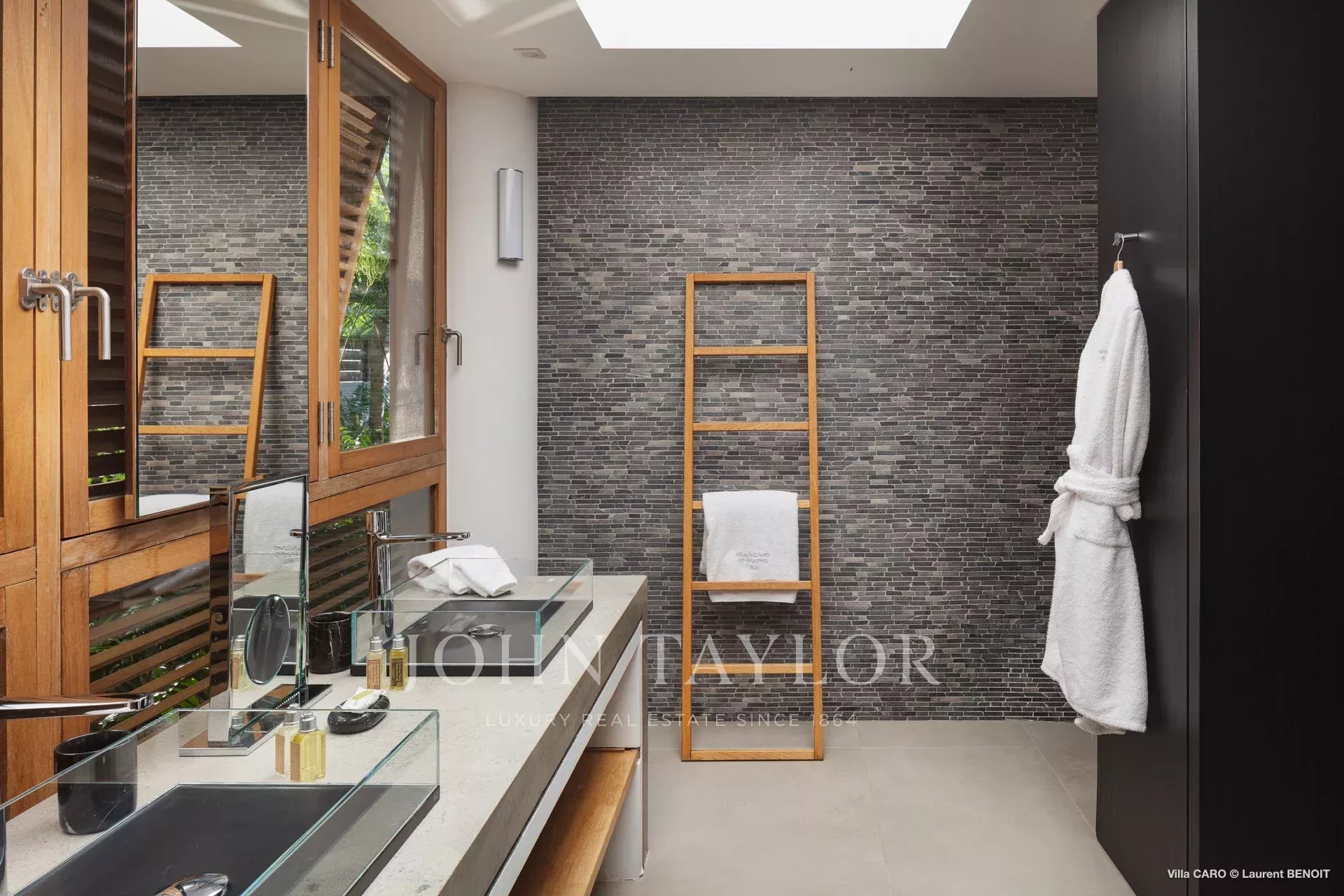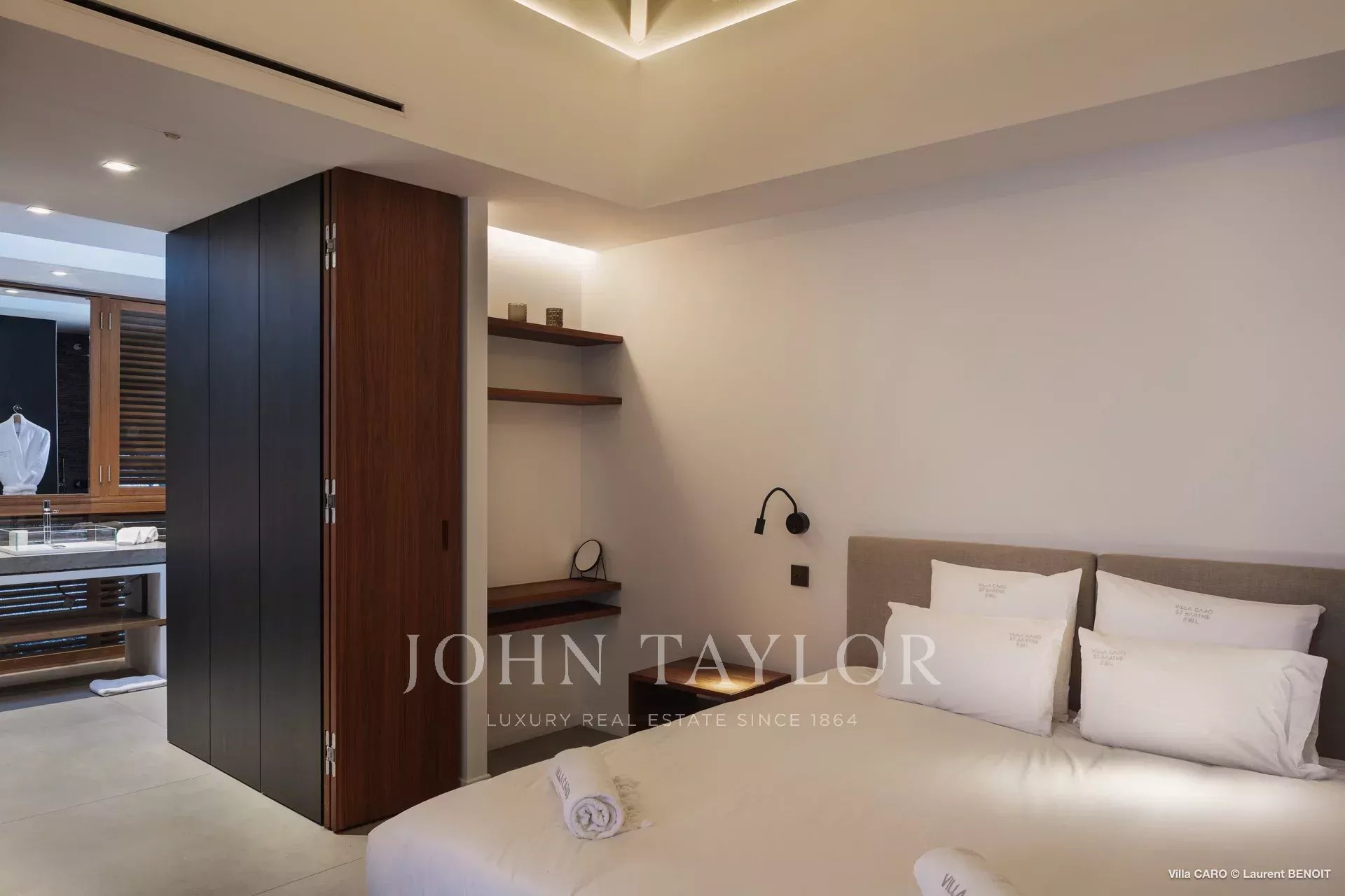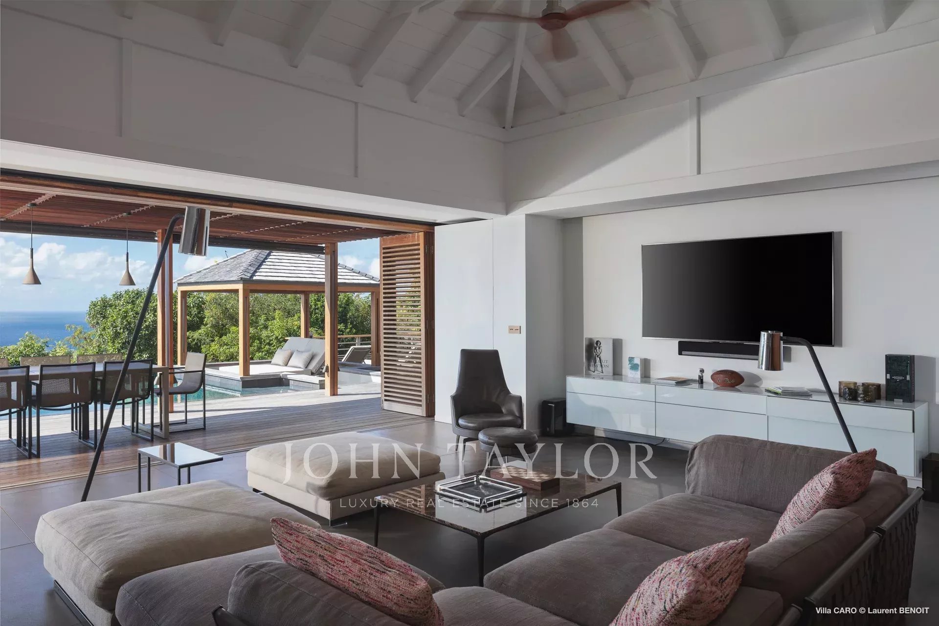 Les espaces de vie, ouverts sur l’extérieur, dévoilent des perspectives saisissantes sur la nature environnante et la mer. Le salon, aménagé avec de généreux canapés et coussins, invite à la détente et incarne parfaitement l’art de vivre à Saint-Barths. Dans une atmosphère aux lignes minérales, la cuisine entièrement équipée dispose d’un bar convivial pour le petit déjeuner et permet de préparer de délicieux repas, à compléter grâce au barbecue extérieur. Face à l’océan, la salle à manger, sublimée par de élégantes suspensions au design épuré, est dotée d’une grande table pouvant recevoir jusqu’à quatorze convives.