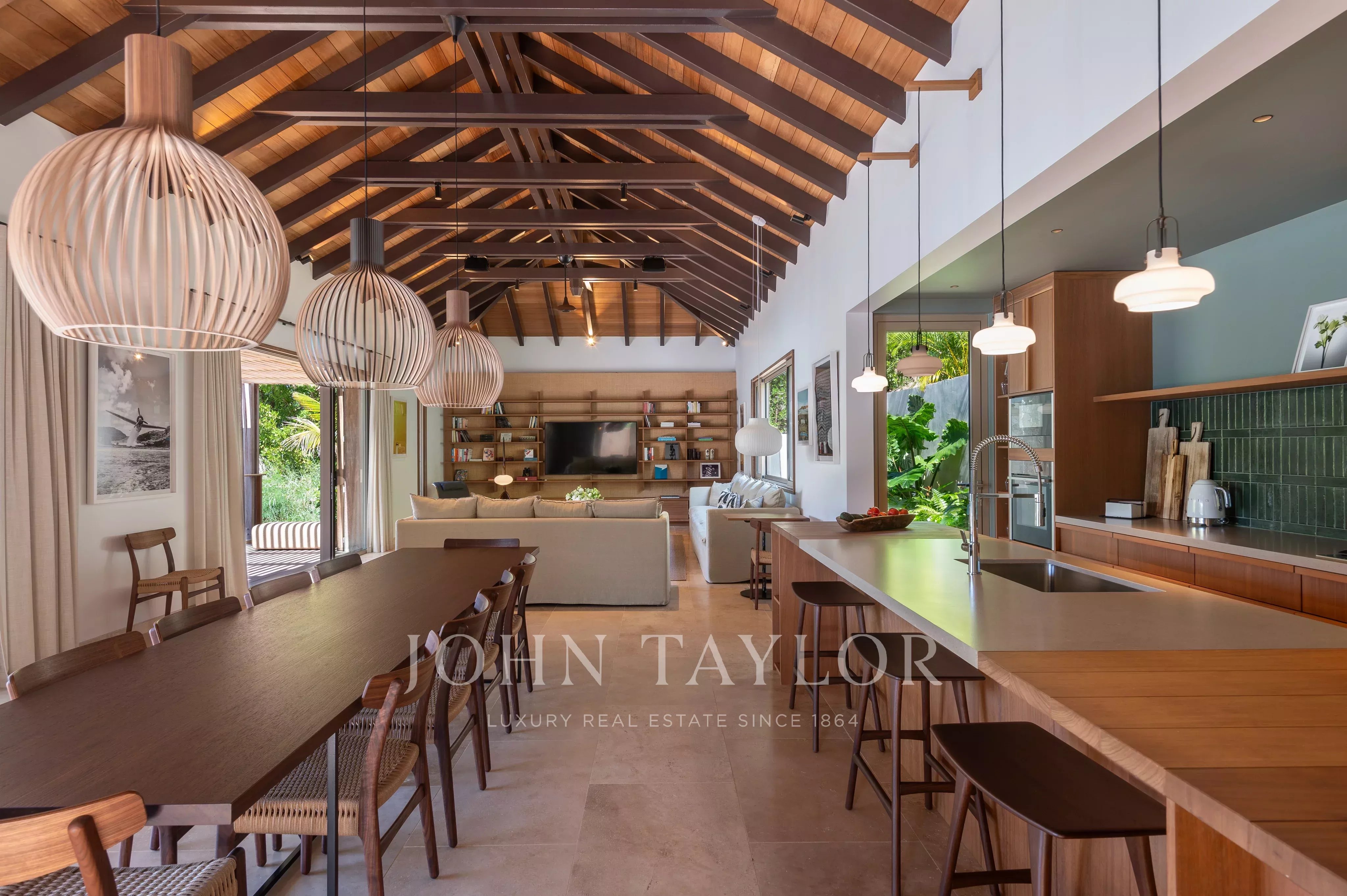 Alliant architecture moderne et inspiration insulaire, la Villa LINDA incarne un raffinement discret. Le vaste espace de vie, sublimé par des poutres apparentes et des tonalités naturelles et douces, s’ouvre avec fluidité sur la terrasse et la piscine à débordement. La cuisine entièrement équipée et la salle à manger intérieure créent une circulation harmonieuse, idéale pour des moments conviviaux dans un cadre lumineux et ouvert.