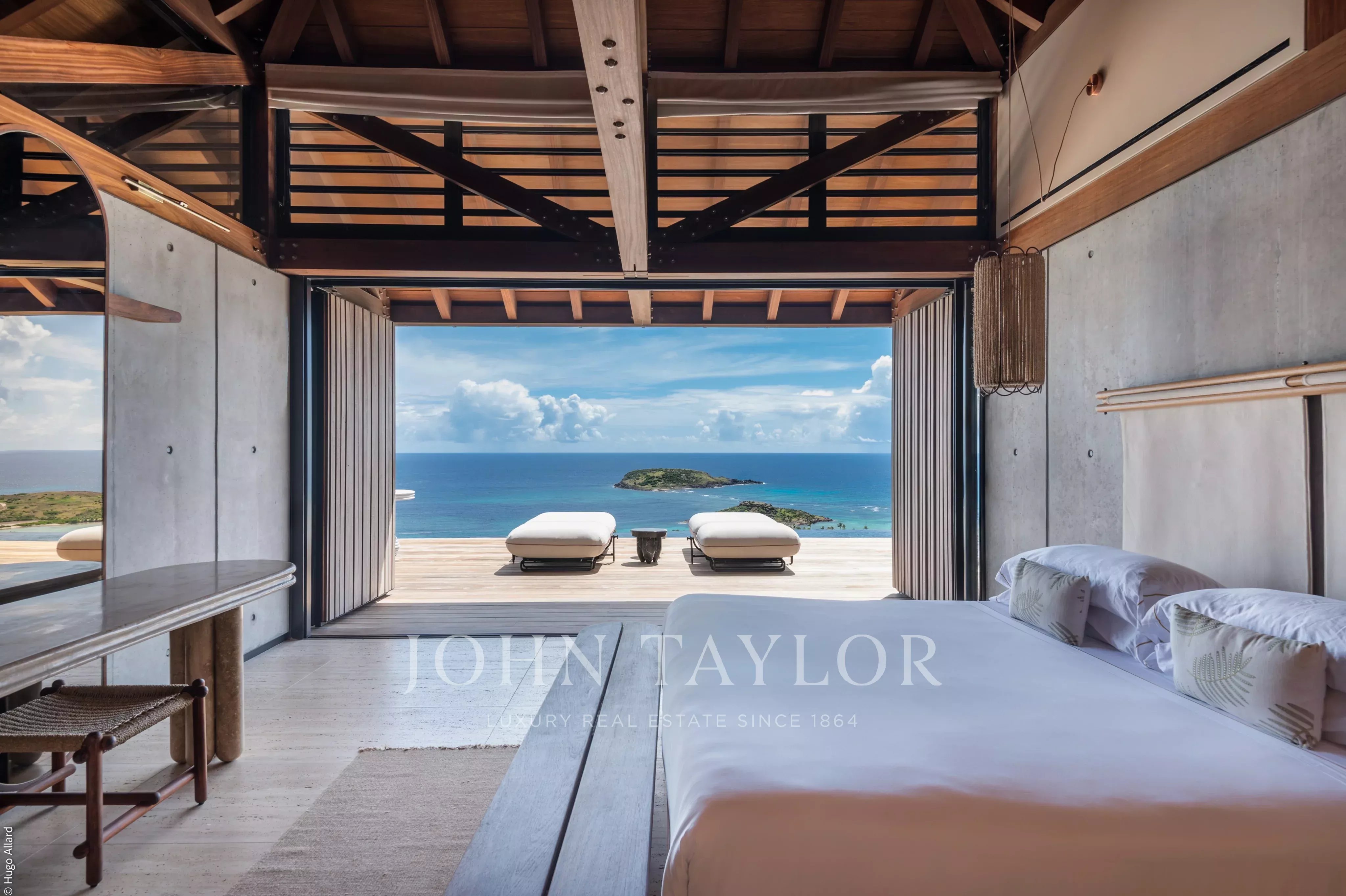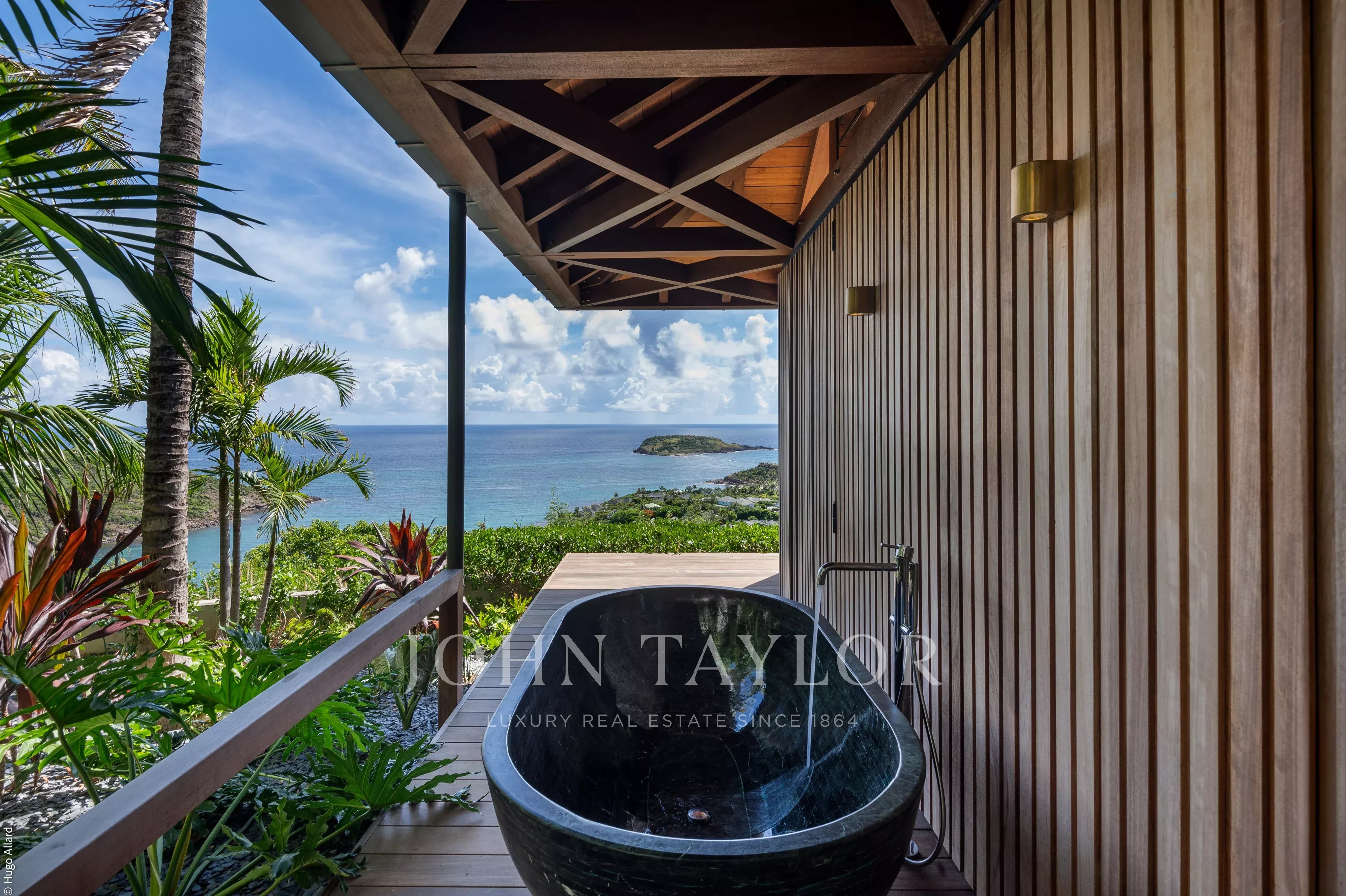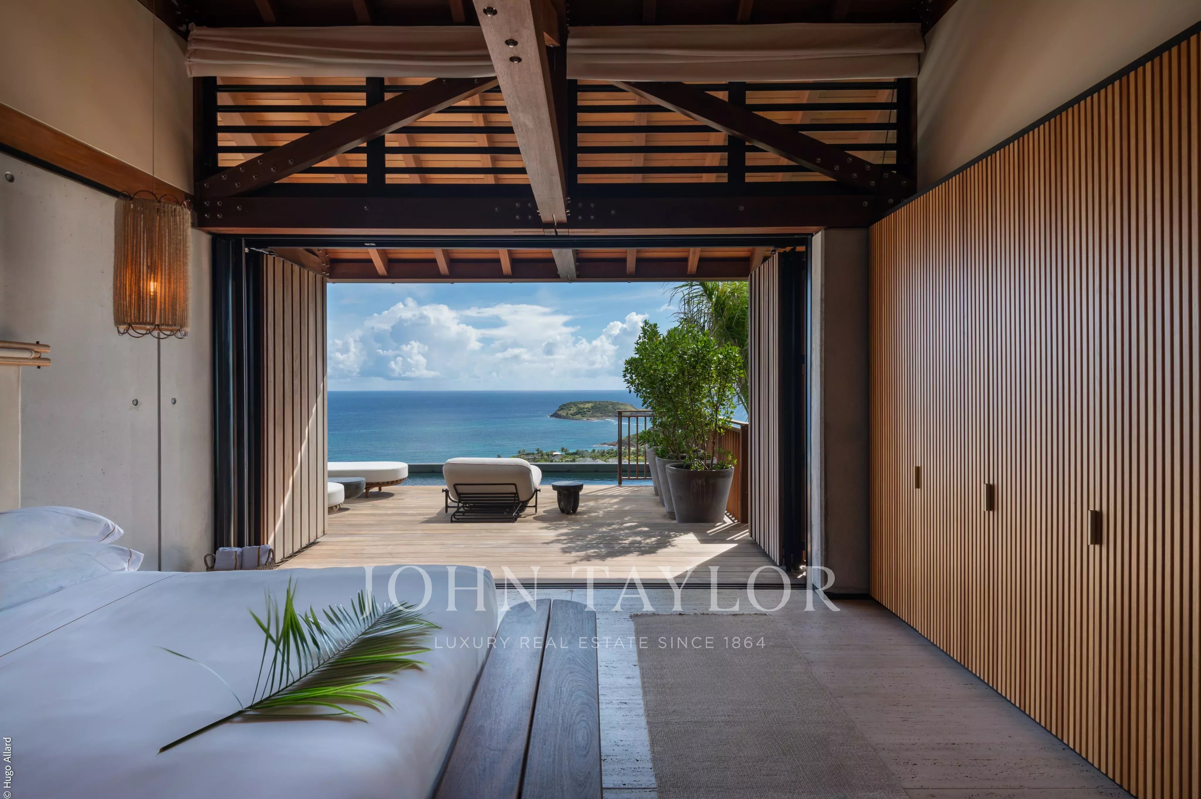 À l’extérieur, le spectacle est tout simplement grandiose. Les terrasses se déploient face au soleil des Caraïbes et aux eaux cristallines du lagon. À l’étage supérieur, une piscine de 52 mètres semble se fondre dans le paysage, bordée de fauteuils élégants tournés vers l’infini. Plus bas, une seconde piscine de 30 mètres, entourée de transats, invite à une relaxation absolue. Entre ces deux univers, un somptueux jardin japonais agrémenté d’une cascade offre une parenthèse de sérénité, bercée par le murmure de l’eau.