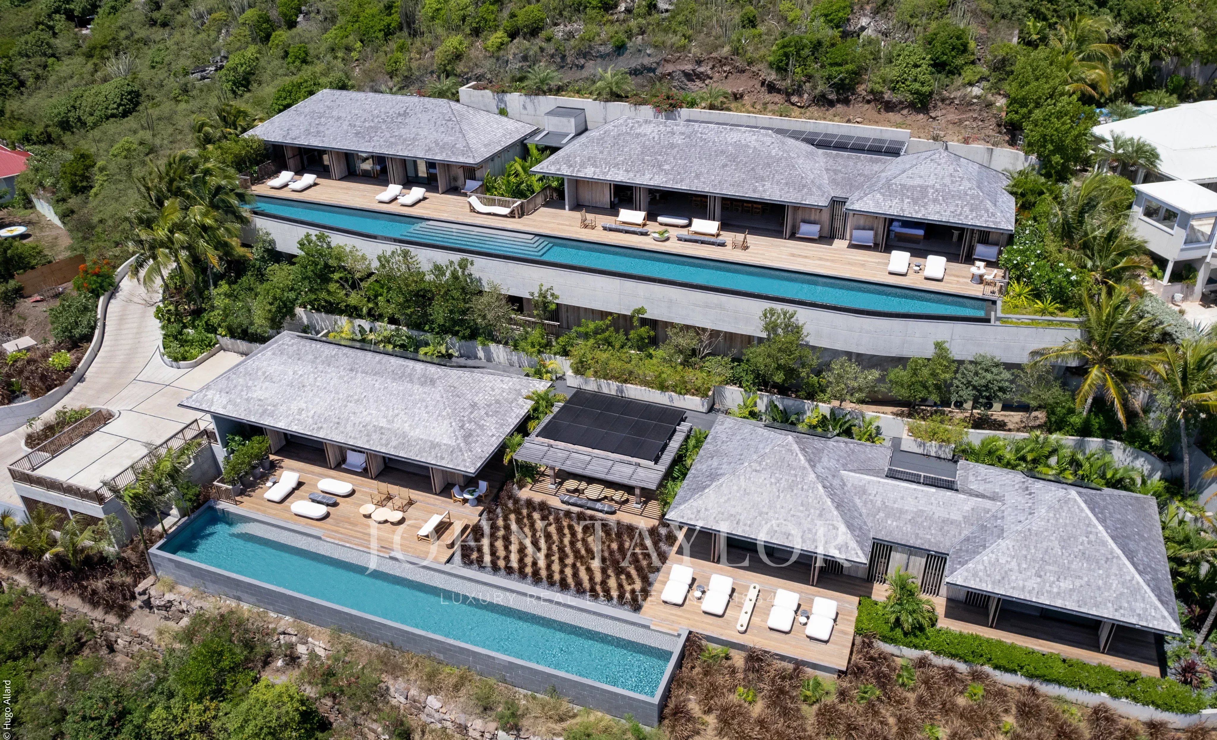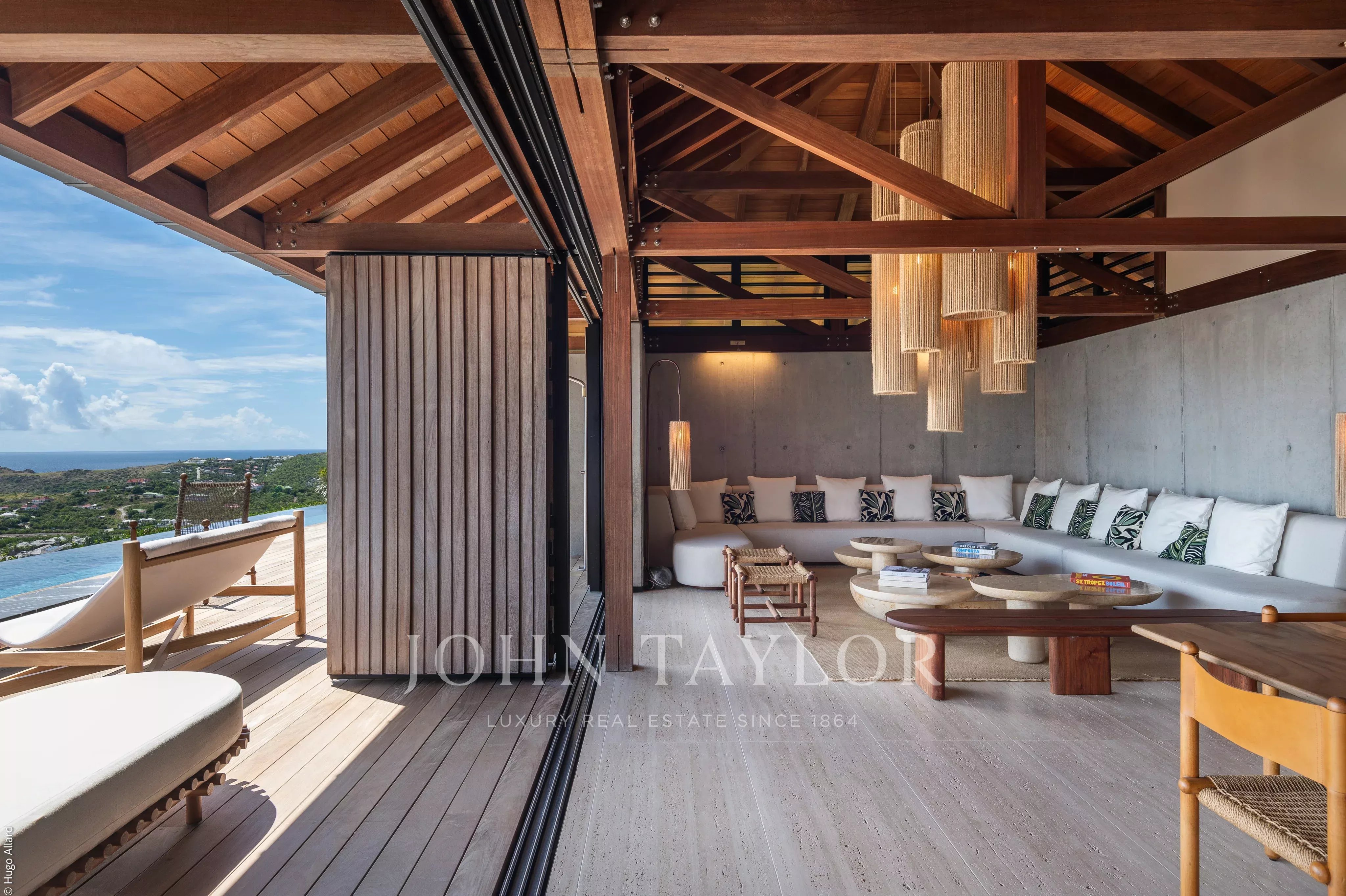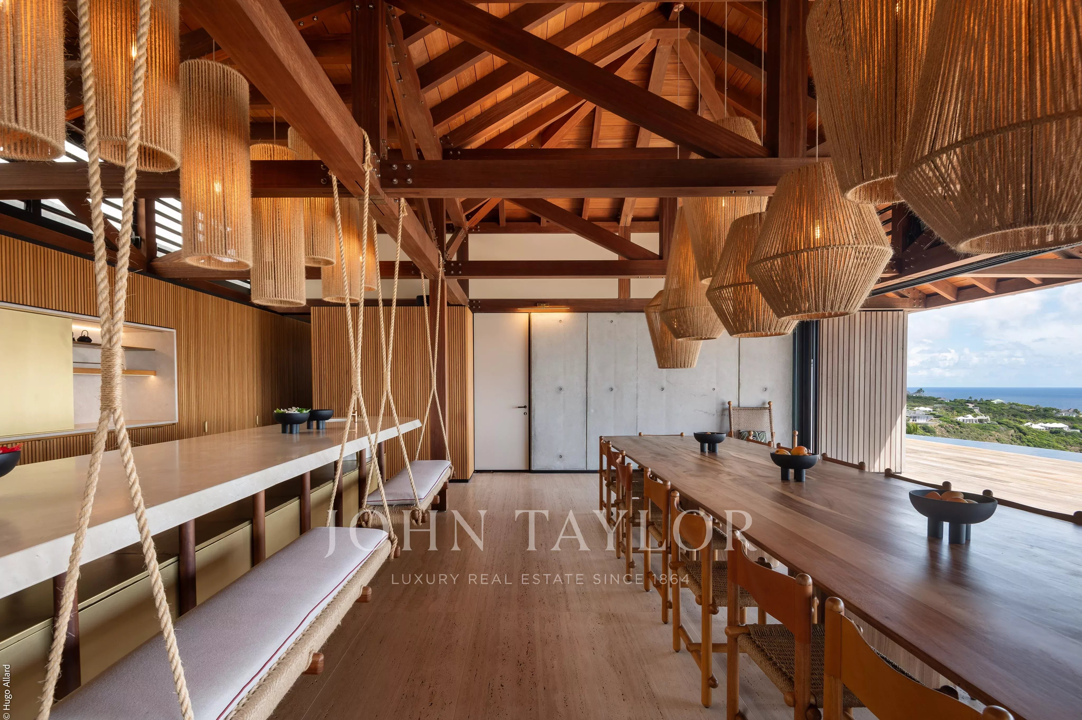 Édifié sur un vaste terrain de 4 000 m², le Manoir Voltaire domine la baie de Marigot et dévoile un panorama saisissant sur les eaux turquoise. Son architecture contemporaine s’organise en deux résidences distinctes, chacune dotée de vastes espaces de réception et de piscines scintillantes. La partie supérieure s’ouvre sur un salon spectaculaire prolongé par une terrasse panoramique, où canapés et fauteuils invitent à la contemplation sous une élégante charpente en bois patiné. Une salle à manger intérieure et une cuisine professionnelle permettent d’accueillir un chef privé, tandis qu’un salon TV complète cet univers de confort.