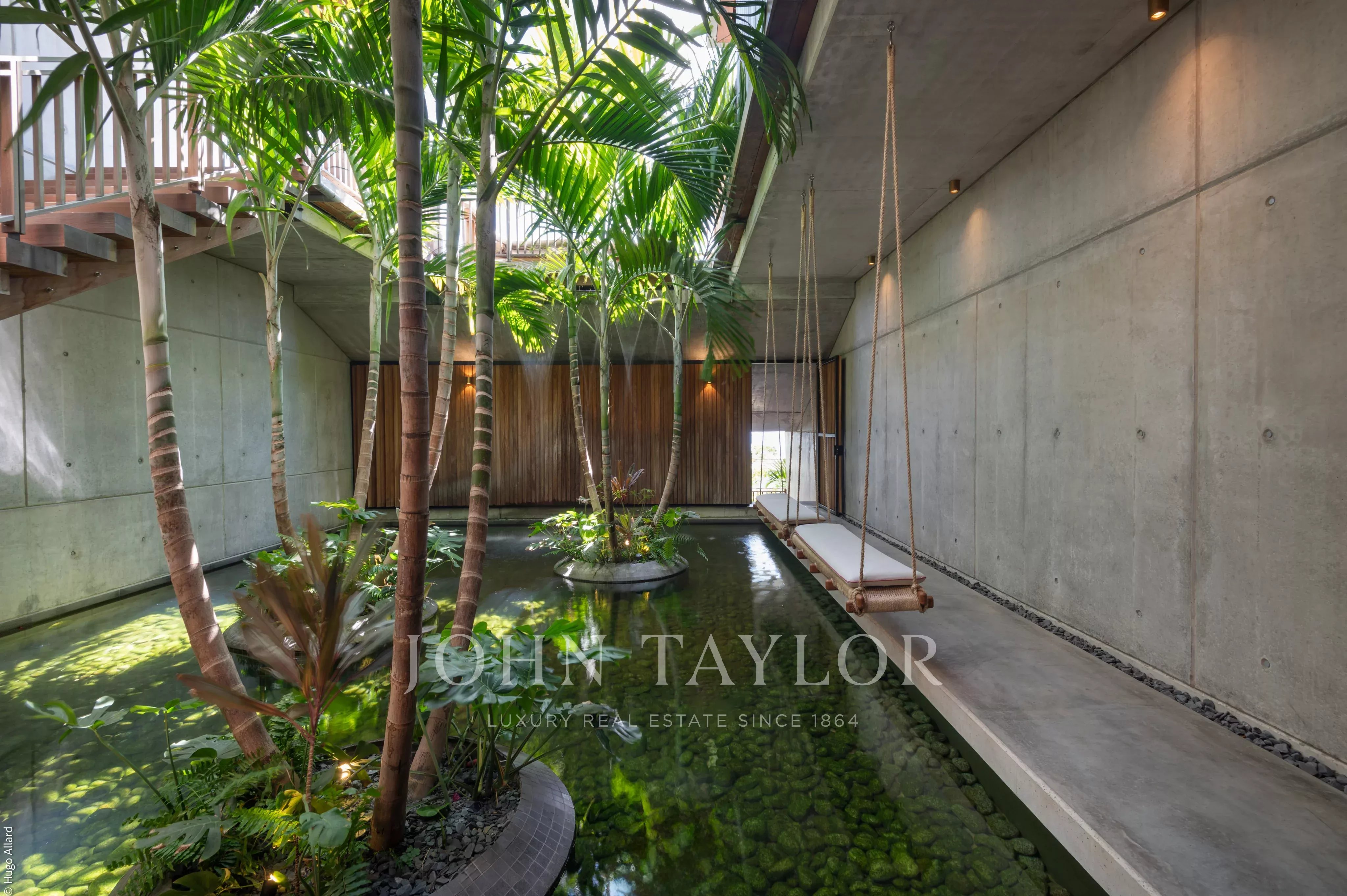 Les matériaux nobles tels que le bois exotique de Bali et le marbre confèrent à l’ensemble une élégance intemporelle, mêlant sophistication et harmonie.