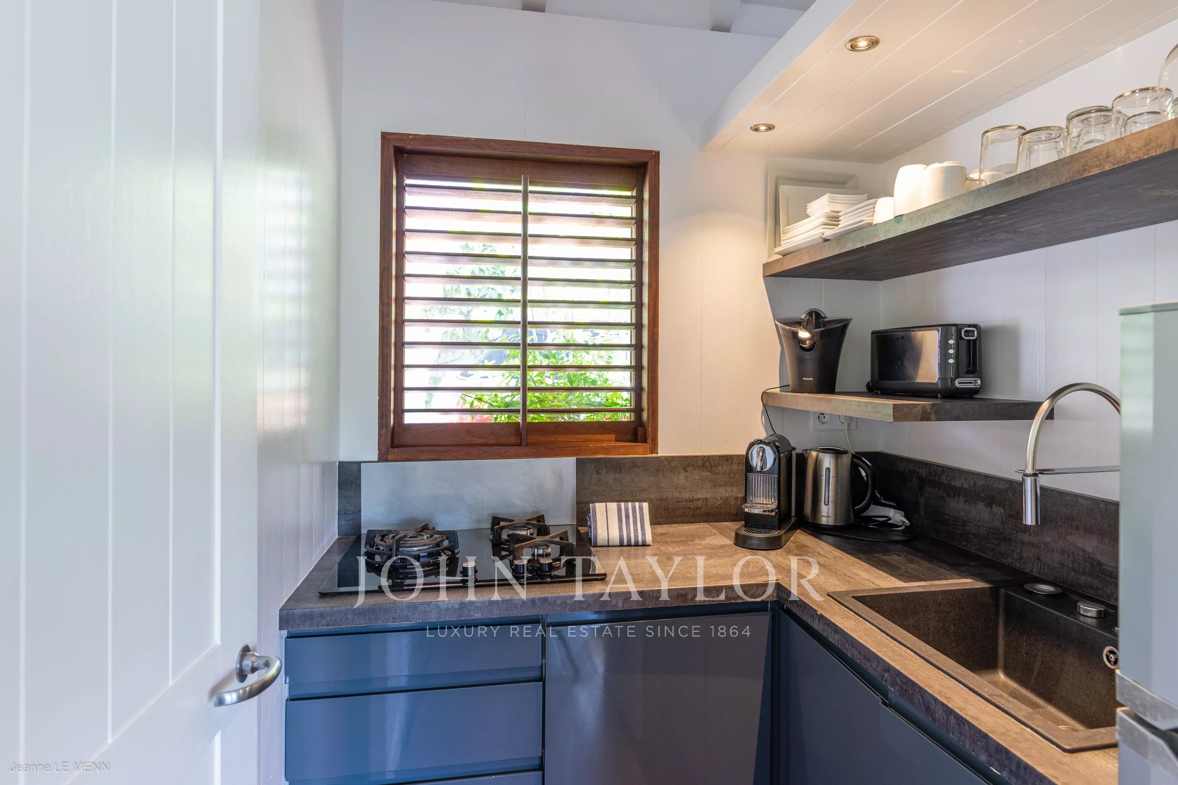 La cuisine, compacte mais fonctionnelle, est entièrement équipée pour répondre aux besoins du quotidien, rendant la villa aussi pratique qu’agréable à vivre.