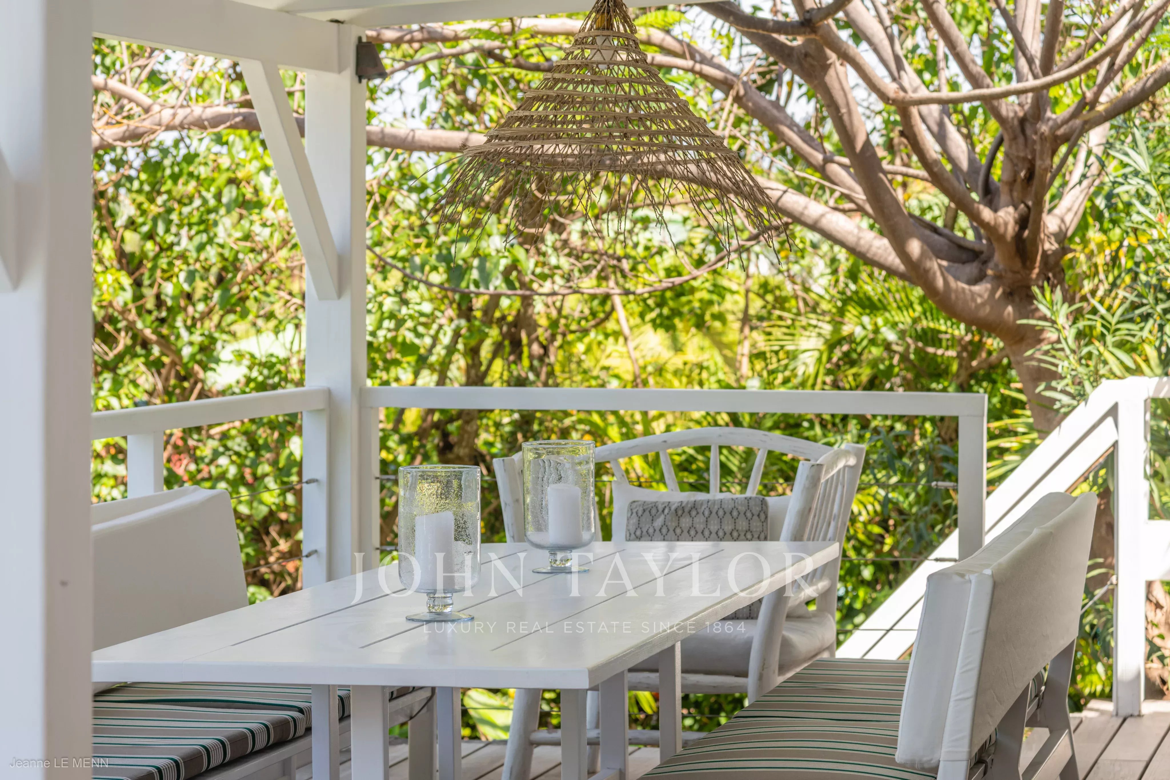 Aménagée avec soin, avec du mobilier inspiré par le style de Christian Liaigre, la propriété offre une atmosphère élégante et épurée. La villa dispose d’une belle terrasse en bois s’étendant le long de l’espace de vie principal, avec un coin repas extérieur, des transats et une agréable piscine de type plunge pool, idéale pour se rafraîchir tout en profitant du cadre paisible.