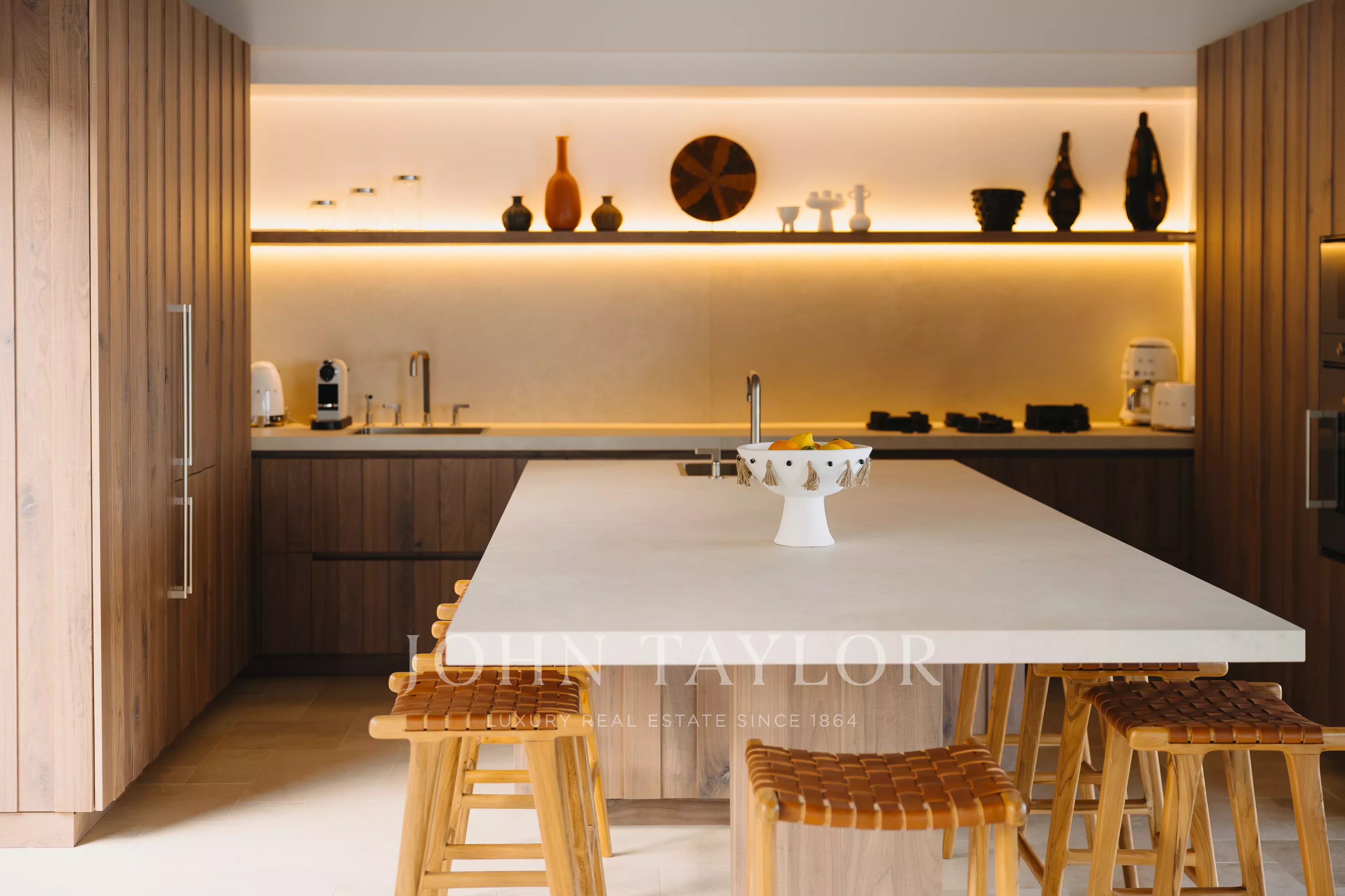 À l’extérieur, la terrasse devient un véritable lieu de vie : piscine chauffée en saison, coin salon, espace repas et plancha composent un décor idéal pour profiter pleinement du climat et de la vue.