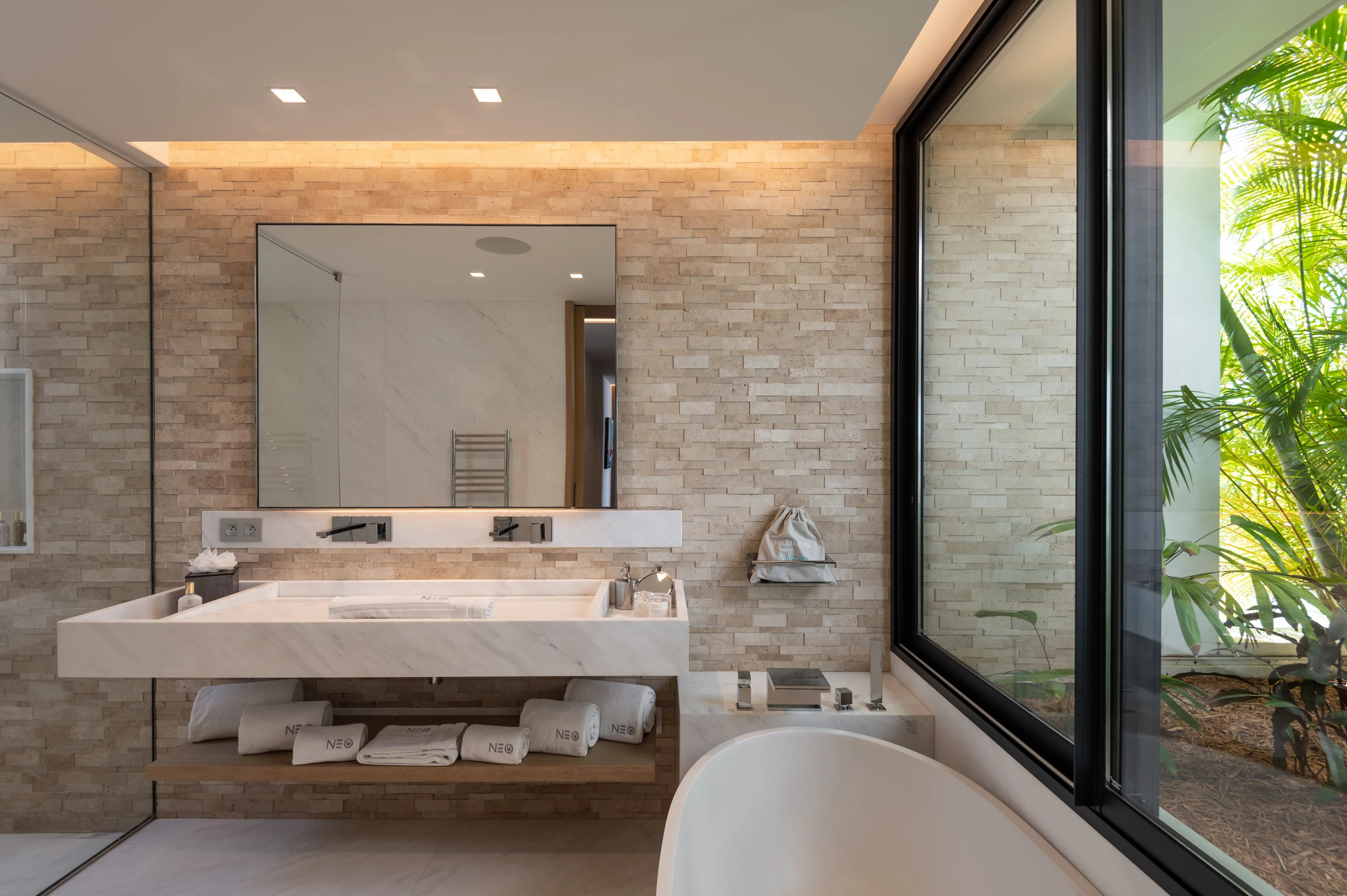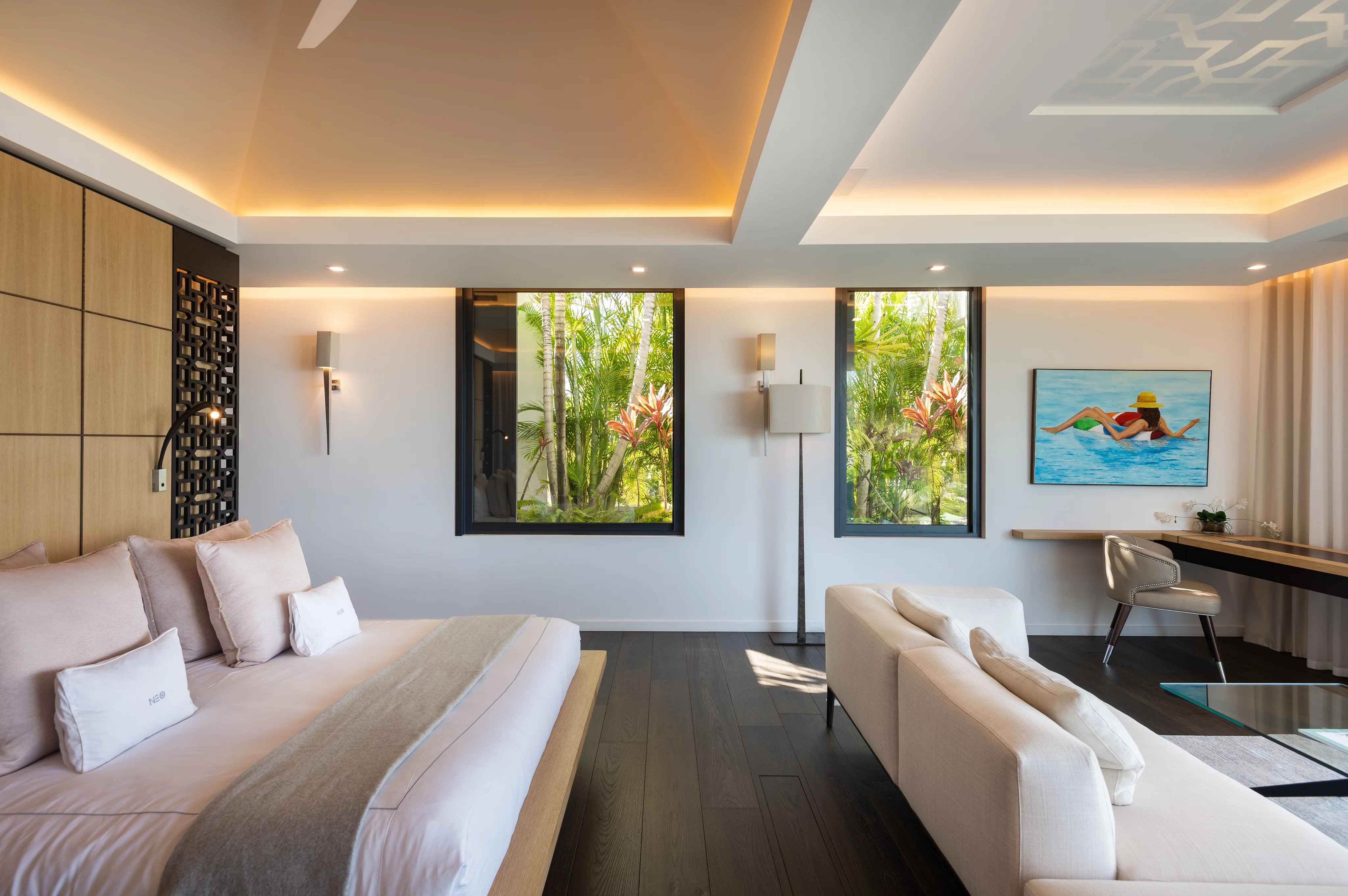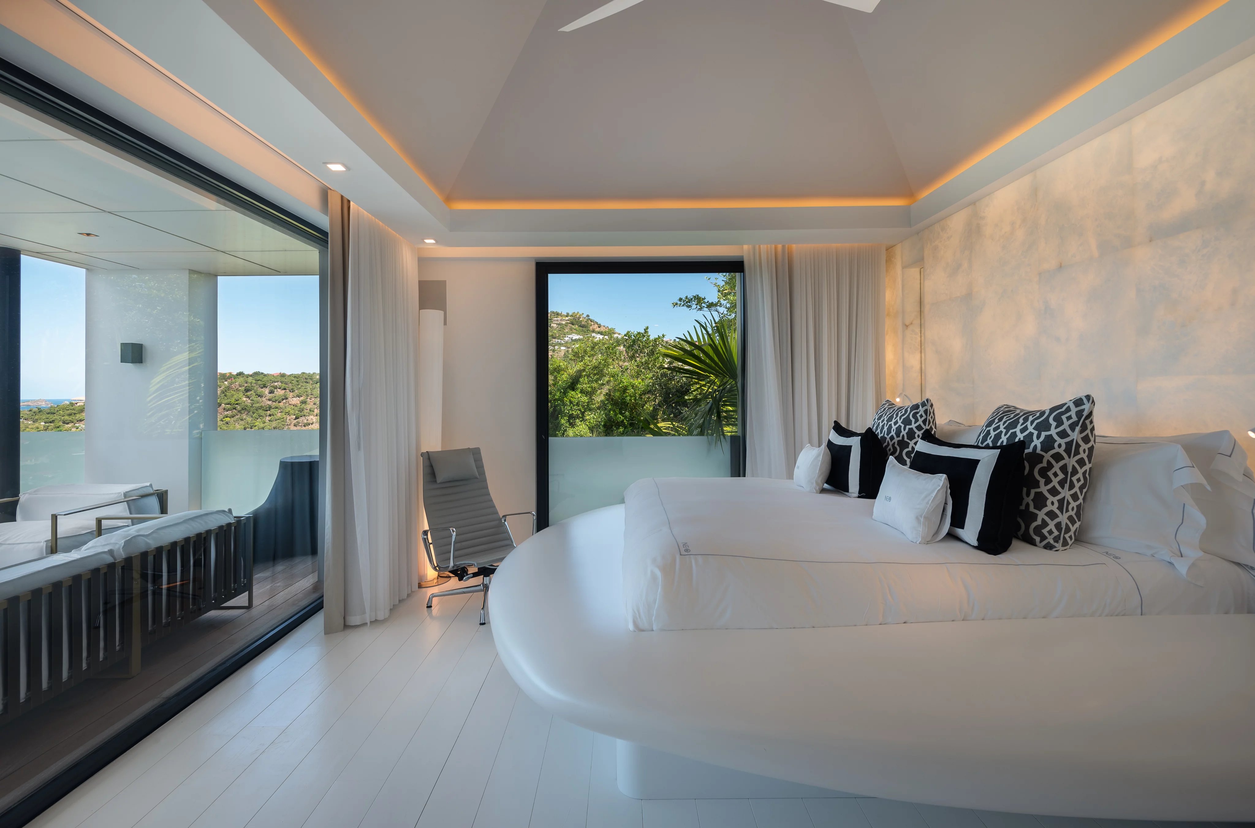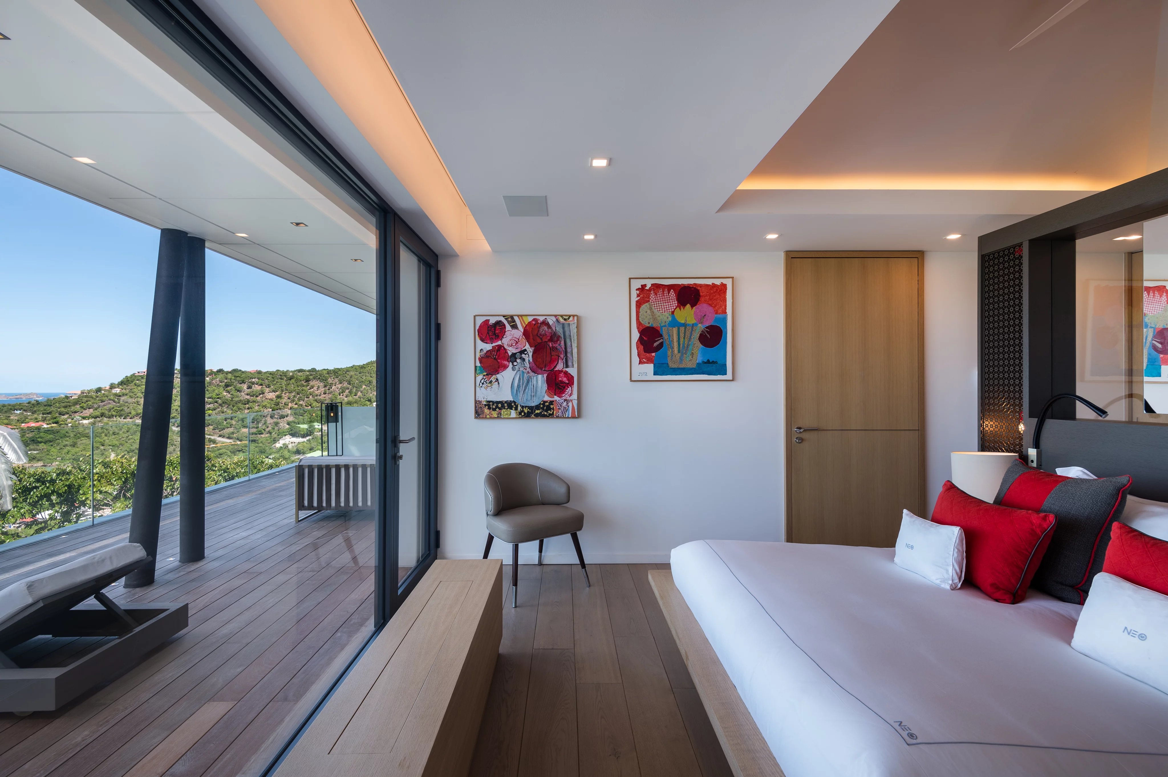 La villa NEO accueille six suites luxueuses et climatisées, réparties sur les deux niveaux. Deux suites communicantes conservent chacune leur salle de bain privative, tandis que toutes sont dotées de dressings spacieux, coins salon et accès aux terrasses ou bains à remous. Cinq suites bénéficient d’une vue panoramique exceptionnelle, tandis qu’une suite plus intime s’ouvre sur un patio intérieur. Les finitions haut de gamme, marbre, mosaïque et matériaux nobles, soulignent le niveau de confort et de luxe inégalé de la propriété.