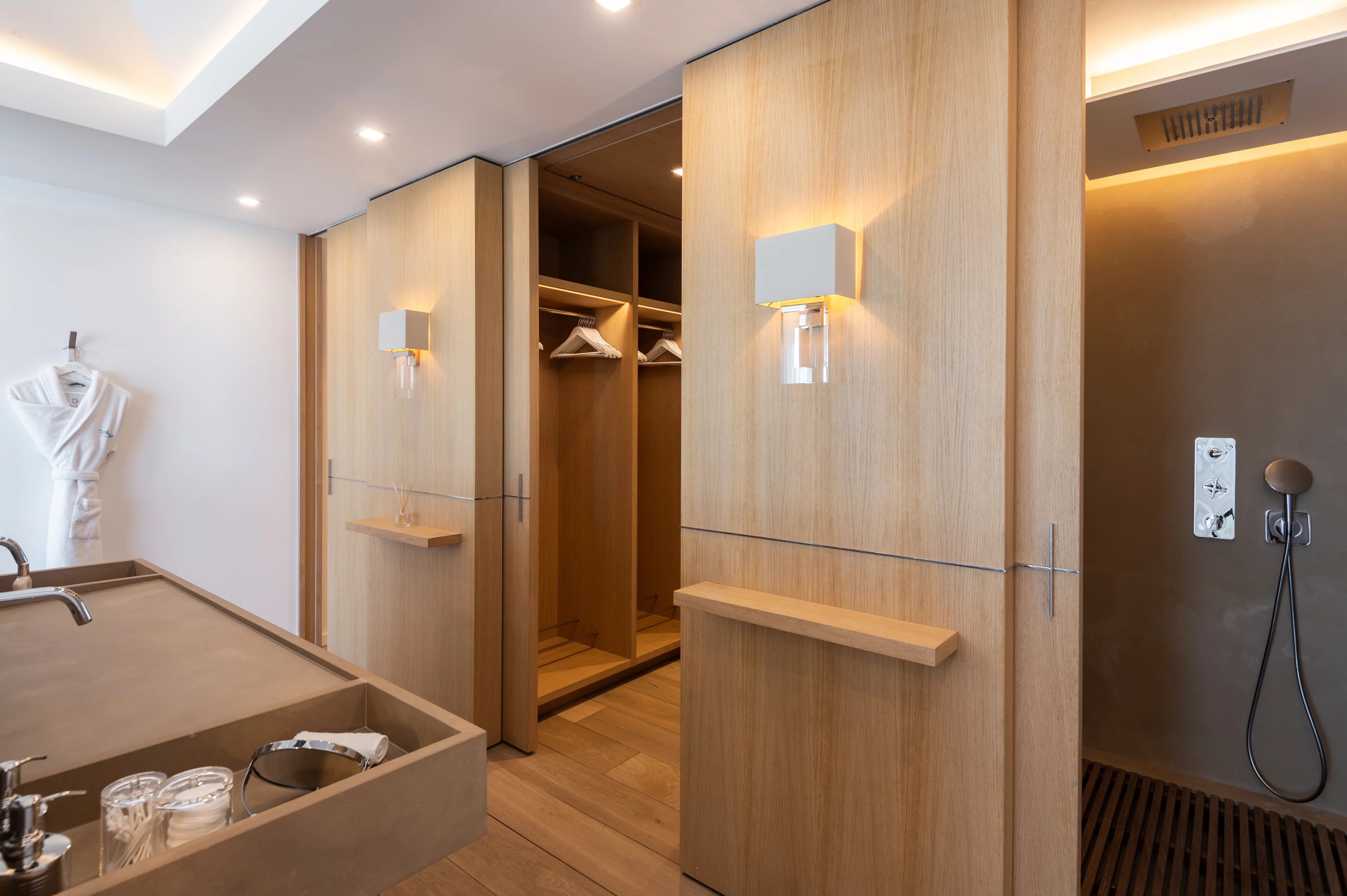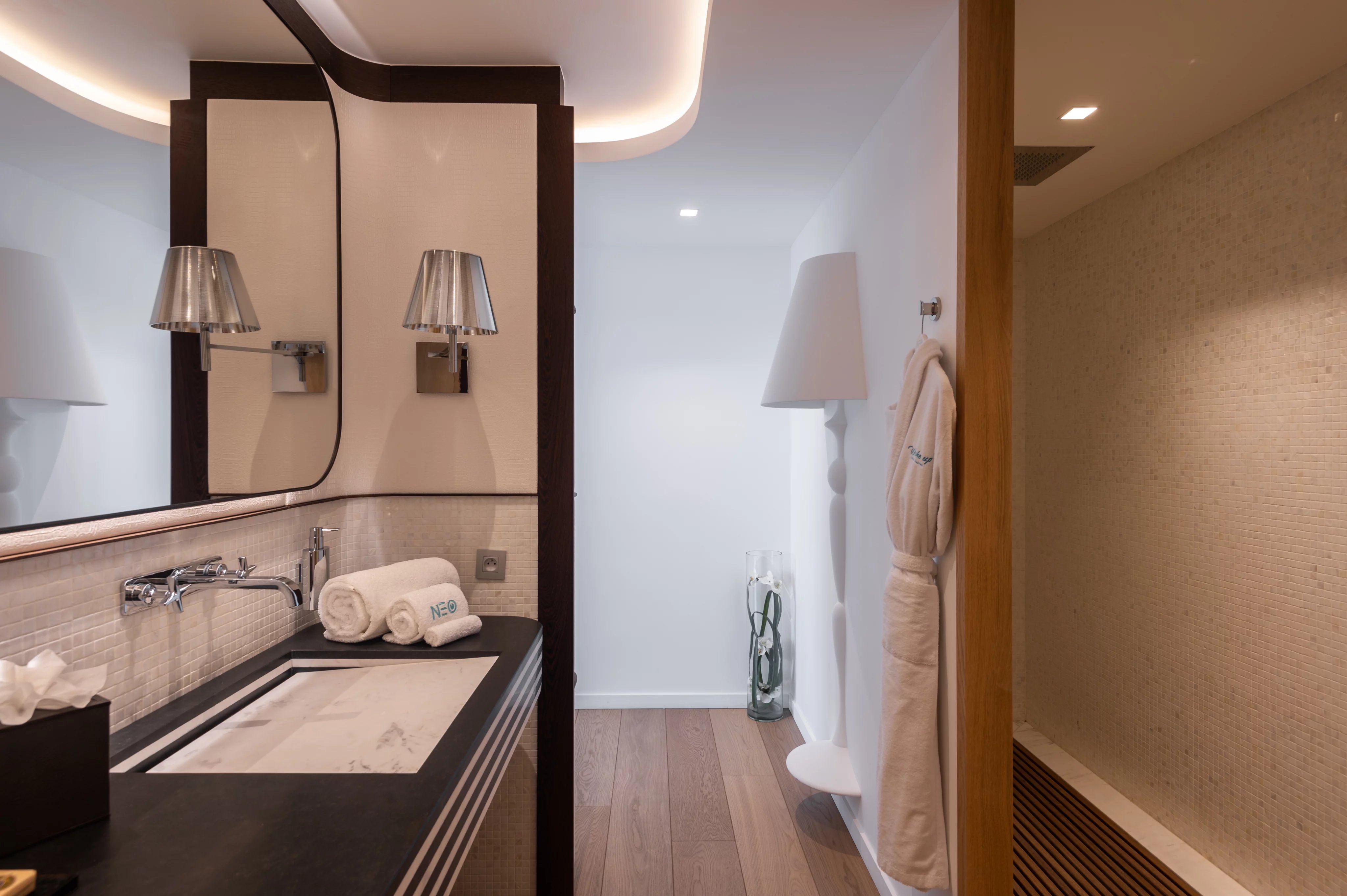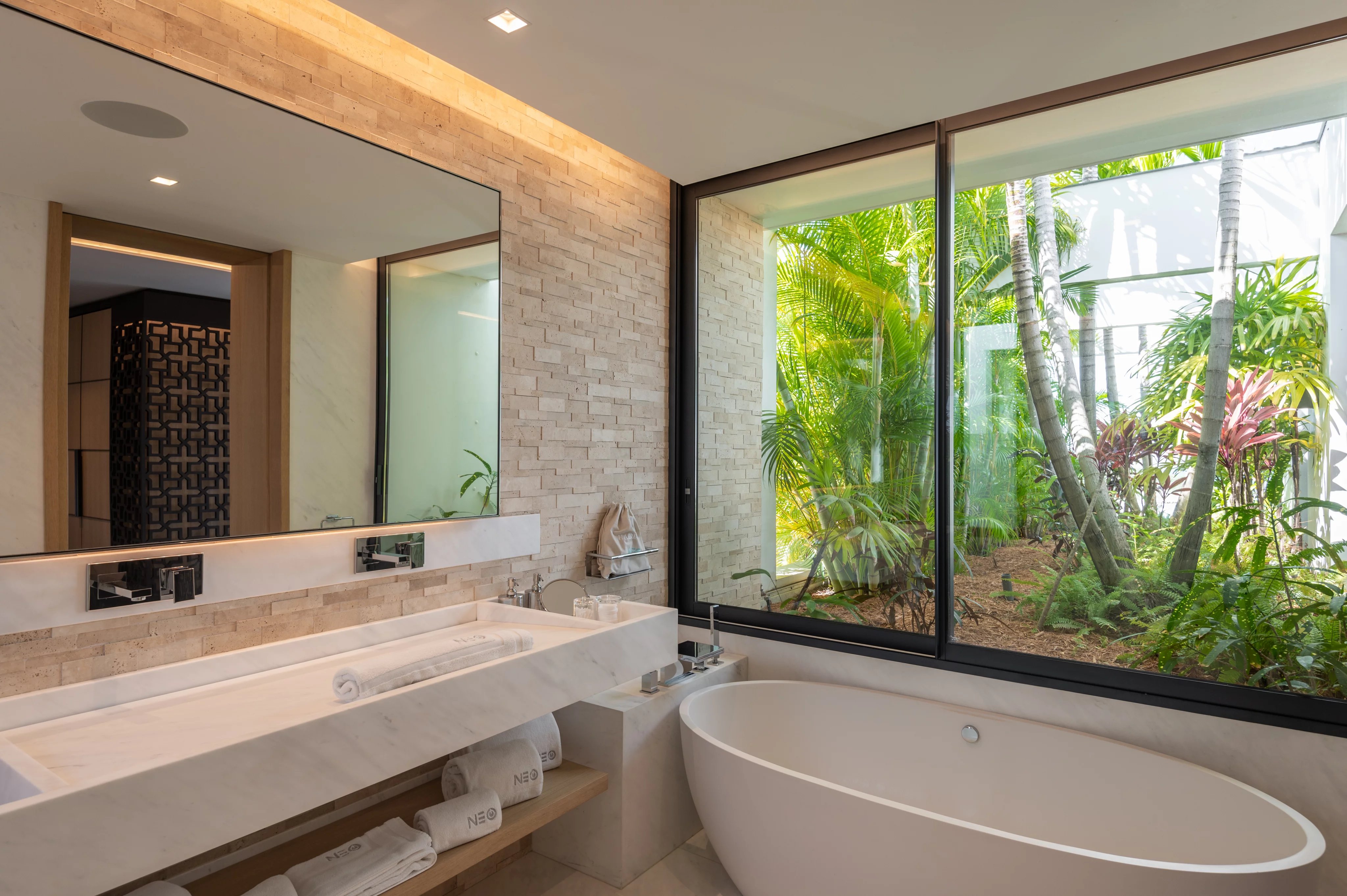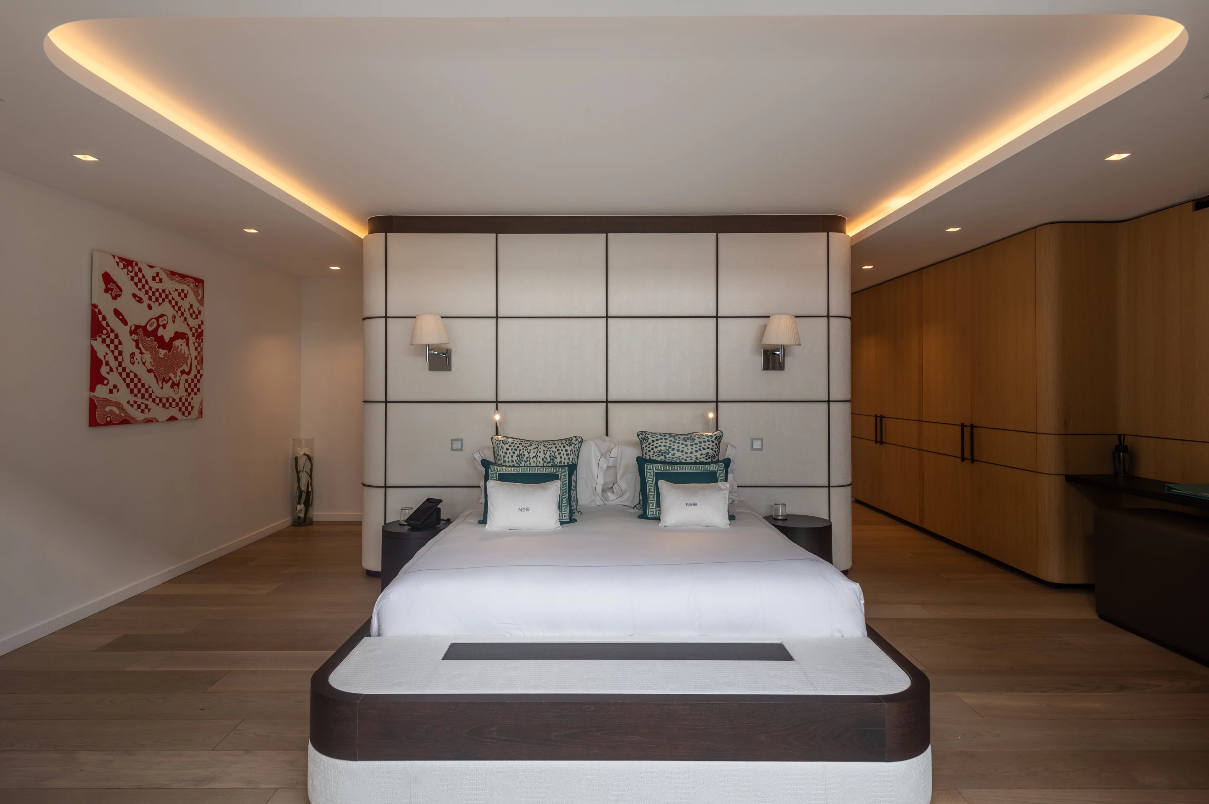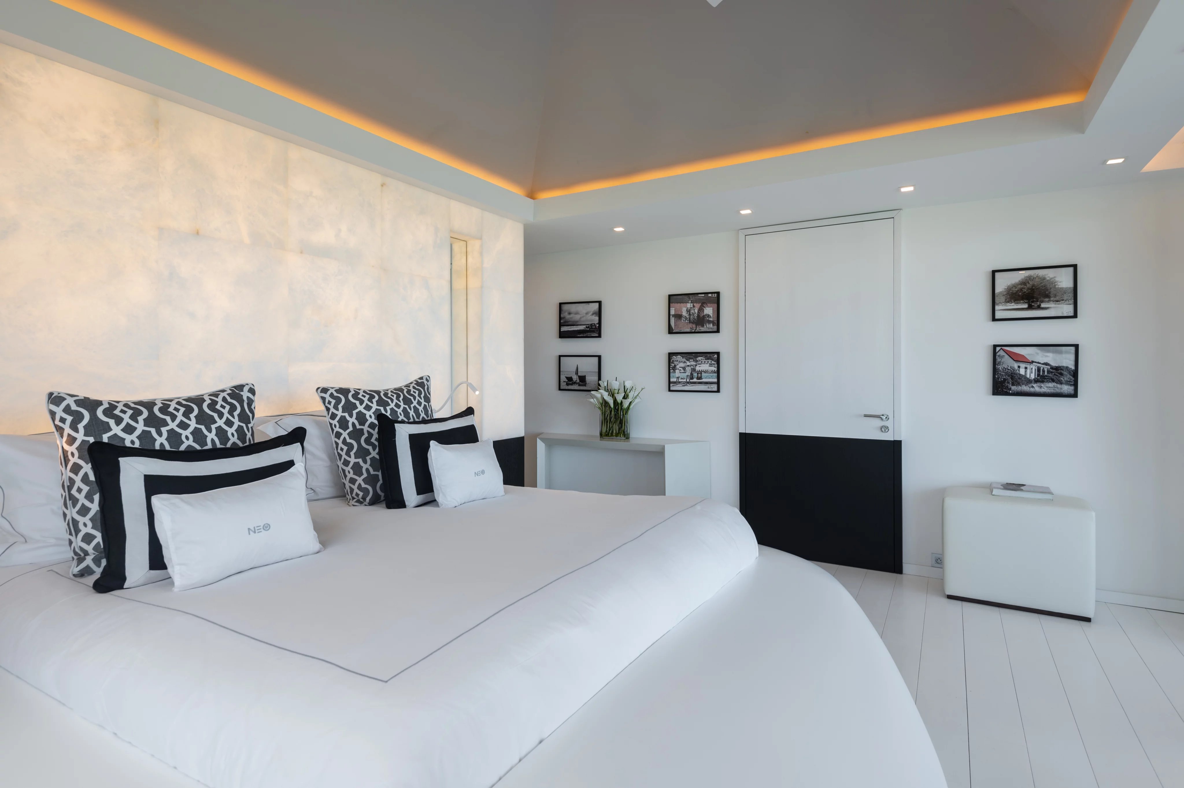 La villa NEO accueille six suites luxueuses et climatisées, réparties sur les deux niveaux. Deux suites communicantes conservent chacune leur salle de bain privative, tandis que toutes sont dotées de dressings spacieux, coins salon et accès aux terrasses ou bains à remous. Cinq suites bénéficient d’une vue panoramique exceptionnelle, tandis qu’une suite plus intime s’ouvre sur un patio intérieur. Les finitions haut de gamme, marbre, mosaïque et matériaux nobles, soulignent le niveau de confort et de luxe inégalé de la propriété.