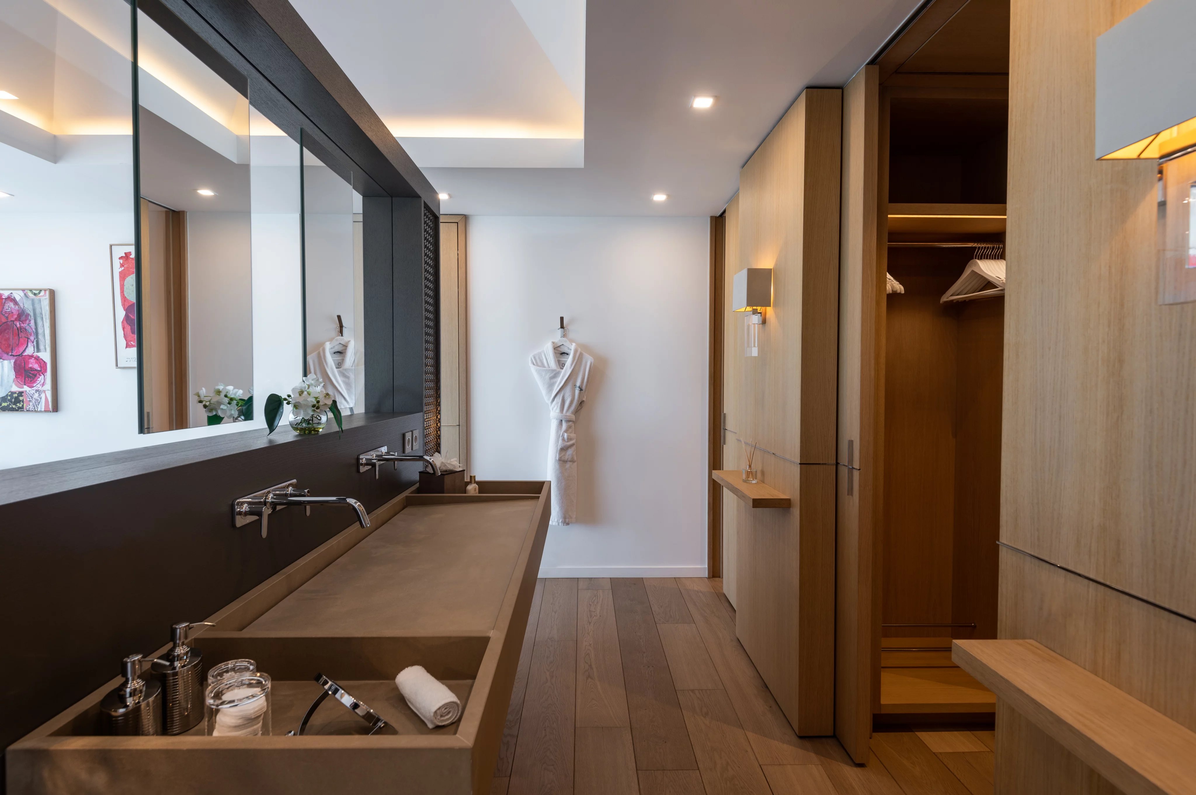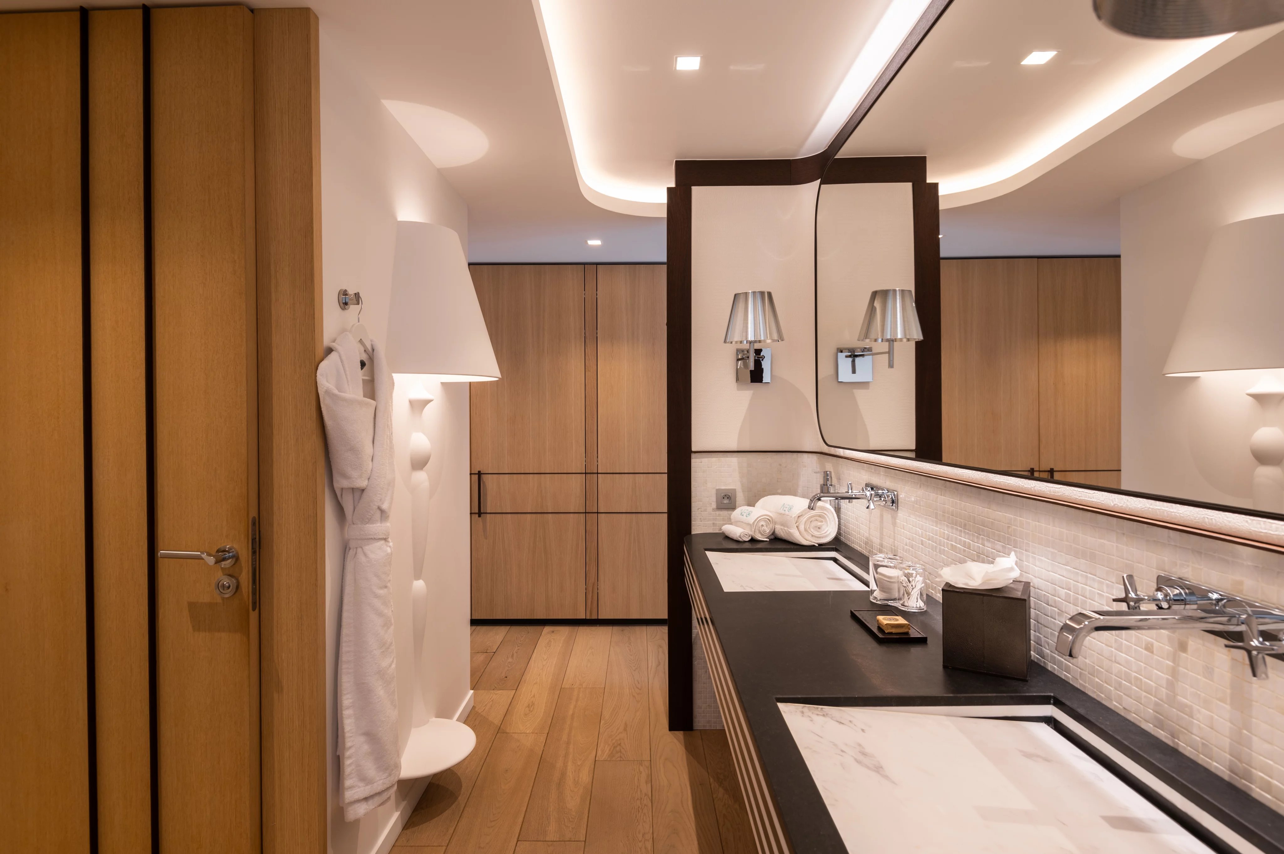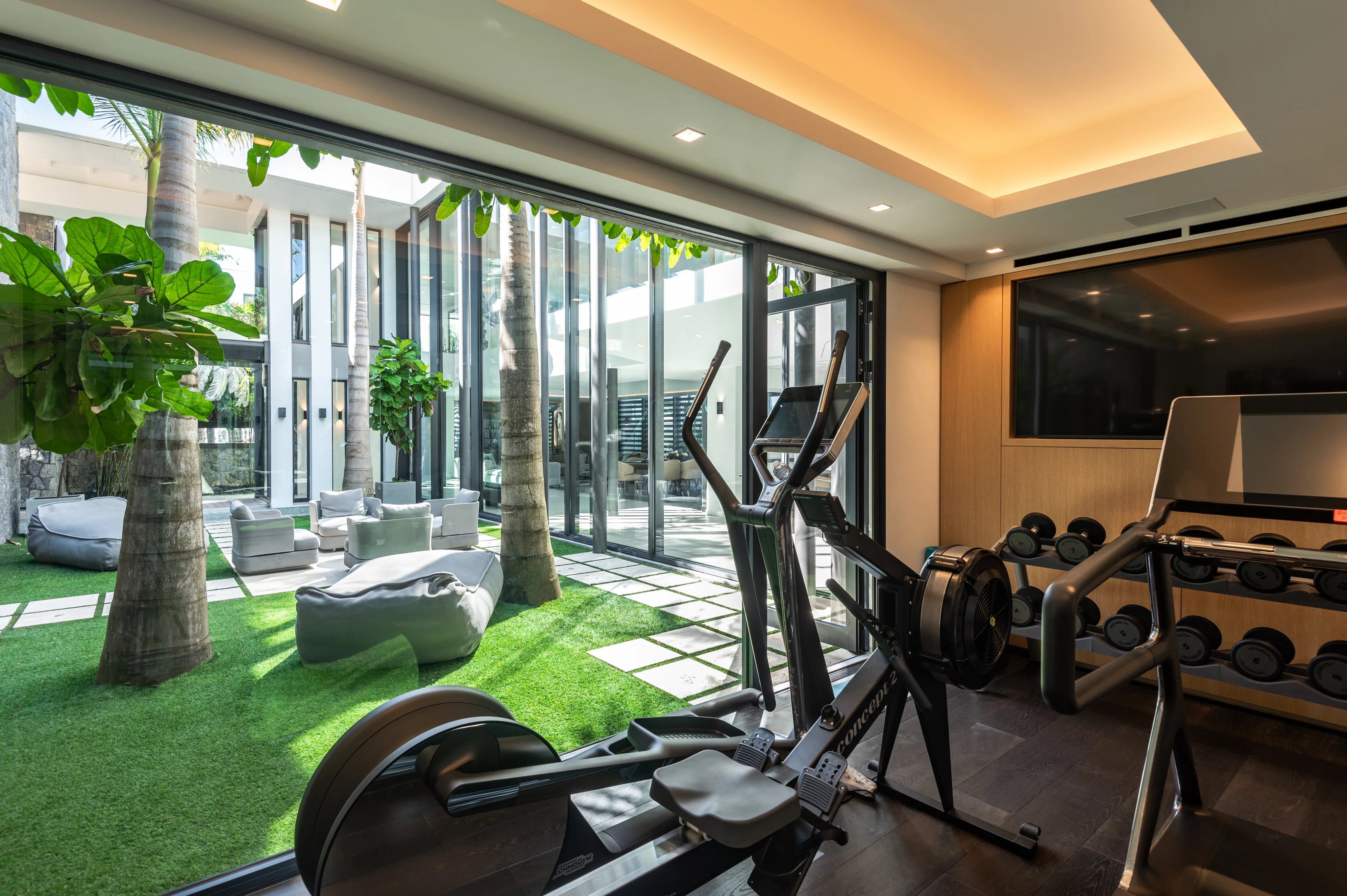 Au niveau principal, le salon vous accueille dans un espace majestueux, doté de canapés spacieux et d’un plafond ouvert sur le niveau supérieur. La salle à manger, élégamment aménagée, invite à savourer vos repas dans une atmosphère raffinée, tandis que la cuisine principale, entièrement équipée, permet de préparer vos repas et cocktails avec aisance. Une deuxième cuisine dédiée aux chefs privés offre, quant à elle, un espace professionnel pour ceux qui souhaitent faire appel à un service culinaire sur-mesure.