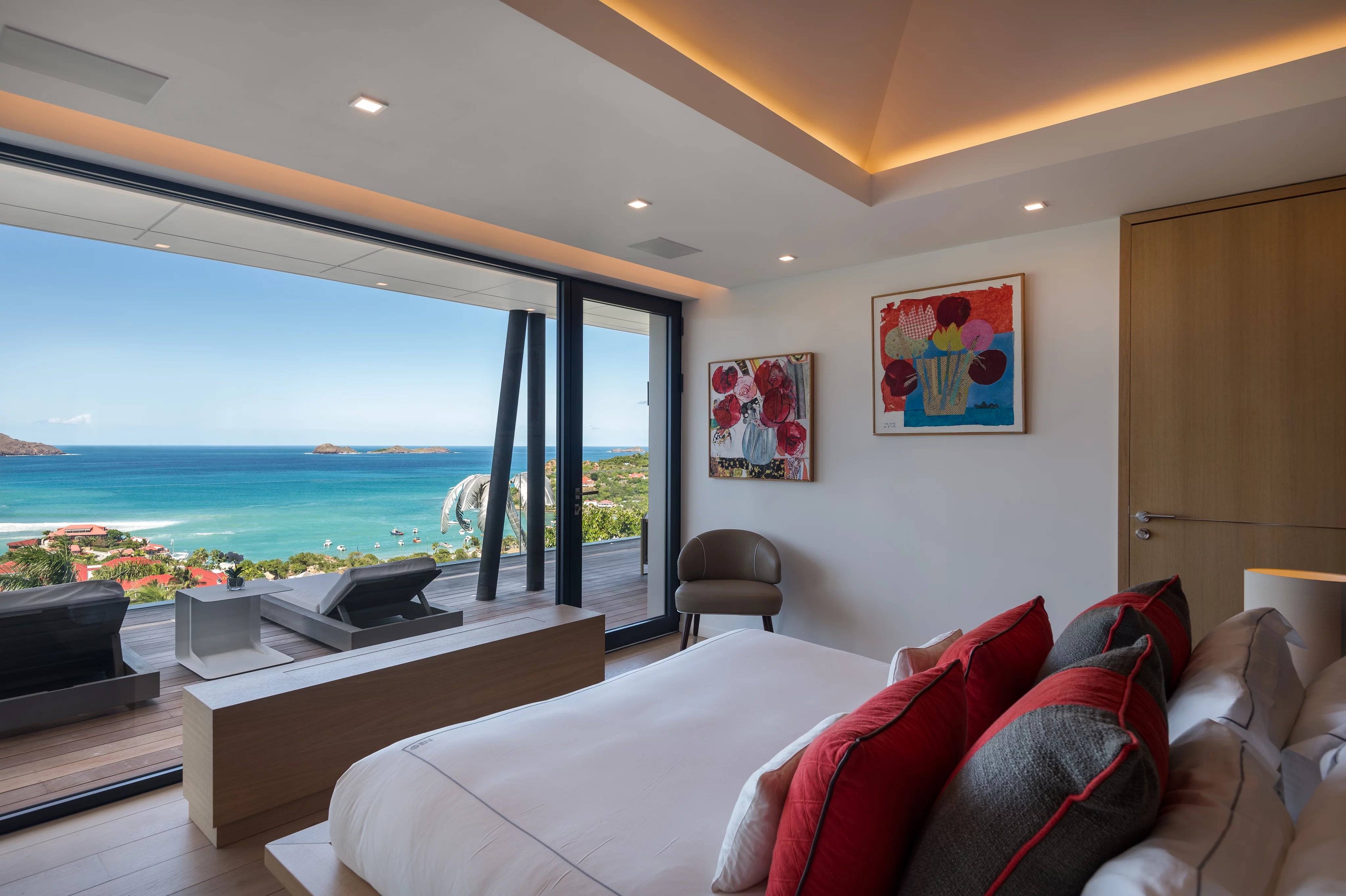 L’extérieur de la villa est à la hauteur de ses intérieurs : une terrasse spectaculaire, agrémentée d’une piscine chauffée à débordement de 30 mètres, s’ouvre sur un panorama infini sur la baie et l’océan. L’espace extérieur comprend également un salon lounge, des bains de soleil et une salle à manger en plein air, où les repas se savourent au rythme des alizés tropicaux et au cœur d’une végétation luxuriante.