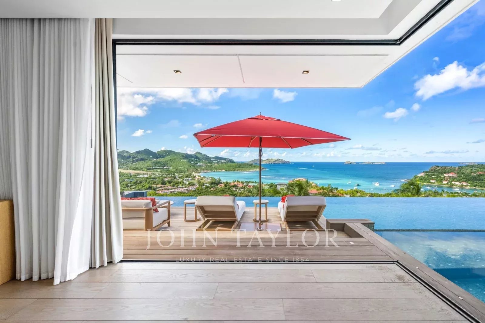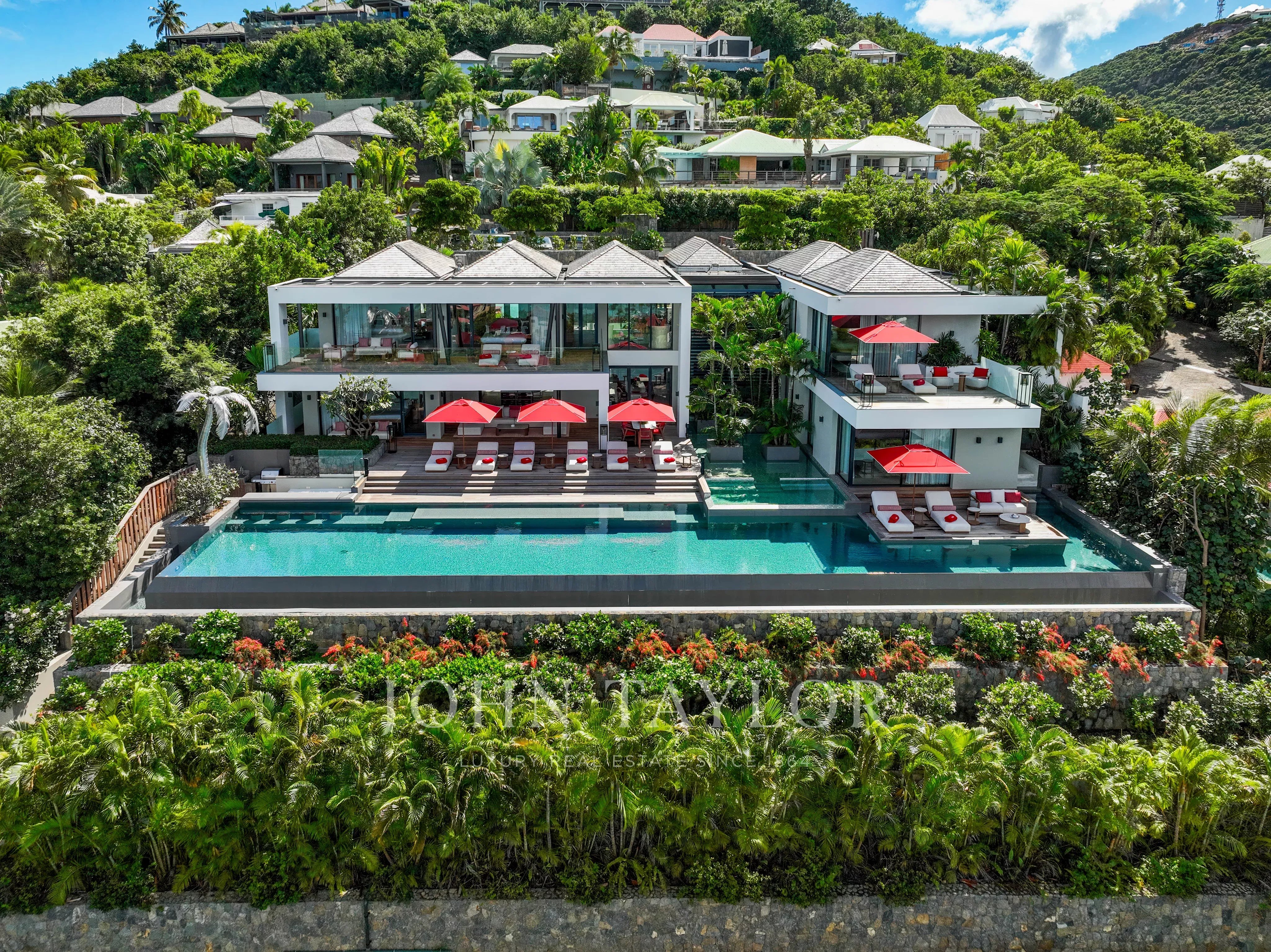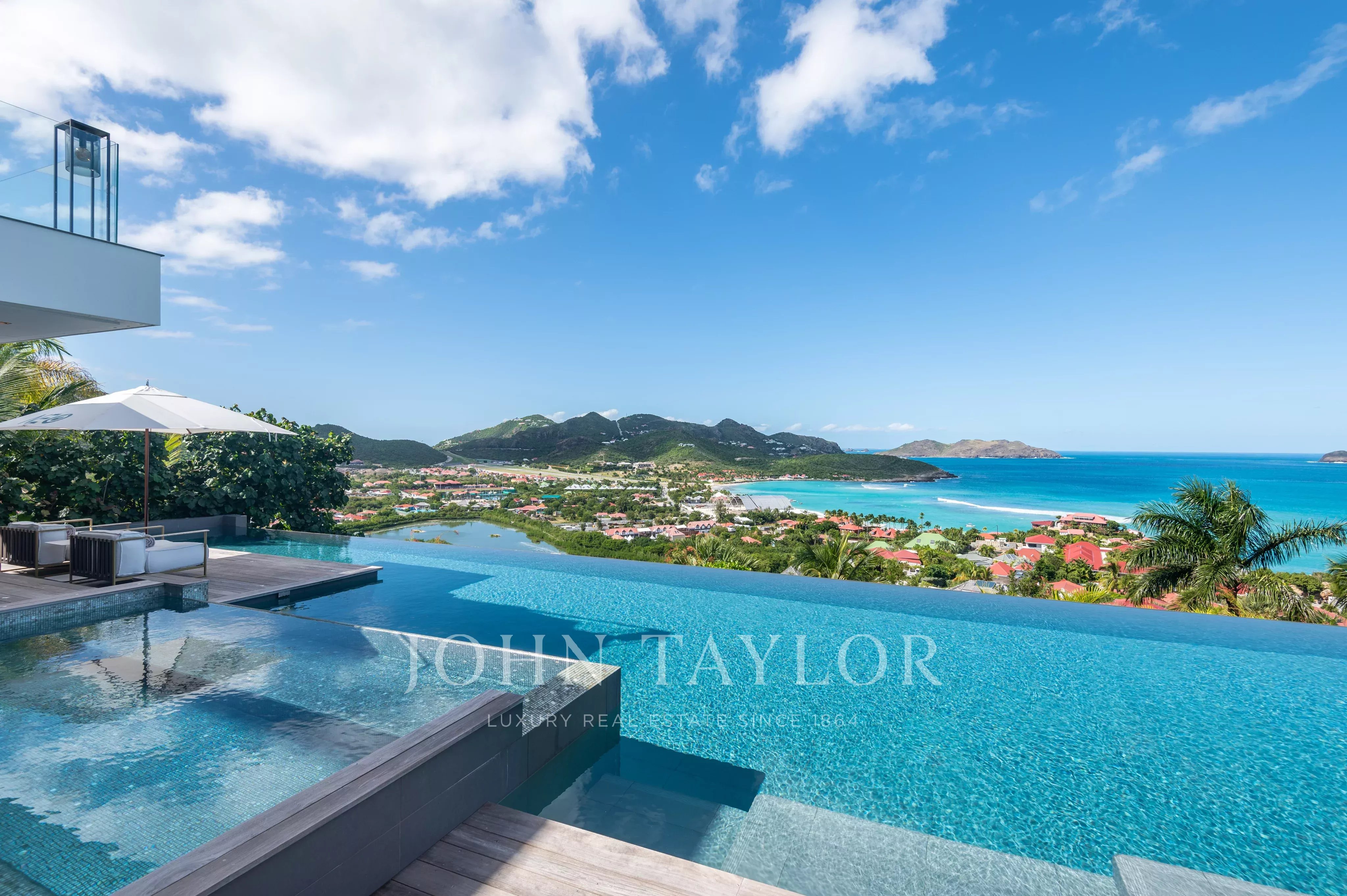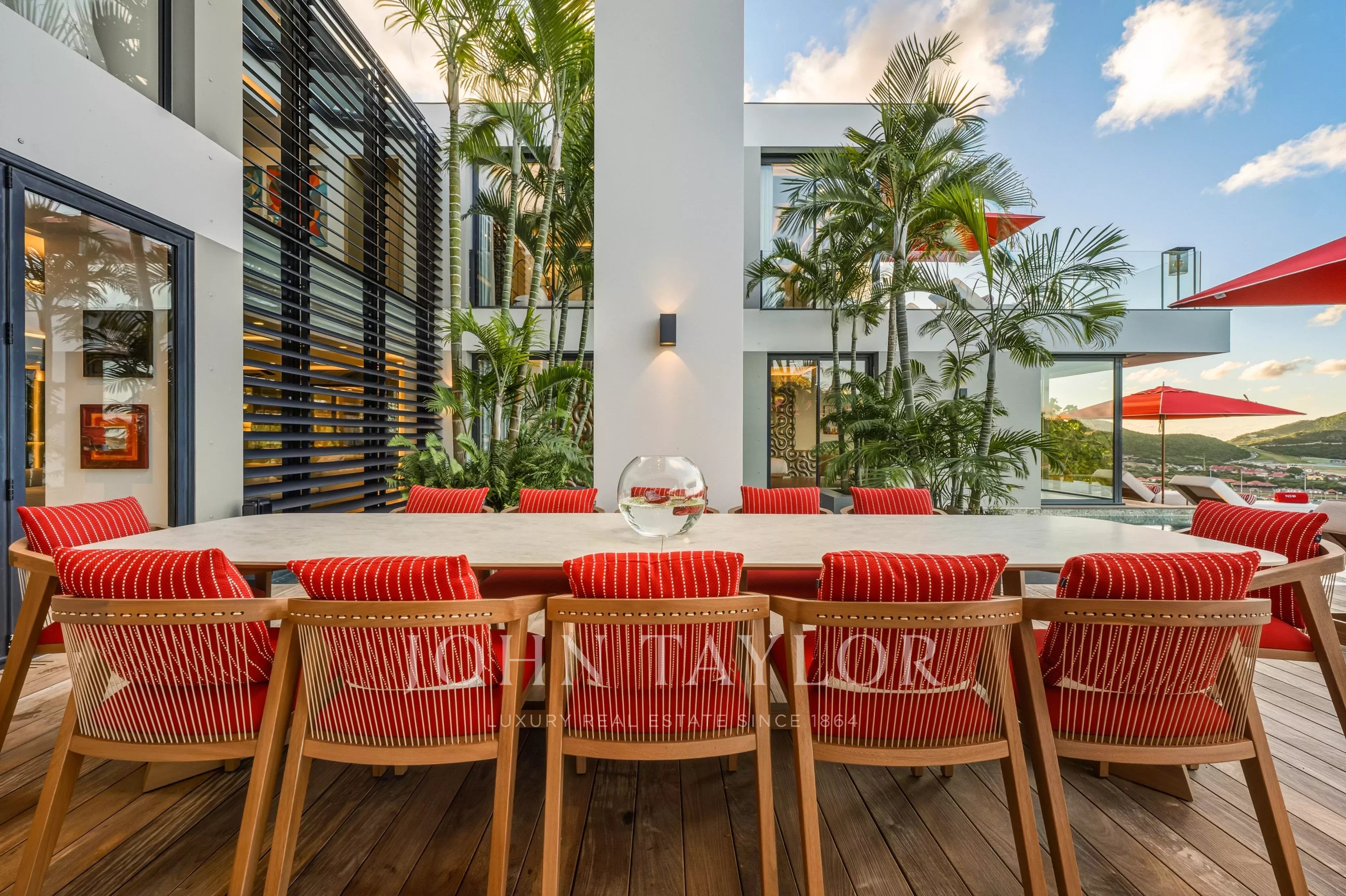 L’extérieur de la villa est à la hauteur de ses intérieurs : une terrasse spectaculaire, agrémentée d’une piscine chauffée à débordement de 30 mètres, s’ouvre sur une vue sur la baie de Saint Jean. L’espace extérieur comprend également un salon lounge, et une salle à manger en plein air.
