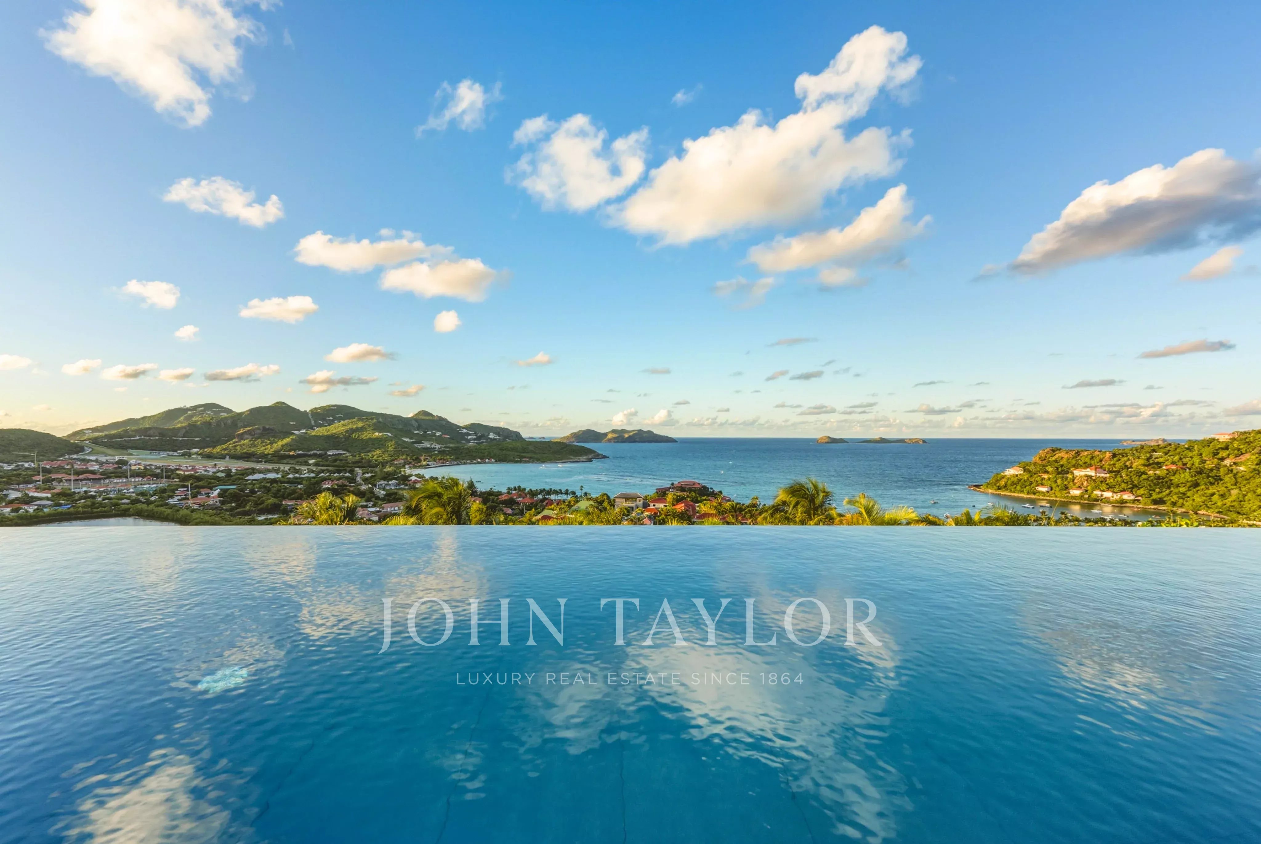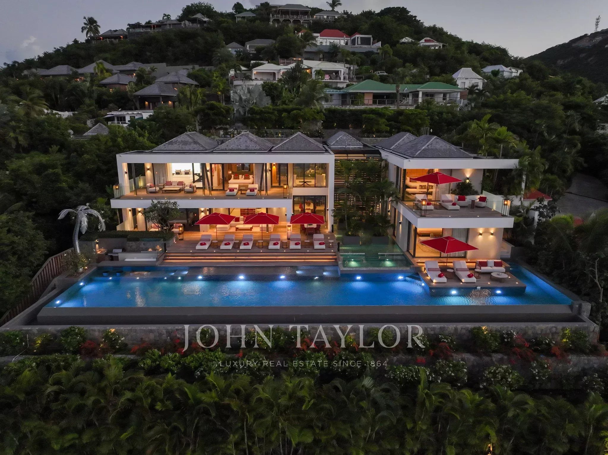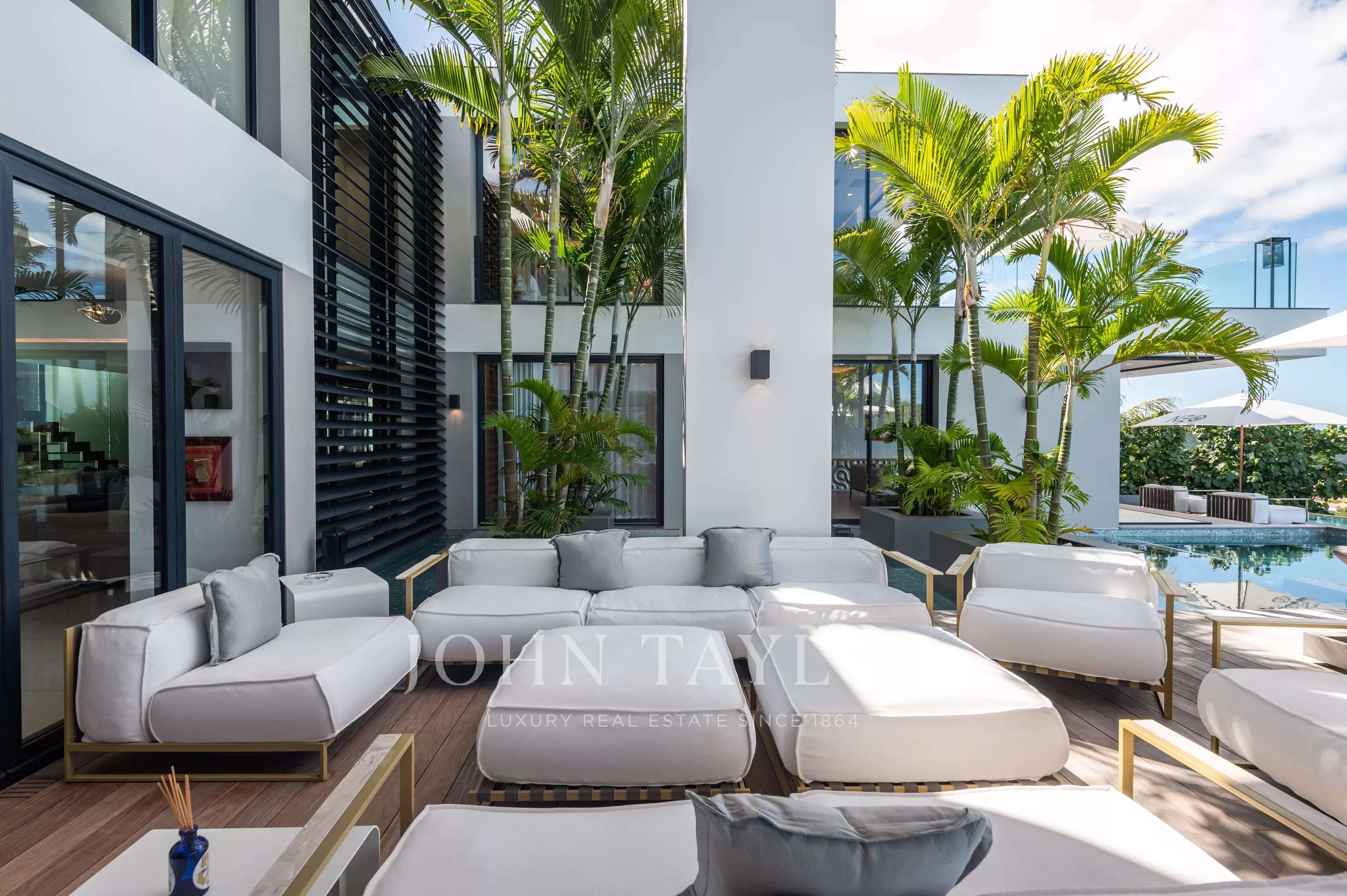L’extérieur de la villa est à la hauteur de ses intérieurs : une terrasse spectaculaire, agrémentée d’une piscine chauffée à débordement de 30 mètres, s’ouvre sur une vue sur la baie de Saint Jean. L’espace extérieur comprend également un salon lounge, et une salle à manger en plein air.