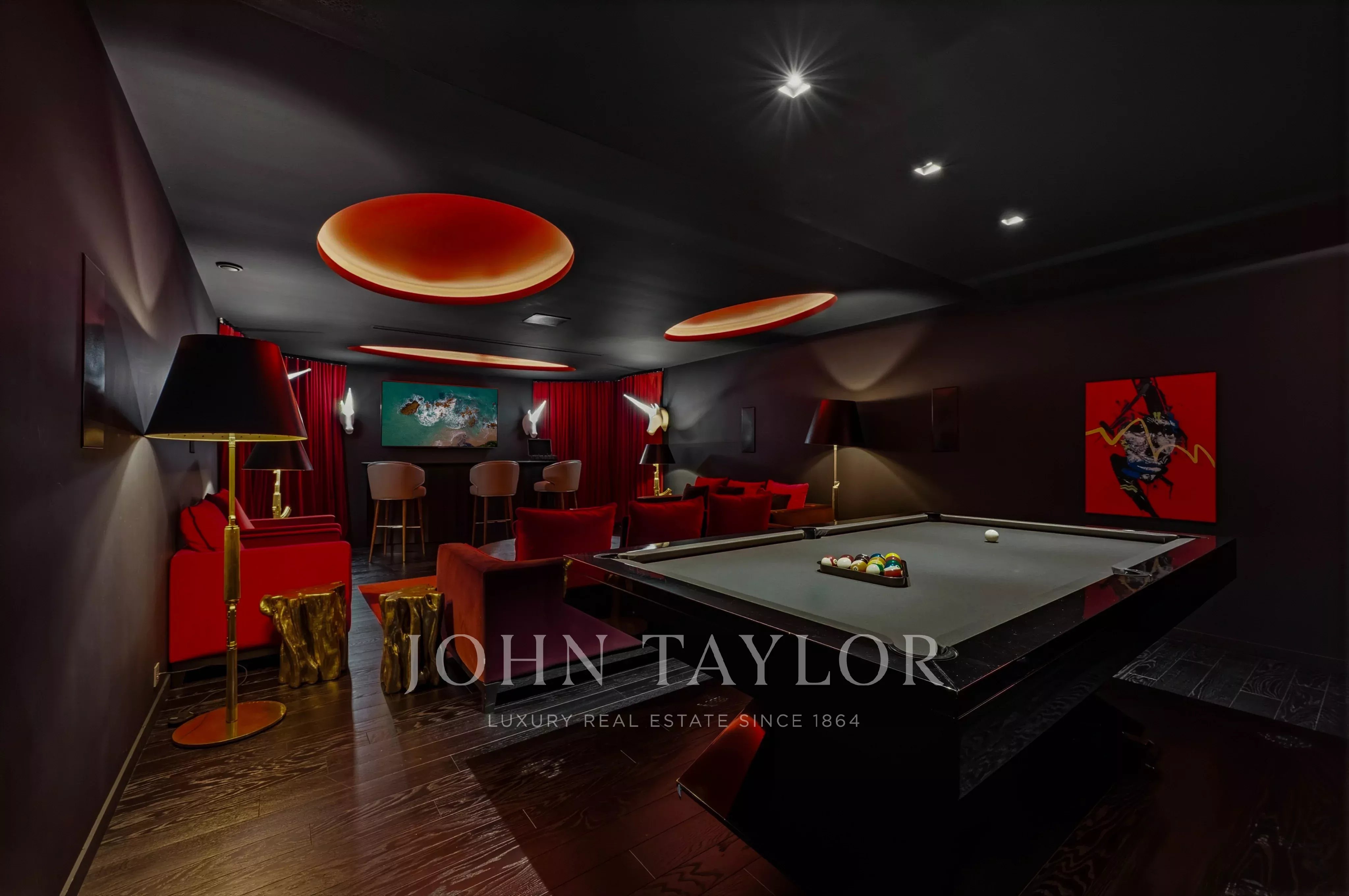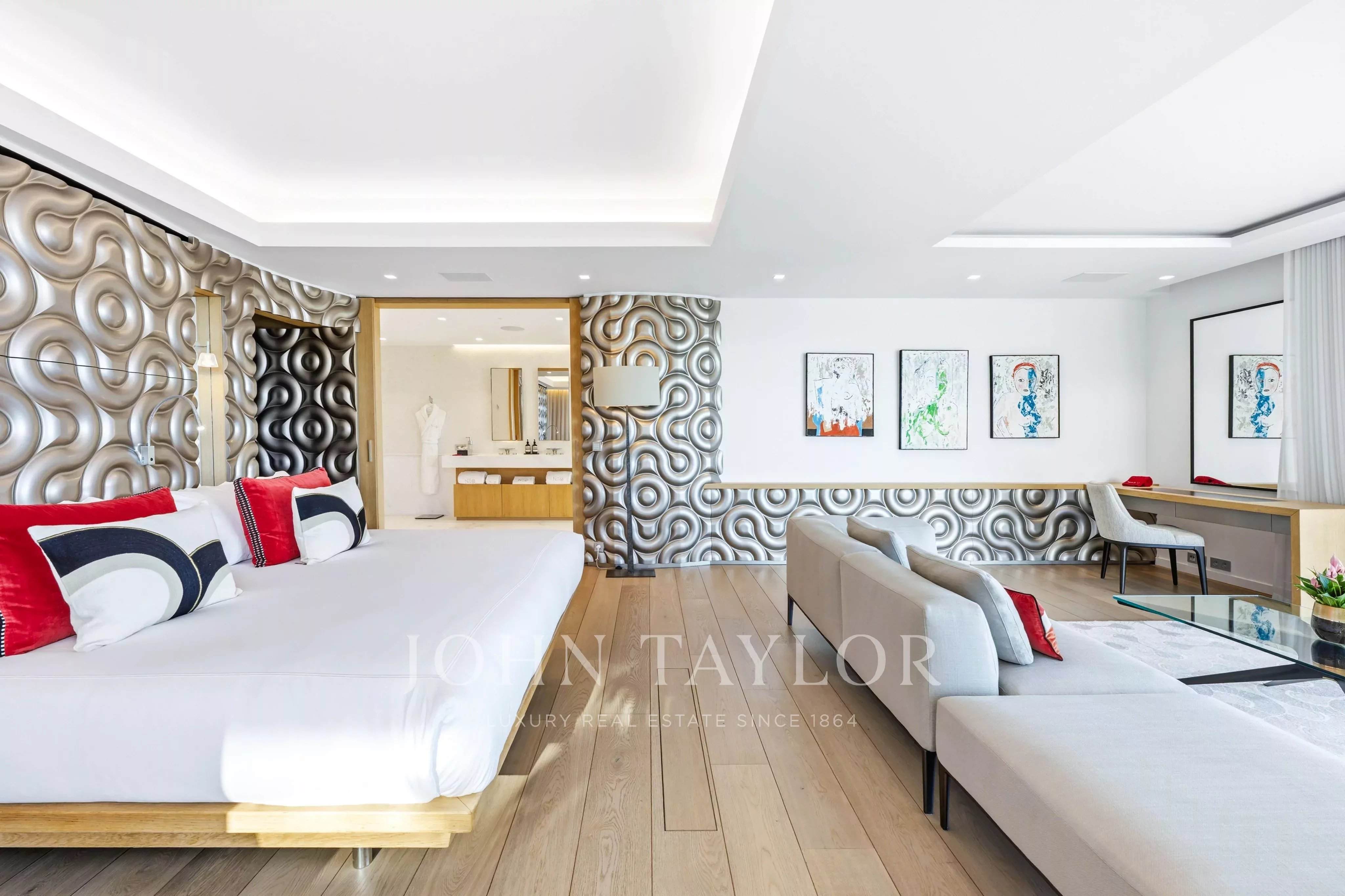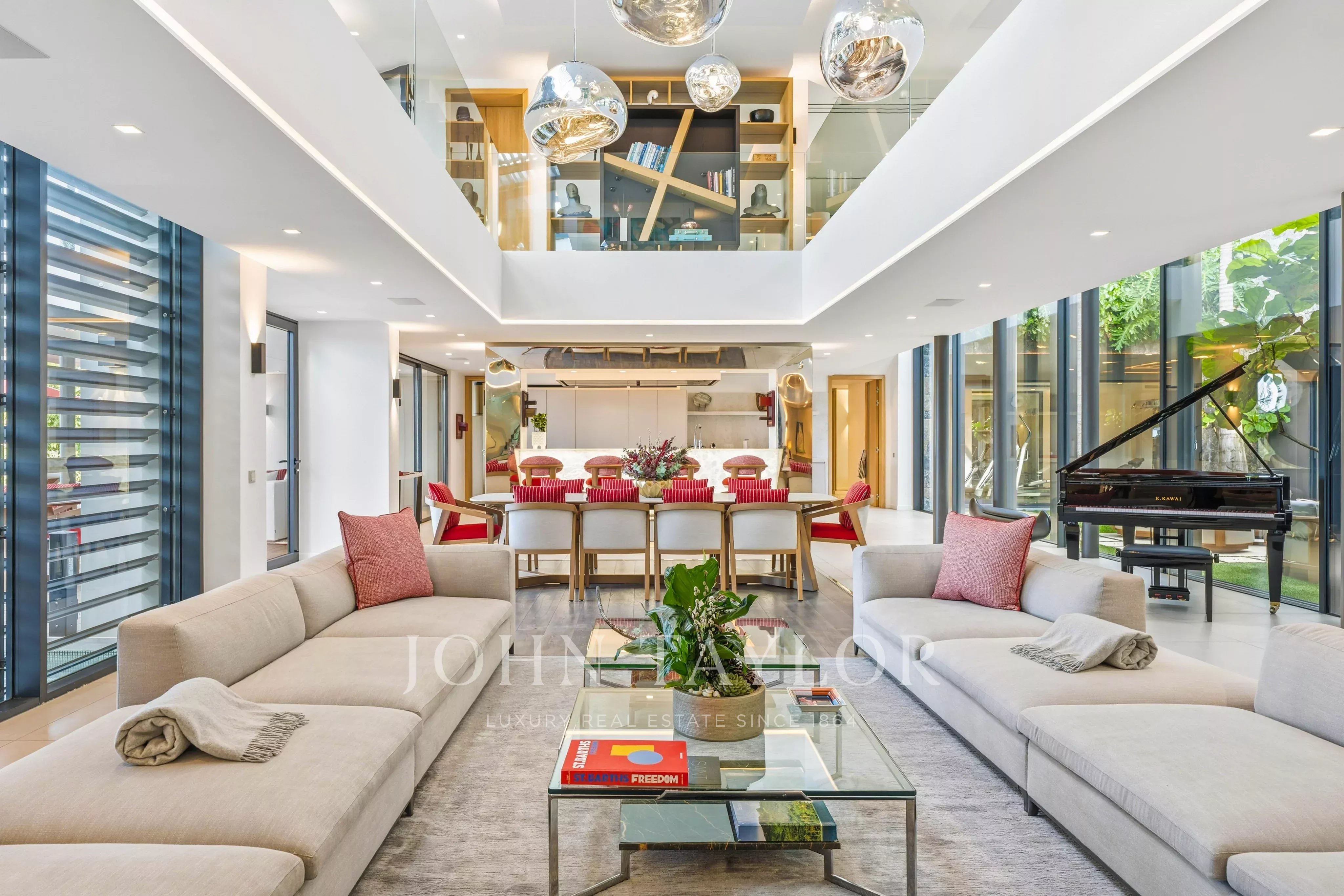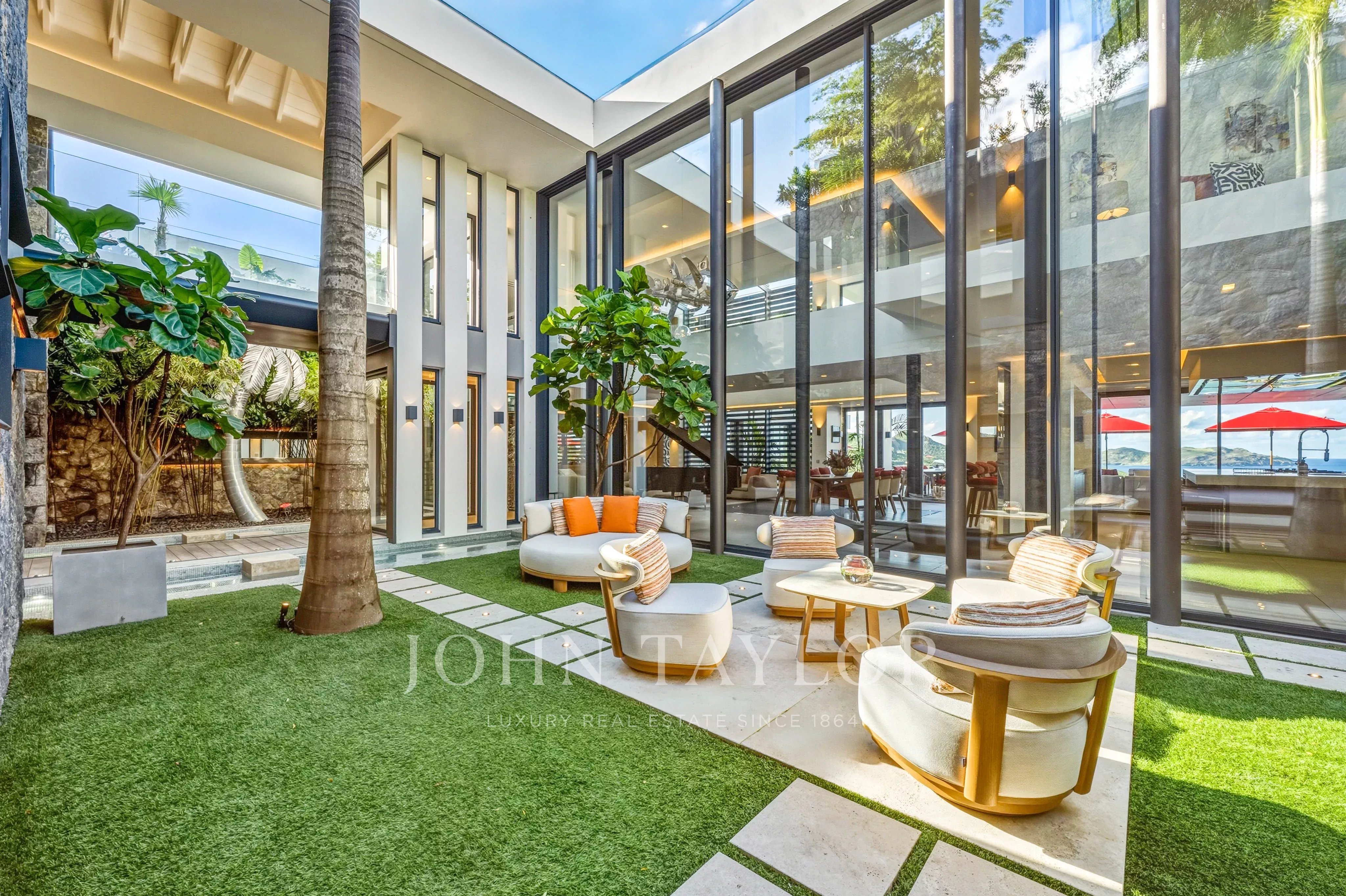 L’extérieur de la villa est à la hauteur de ses intérieurs : une terrasse spectaculaire, agrémentée d’une piscine chauffée à débordement de 30 mètres, s’ouvre sur une vue sur la baie de Saint Jean. L’espace extérieur comprend également un salon lounge, et une salle à manger en plein air.