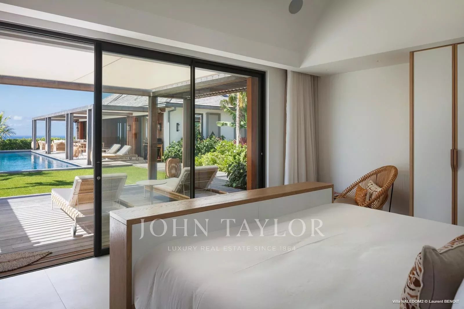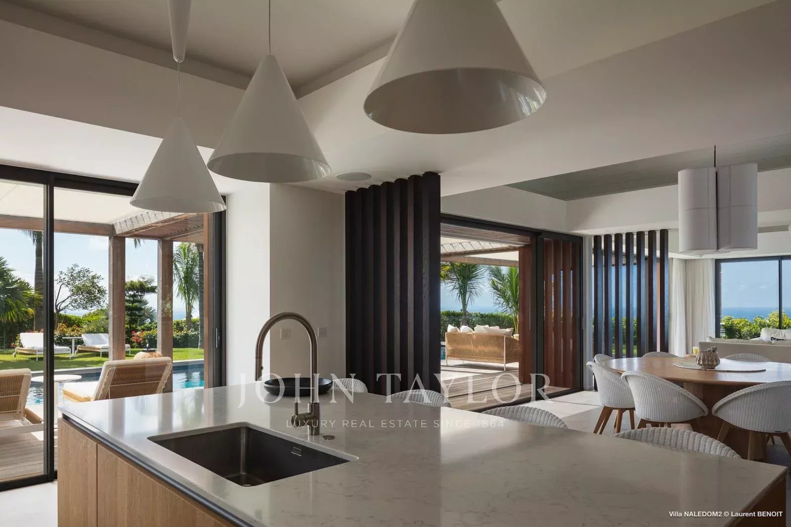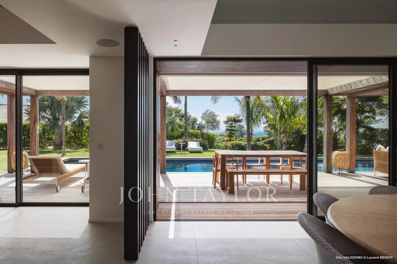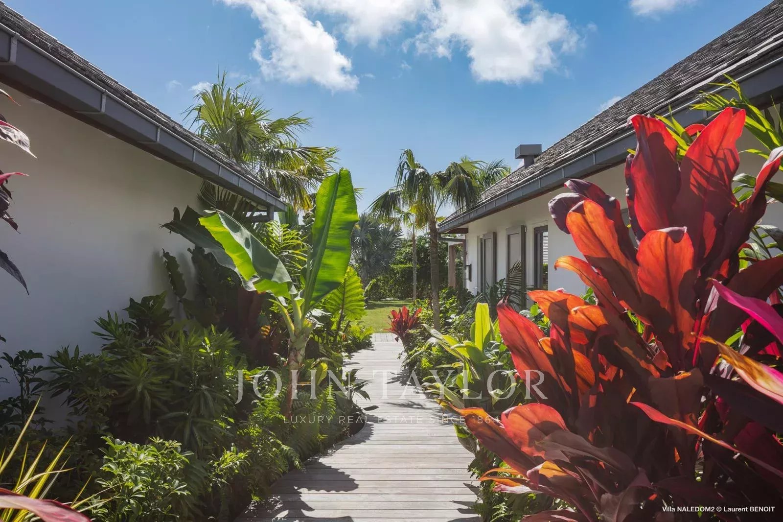 L’accès à la propriété se fait par une passerelle en bois, au cœur d’un jardin tropical, avant de s’ouvrir sur un espace paisible où la vue sur la mer apparaît progressivement, invitant immédiatement au calme.