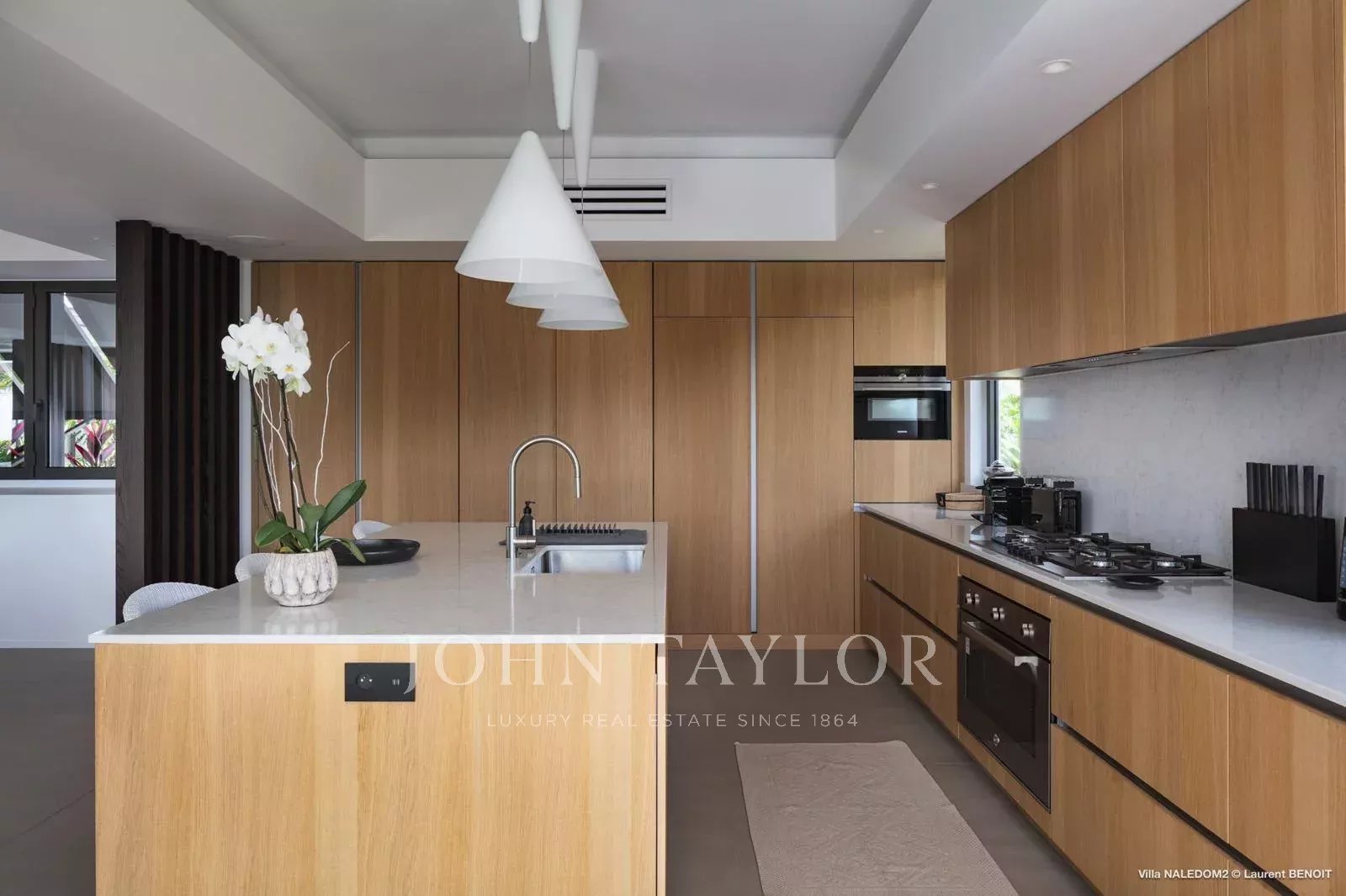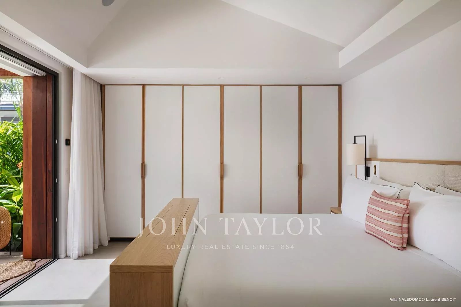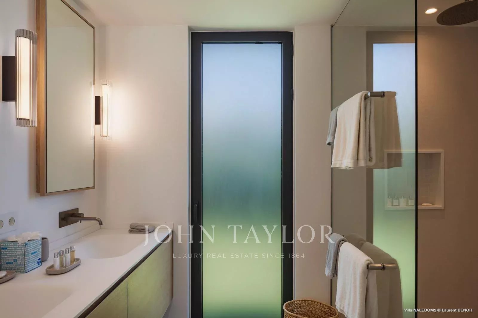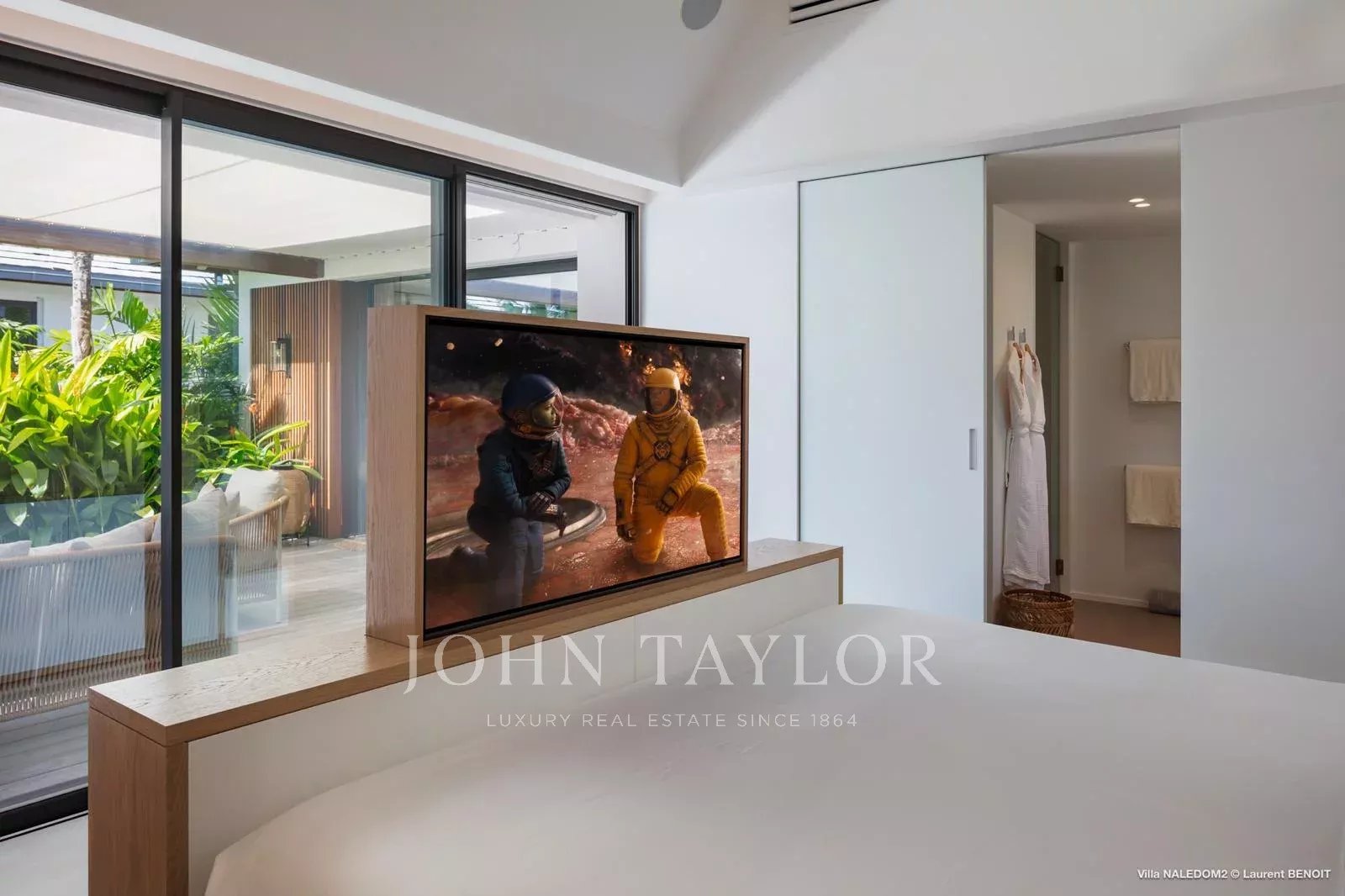 L’accès à la propriété se fait par une passerelle en bois, au cœur d’un jardin tropical, avant de s’ouvrir sur un espace paisible où la vue sur la mer apparaît progressivement, invitant immédiatement au calme.