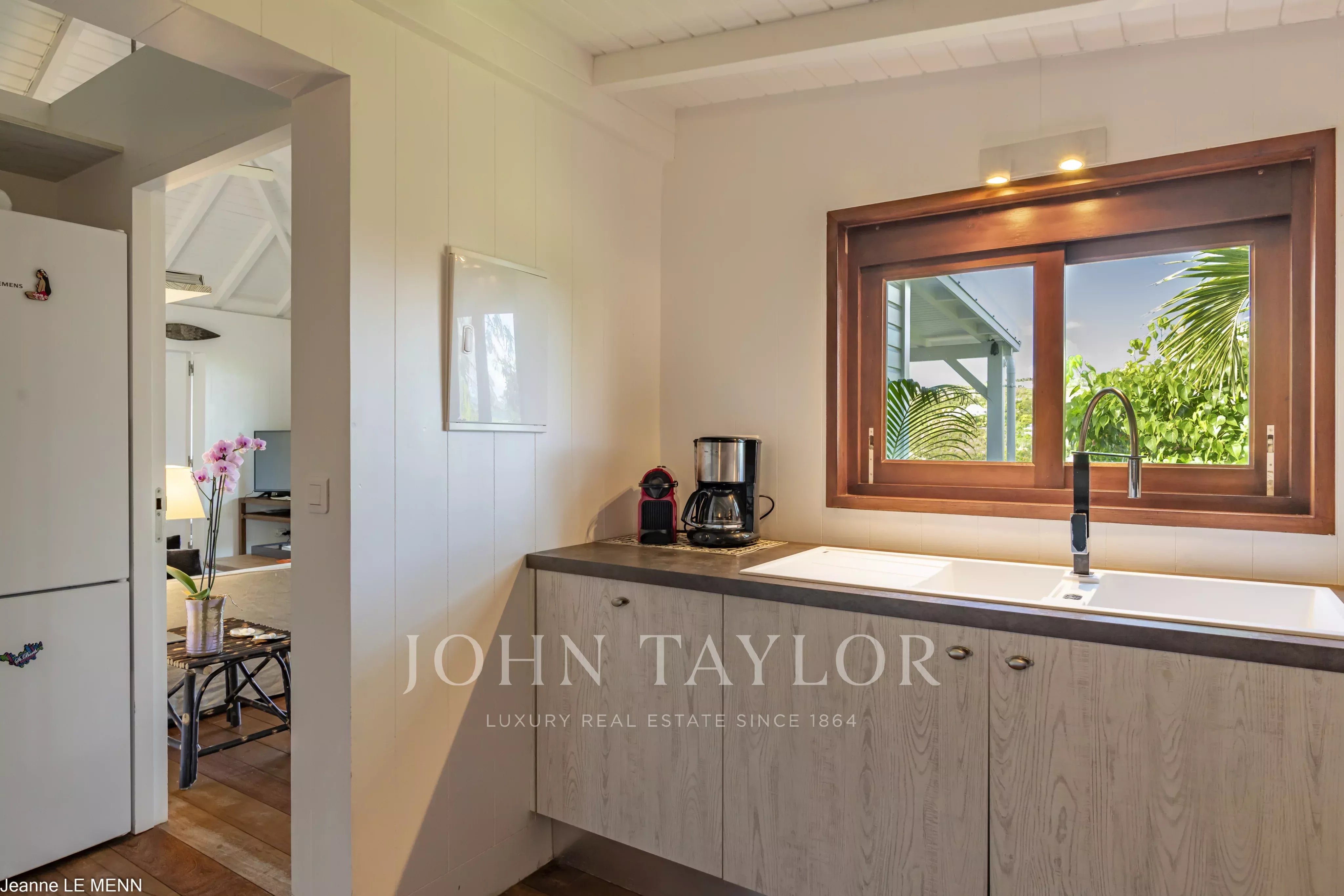 La villa dispose d’un séjour lumineux ouvert sur une terrasse couverte offrant une vue panoramique sur la baie et les collines de Mont-Jean. La cuisine, récemment rénovée et entièrement équipée, complète harmonieusement l’espace de vie.