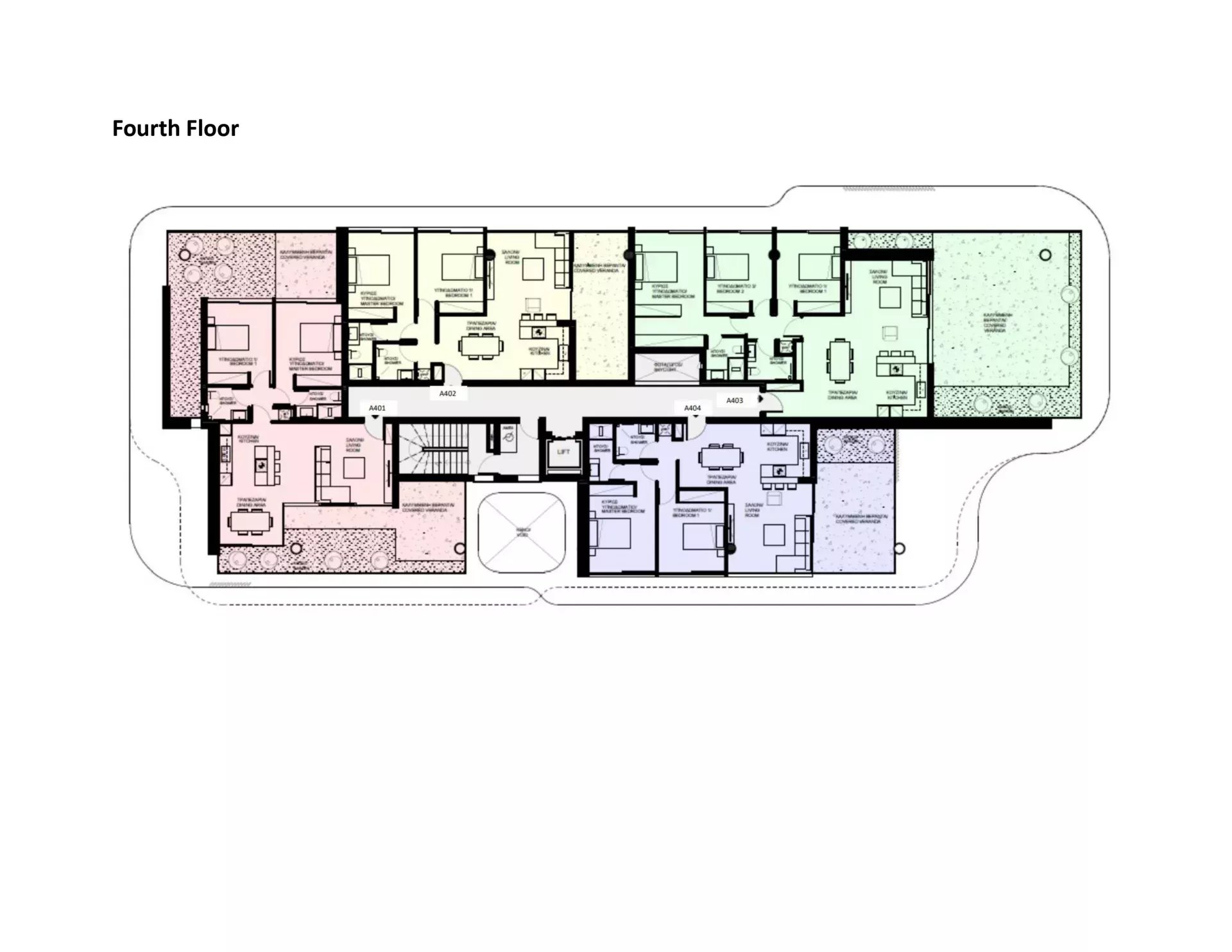 Appartements de 3 chambres (3 unités) : 104 m² intérieurs, 184-188,5 m² de surface couverte totale. Les prix commencent à 1 089 000 € + TVA, avec 2 places de parking chacun. Le prix du penthouse est de 1 650 000 € + TVA, avec un jardin sur le toit et un jacuzzi privé.
