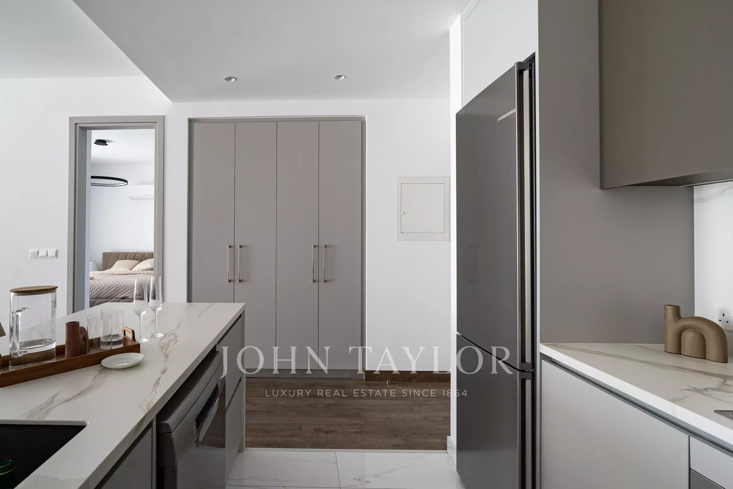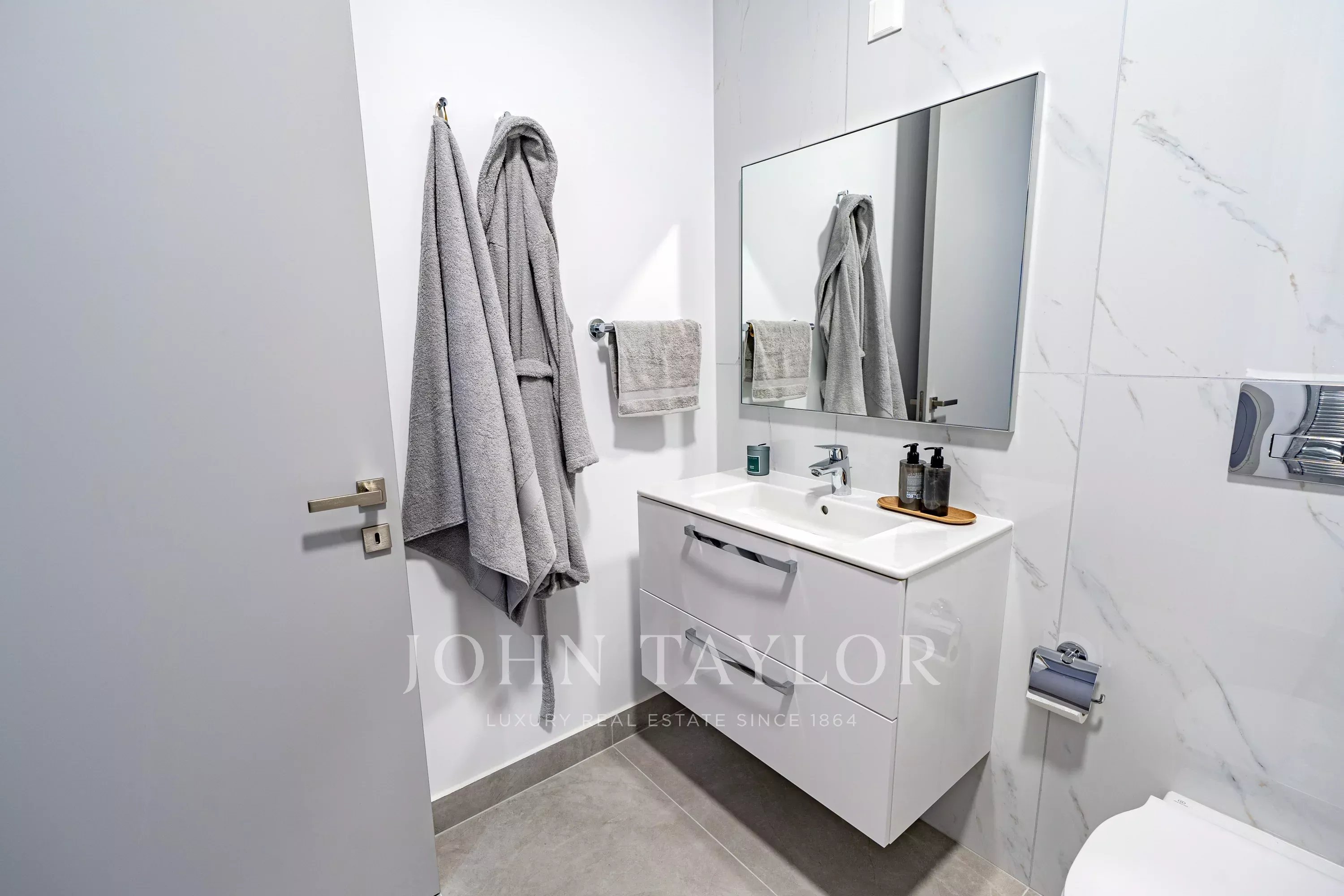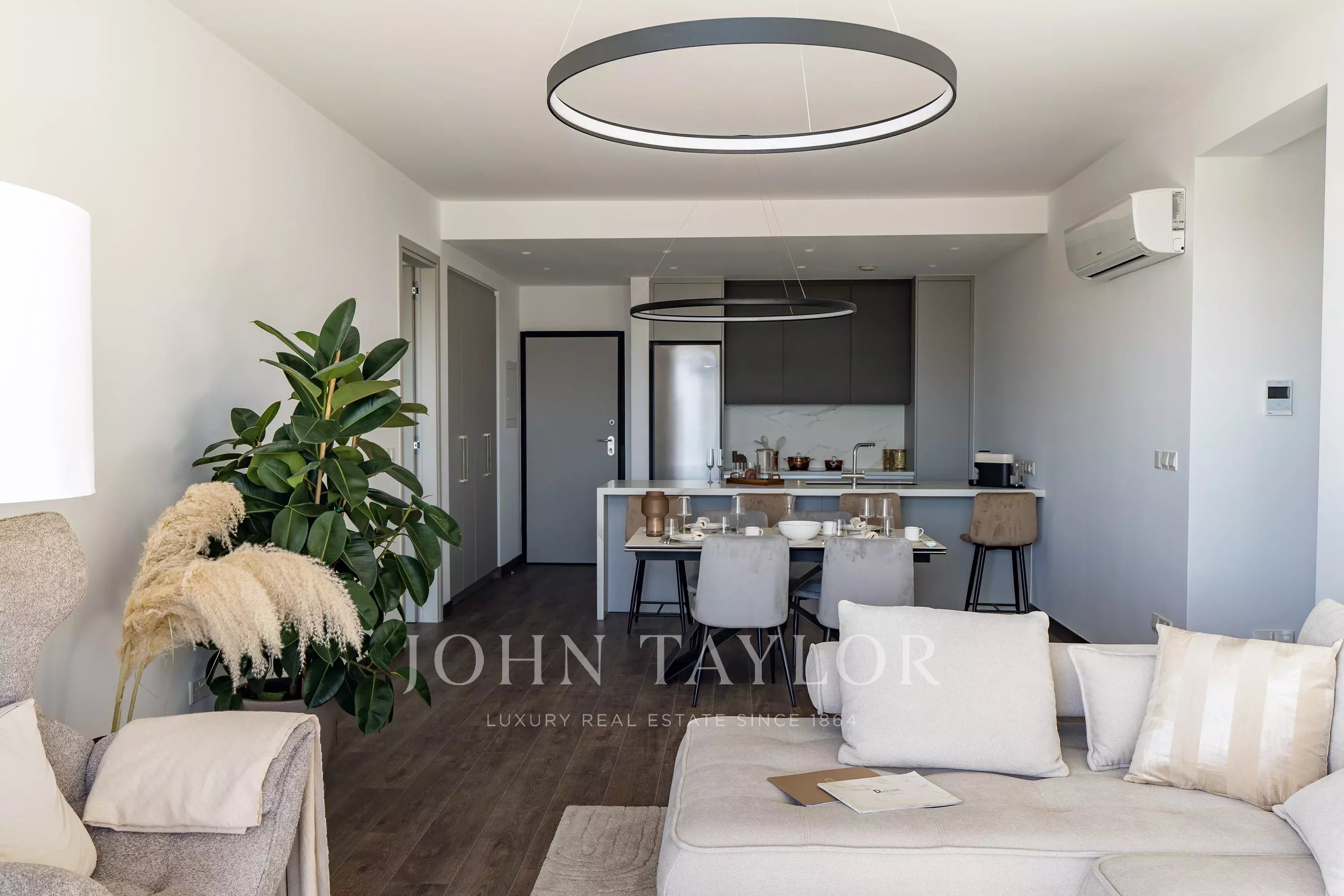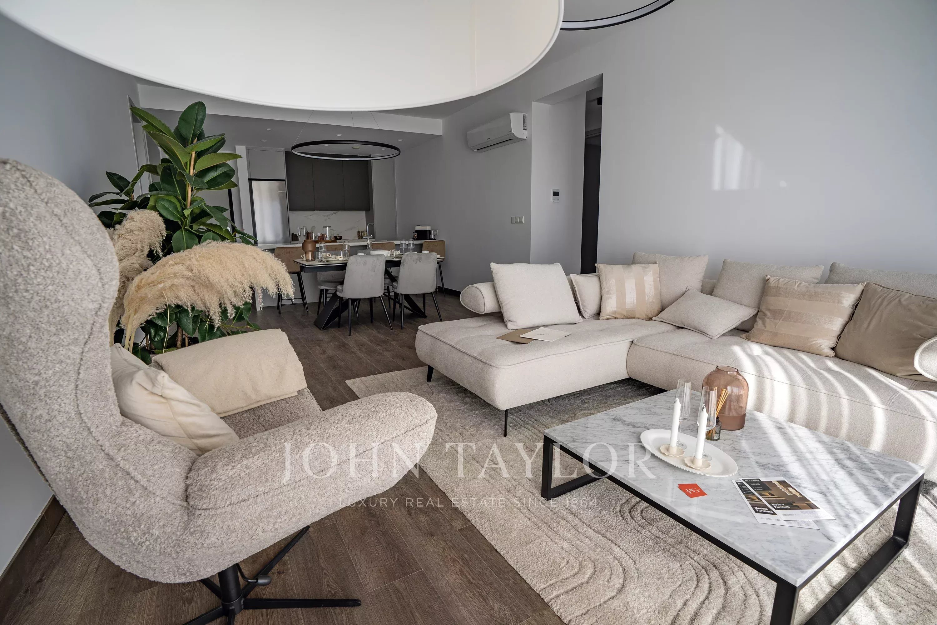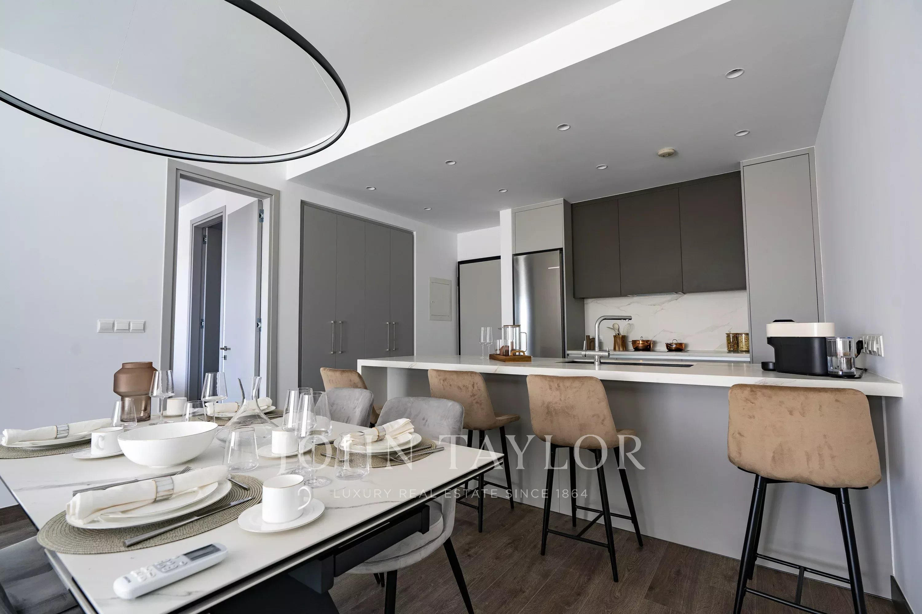 Classe énergétique A, système de climatisation VRV, chauffage au sol, fenêtres en aluminium à double vitrage thermique, hauts plafonds (~3,0 m), finitions en céramique haut de gamme, armoires encastrées et cuisine au design moderne.