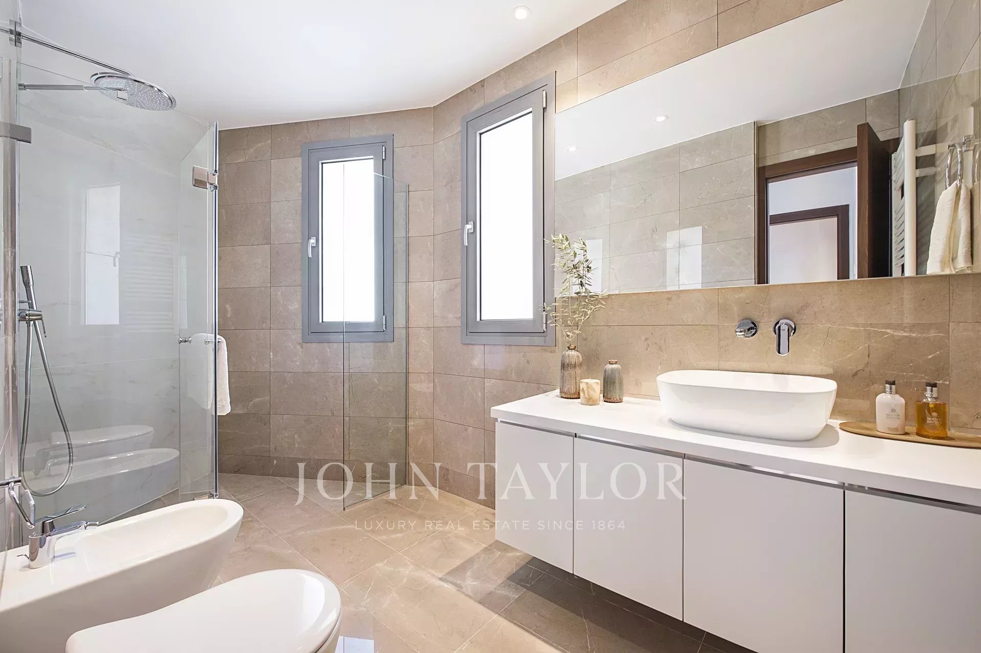 La résidence est dotée d'élégants sols en marbre, d'un chauffage par le sol, de fenêtres à double vitrage avec volets électriques, de cuisines importées sur mesure avec plans de travail en Corian et appareils intégrés, ainsi que de salles de bains en marbre conçues avec goût.