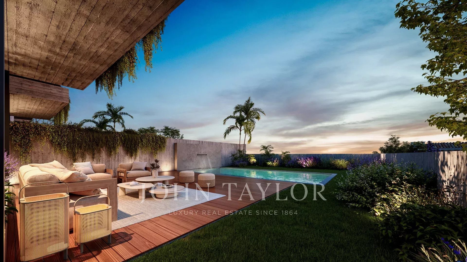 Au niveau du jardin, une zone de loisirs privée se déploie avec une piscine de 7,8 x 3,6 m, un studio pour les invités ou la femme de ménage, et la possibilité de créer une salle de jeux, une salle de sport à domicile, un bureau privé ou un espace de bien-être. Au-dessus, le jardin sur le toit de 79 m² offre une vue sur la mer et la ville et peut être transformé en espace barbecue, en salon ou en espace de réception au coucher du soleil. Il s'agit d'une maison qui s'adapte à votre style de vie, et non l'inverse.