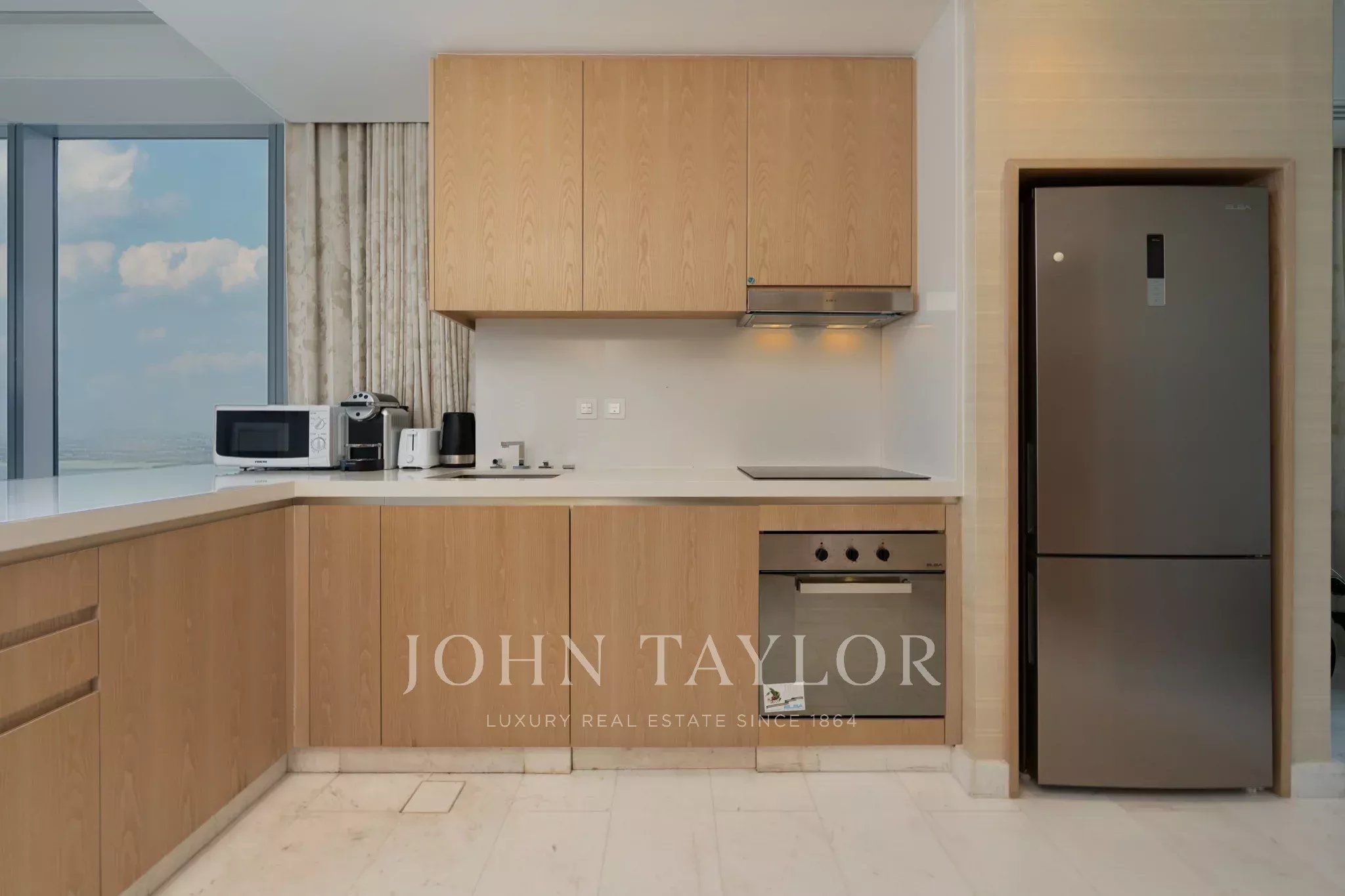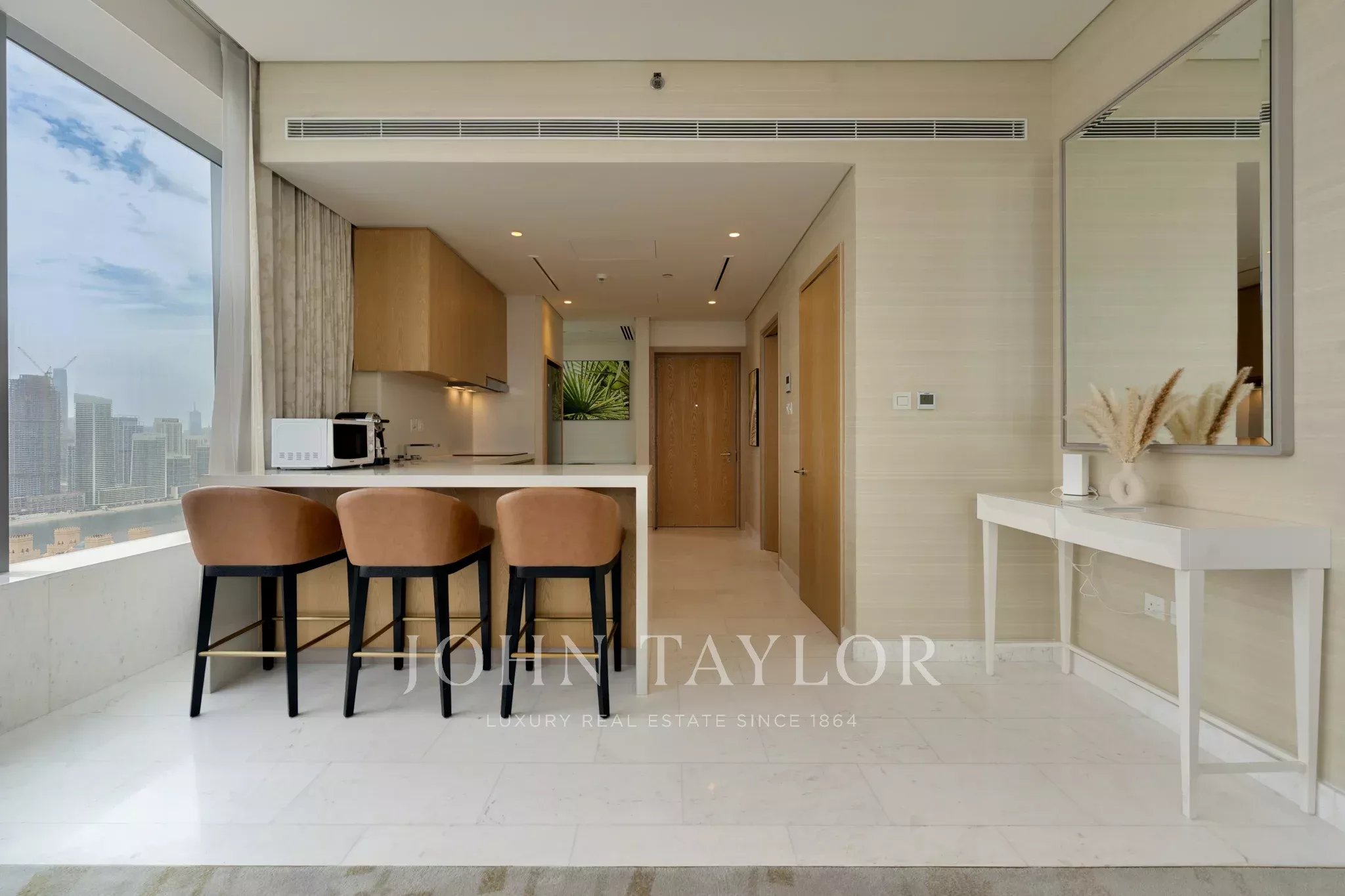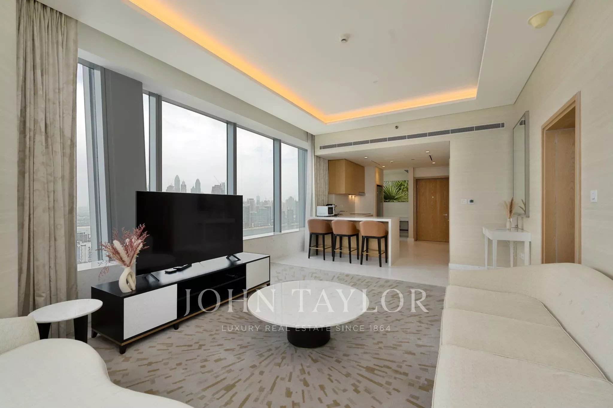 Ce charmant appartement d'une chambre offre 103,3 m² d'espace de vie joliment conçu avec vue imprenable sur la ville et l'eau à travers de grandes fenêtres coulissantes. Profitez de l'ambiance tranquille du salon ouvert, doté de meubles modernes, d'un éclairage d'ambiance et d'une disposition accueillante qui crée un environnement parfait pour la détente ou recevoir des invités.