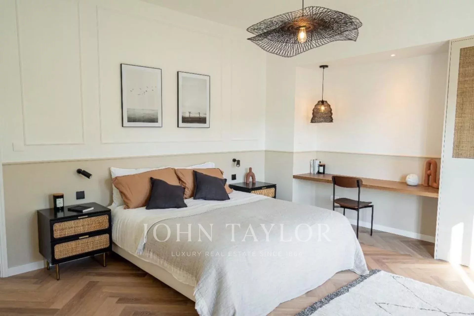 Les influences françaises transparaissent à travers d'élégantes moulures, des luminaires et des poignées parisiens faits à la main, des murs en verre de style Art déco et des sols en bois à chevrons. Des œuvres d'art modernes en acrylique, des meubles de créateurs et des tons vifs apportent un élément de mode, promettant un style de vie dubaïote d'un niveau supérieur.
