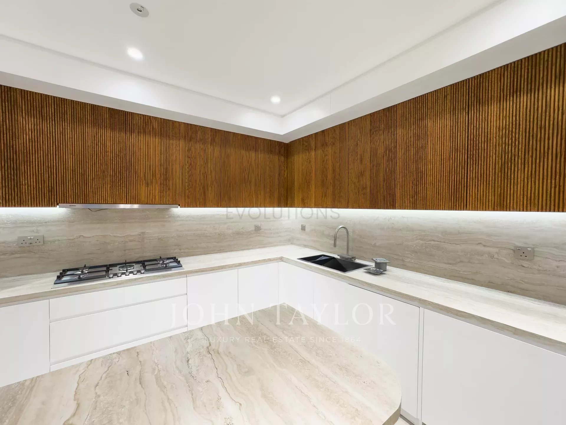 Cuisine moderne : Cuisine haut de gamme entièrement équipée avec appareils électroménagers intégrés, offrant un grand espace de travail et de rangement pour le chef cuisinier.