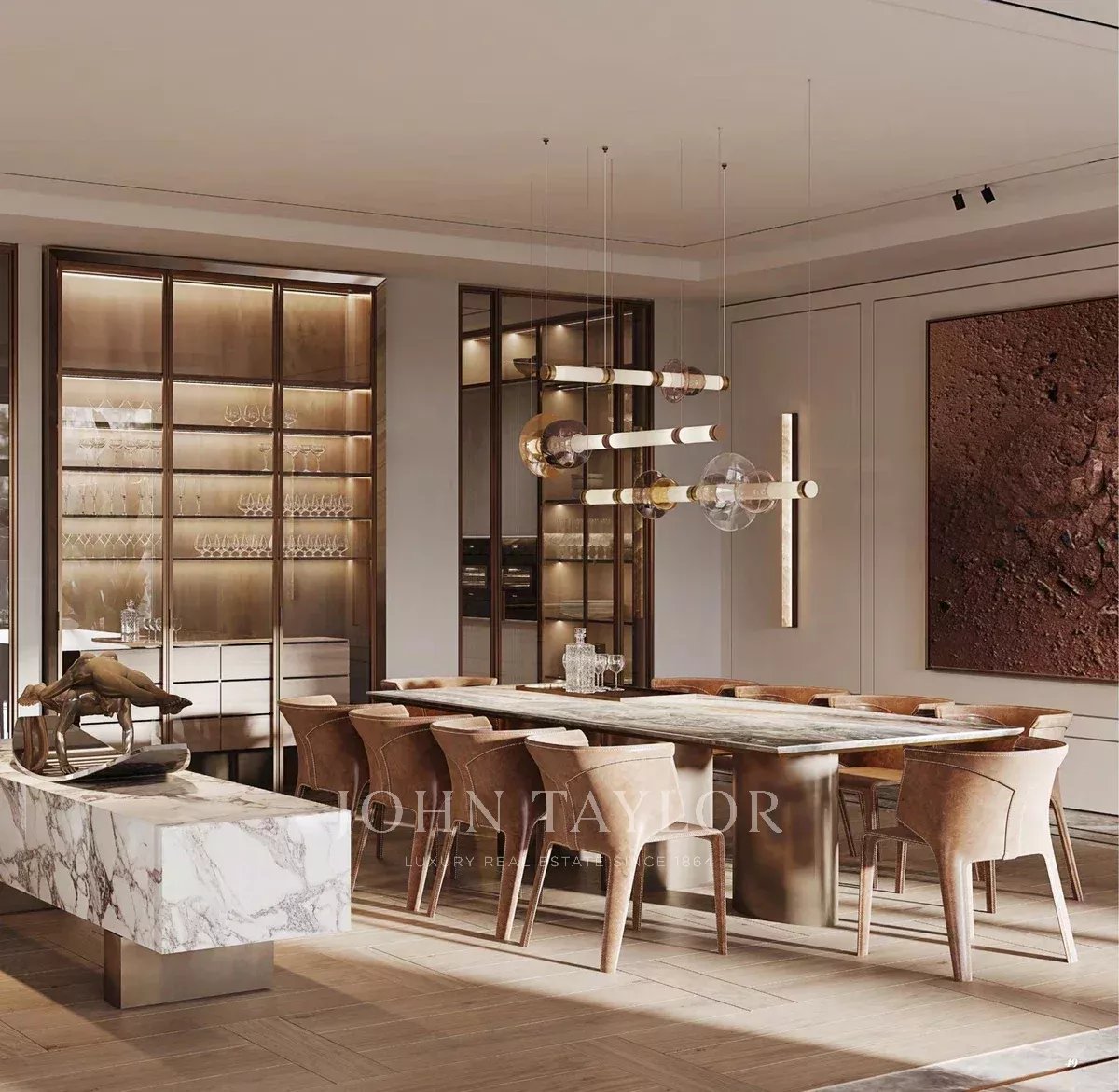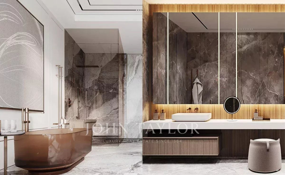Palm Jumeirah est connu pour ses zones résidentielles luxueuses, comprenant des villas, des maisons de ville et des complexes d'appartements haut de gamme. Les propriétés offrent une vue imprenable sur la mer et la ligne d'horizon de Dubaï.