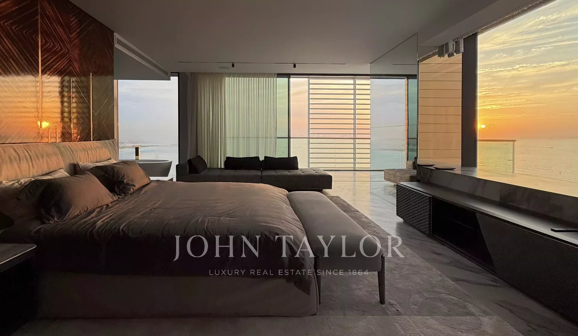 Deuxième chambre principale au niveau inférieur avec vue sur le coucher de soleil et terrasse privée