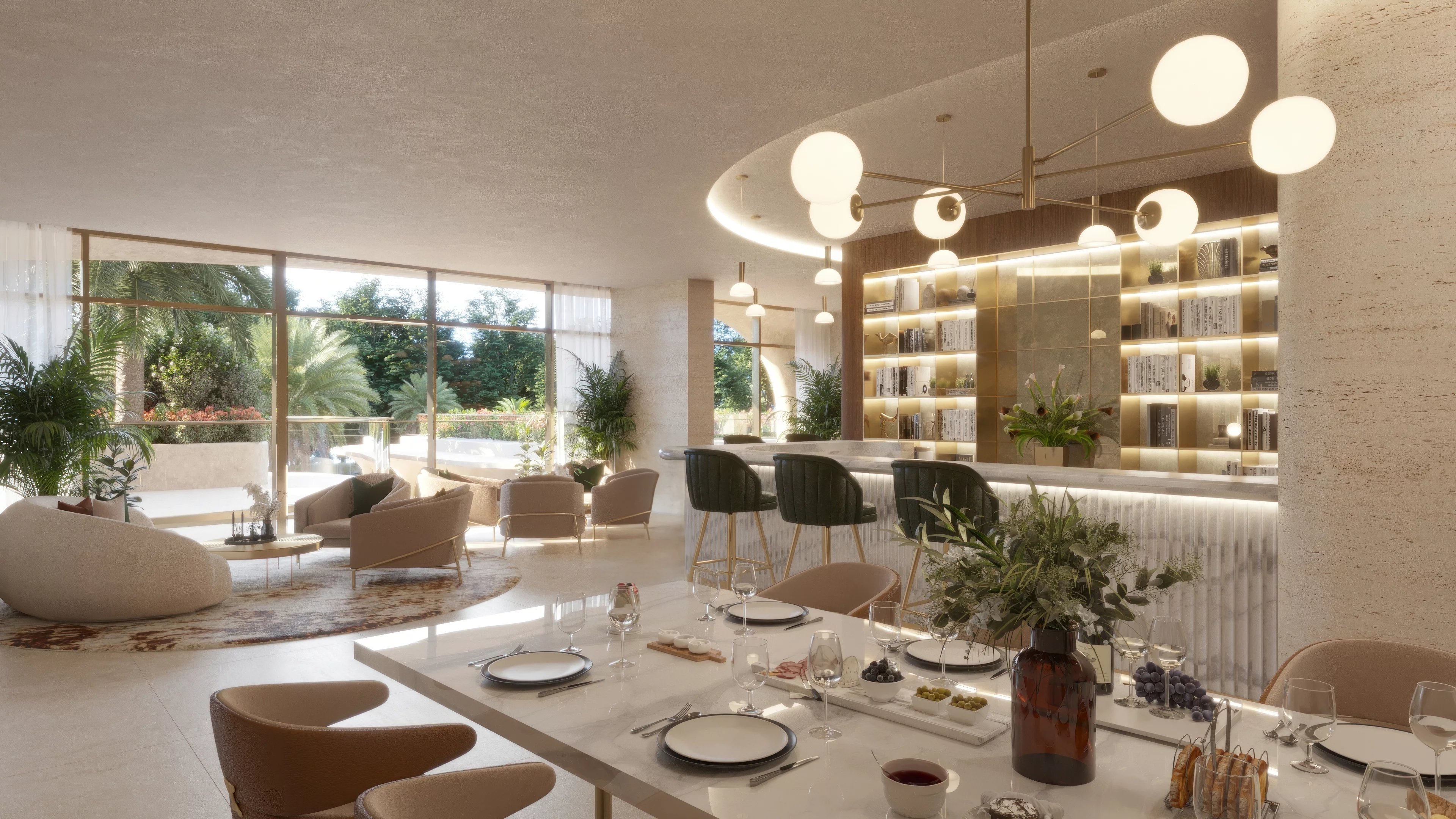 Au cœur de la maison, la cuisine ouverte donne sur une salle à manger spacieuse et un salon élégant, le tout s'ouvrant naturellement sur la terrasse extérieure. La cuisine ouverte s'articule autour d'un grand îlot en pierre naturelle, encadré par des meubles aux tons doux qui créent une atmosphère raffinée et accueillante. Elle est complétée par une cuisine de préparation et un cellier dédiés, dotés d'un sol en marbre naturel au fini naturel et vitrifié. Les plans de travail et les crédences sont fabriqués en quartz haut de gamme ou en pierre frittée, alliant durabilité et élégance. L'espace est équipé de meubles de qualité européenne dotés de portes et de tiroirs coulissants robustes à fermeture en douceur, tous soigneusement conçus pour offrir une fonctionnalité optimale. La cuisine est entièrement équipée d'appareils électroménagers Miele, comprenant un réfrigérateur-congélateur, une cuisinière à gaz, un four à gaz, une hotte à recyclage et un lave-vaisselle.