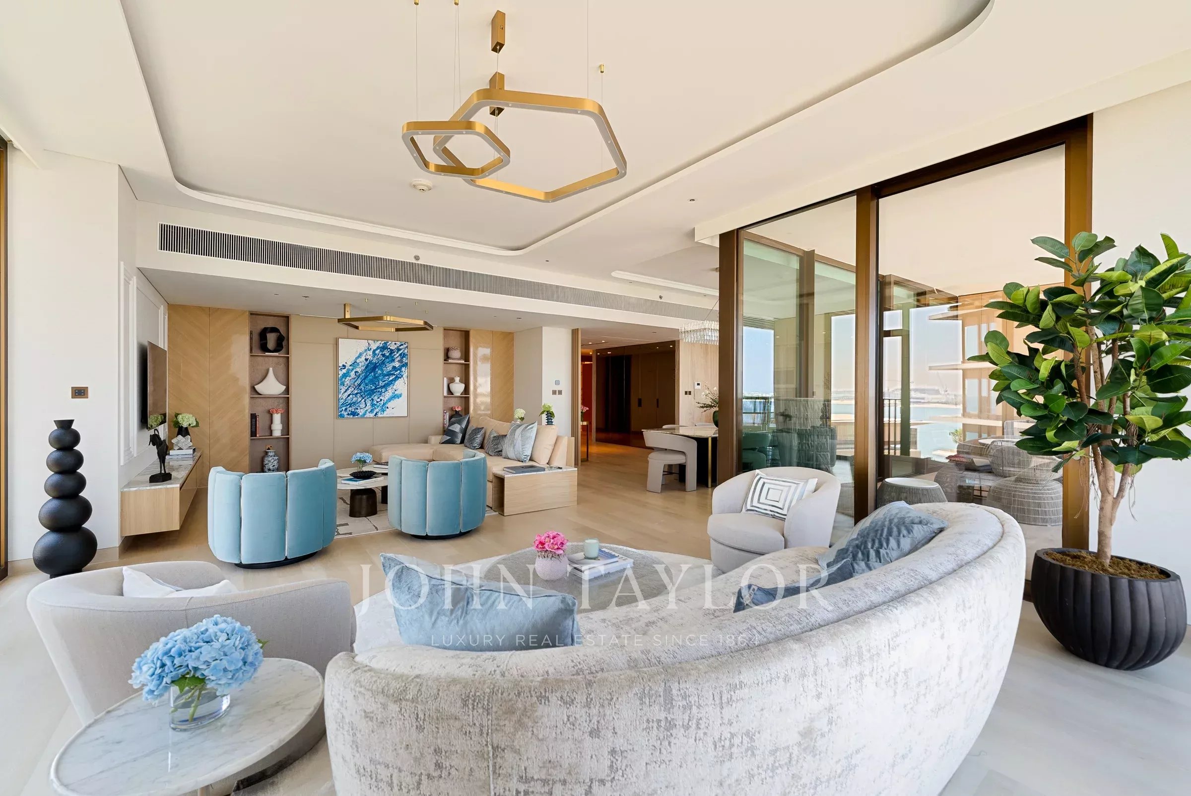 Avec une surface de 3 168 pieds carrés, cet appartement dans Bulgari Residences est livré entièrement meublé. Stylé dans des tons neutres de blanc, beige et bleu, la maison présente un refuge en bord de mer accueillant avec vue sur la marina.