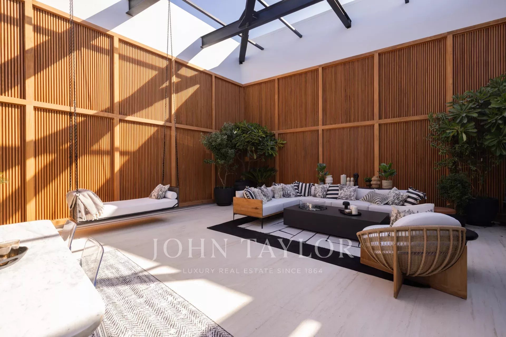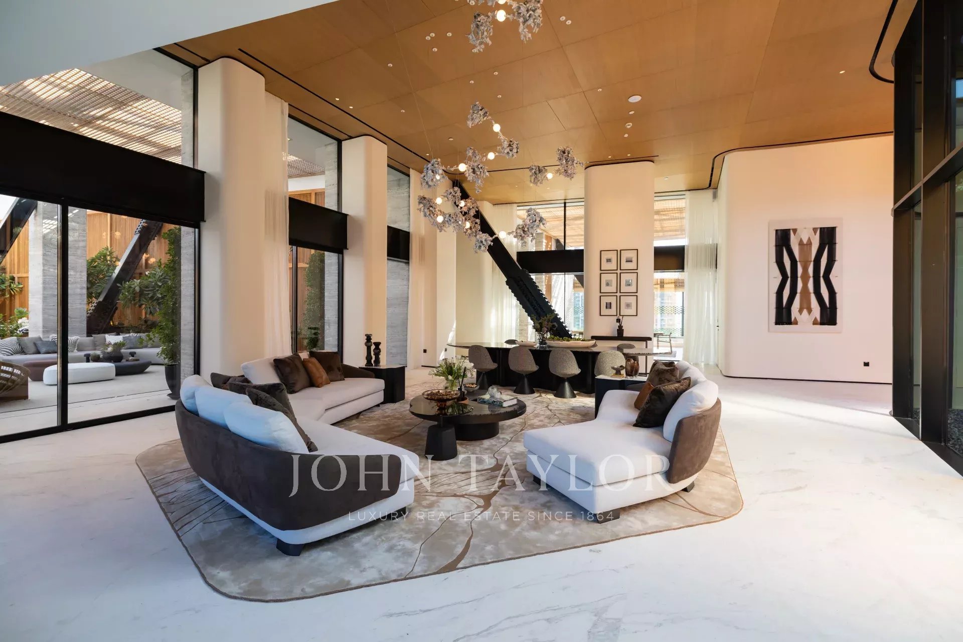 S'étendant sur une surface impressionnante de 1 188 m² d'espace de vie méticuleusement conçu, cette résidence entièrement meublée présente des hauteurs de plafond de plus de 5 mètres et 4 terrasses panoramiques, garantissant une vie intérieure et extérieure transparente, idéale pour recevoir et se détendre.