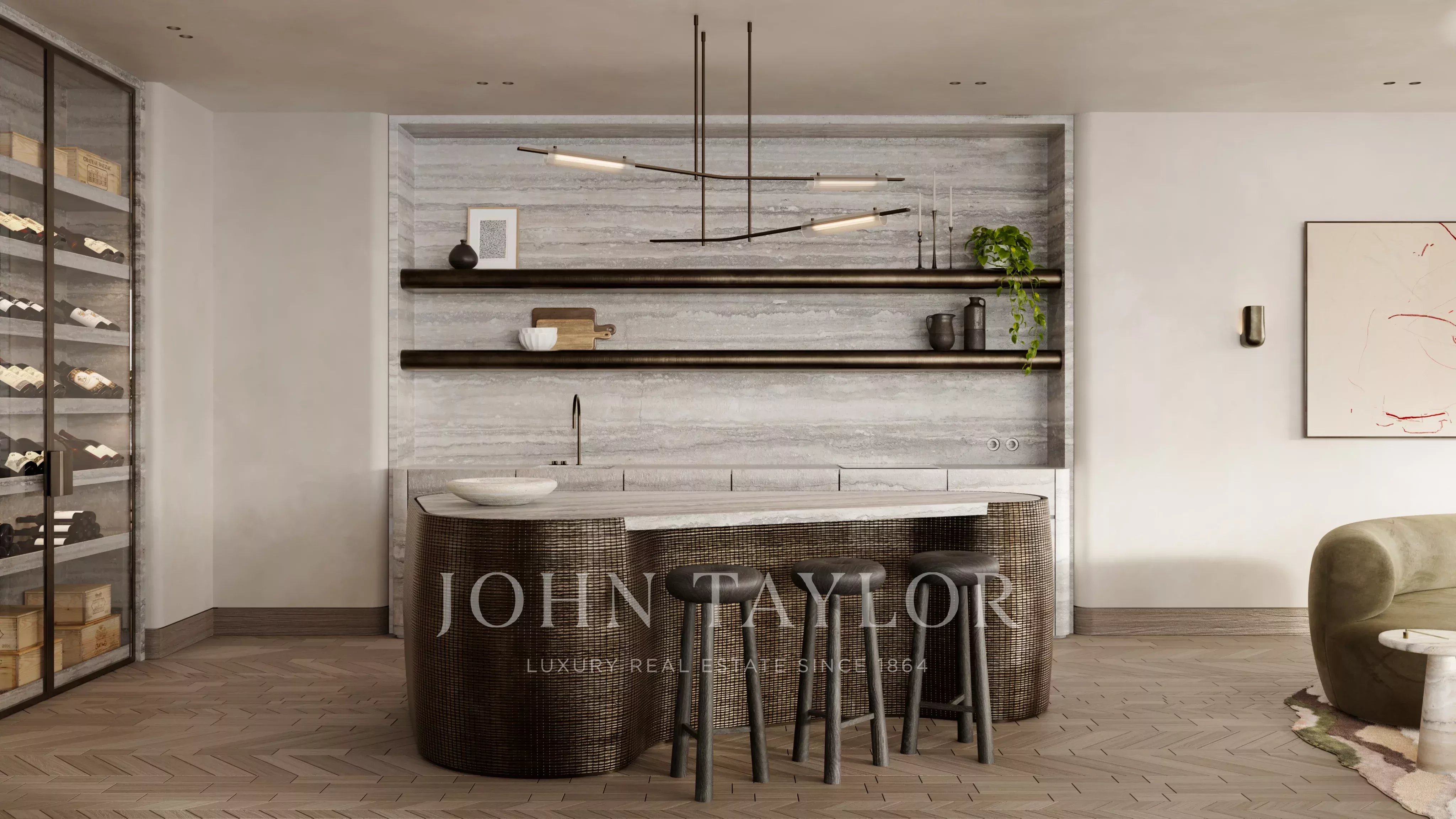 La cuisine est ancrée dans un îlot dont la base est en bronze martelé et le dessus en travertin argenté. Les armoires, le dosseret et les étagères sont revêtus de travertin argenté, créant ainsi une présence monolithique et homogène. À gauche, la cave à vin est intégrée au mur du fond avec des étagères superposées et de la profondeur. Au-dessus, une suspension sculpturale diffuse une lumière douce, tandis que le parquet en chêne confère à l'espace chaleur et texture. L'espace est soutenu par une cuisine d'appoint. L'espace de vie dispose également d'une salle d'eau.