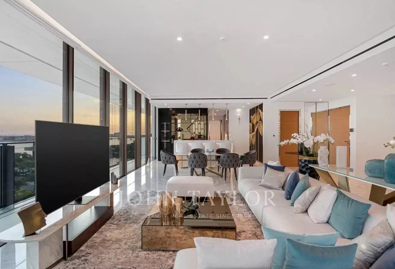 Entrez dans un monde d'élégance inégalée dans ce Sky Court méticuleusement rénové, où le verre du sol au plafond encadre des vues panoramiques sur le golfe Persique et la ligne d'horizon de la ville. Chaque élément a été conçu dans un souci de sophistication, qu'il s'agisse des vastes espaces de vie ouverts, du mobilier sur mesure ou des détails architecturaux.