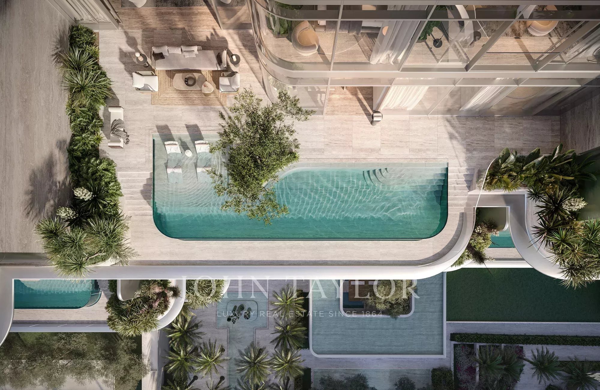 Le duplex se distingue par sa vaste terrasse extérieure et sa piscine à débordement. La piscine privée s'étend sur 18 mètres de long et 3 mètres de large. Les résidents peuvent choisir de maximiser cette surface de 2 921 m² en y incluant une salle à manger en plein air, des chaises longues et bien plus encore. Cet espace extérieur est relié de manière transparente à la cuisine et aux salles à manger, ce qui en fait un lieu idéal pour recevoir des invités tout en profitant d'une vue imprenable sur la ville et la mer.