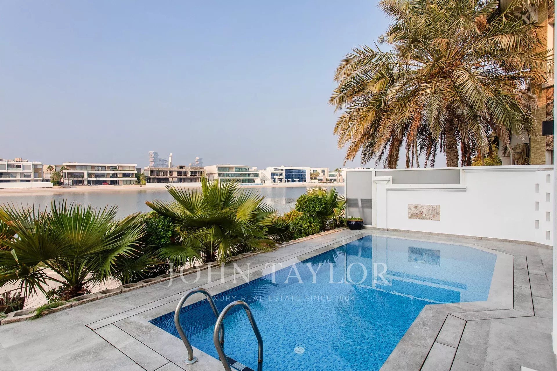 Située sur un terrain de 623 m² avec une surface construite de 465 m², cette propriété raffinée allie des améliorations modernes au charme intemporel de Palm Jumeirah.