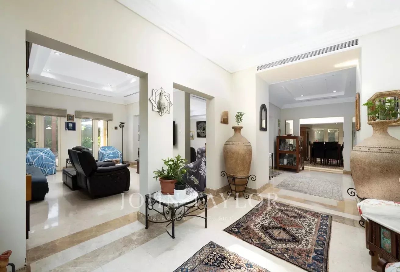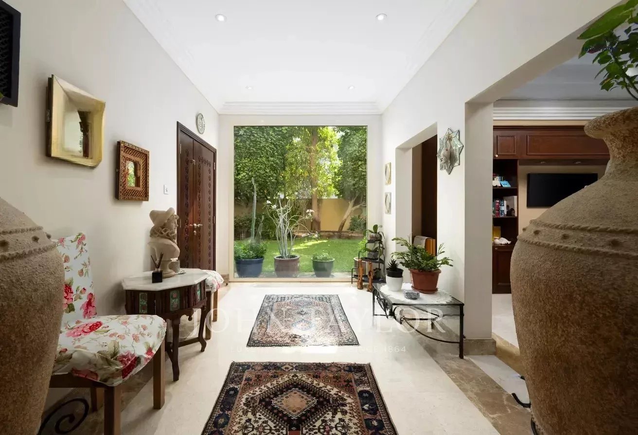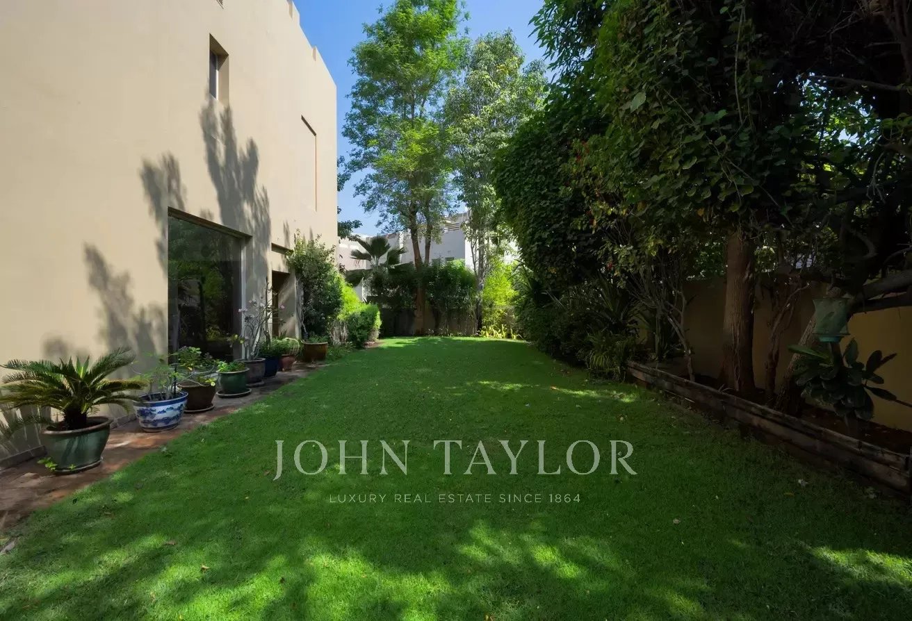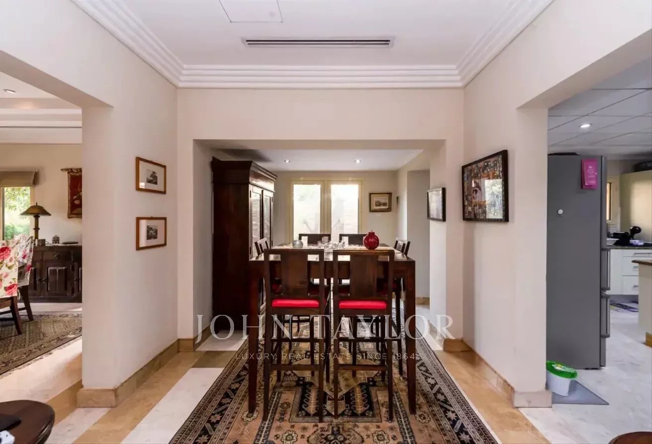 D'une superficie d'environ 6 000 m², la villa comprend cinq chambres avec salle de bains, une cuisine ouverte, trois salles de réception spacieuses, une chambre de bonne et un grand hall d'entrée. Le jardin magnifiquement aménagé comprend une piscine privée et une salle à manger extérieure, idéale pour se détendre et recevoir.
