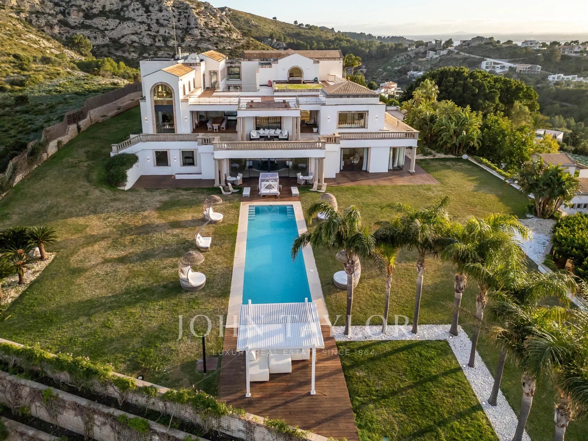 L'extérieur de la propriété offre un éventail de zones différentes pour les repas en plein air et les divertissements pour les groupes de petite ou grande taille, la piscine, les jardins manucurés, le court de tennis, la "serre" et l'héliport pour un accès aérien direct à la propriété.