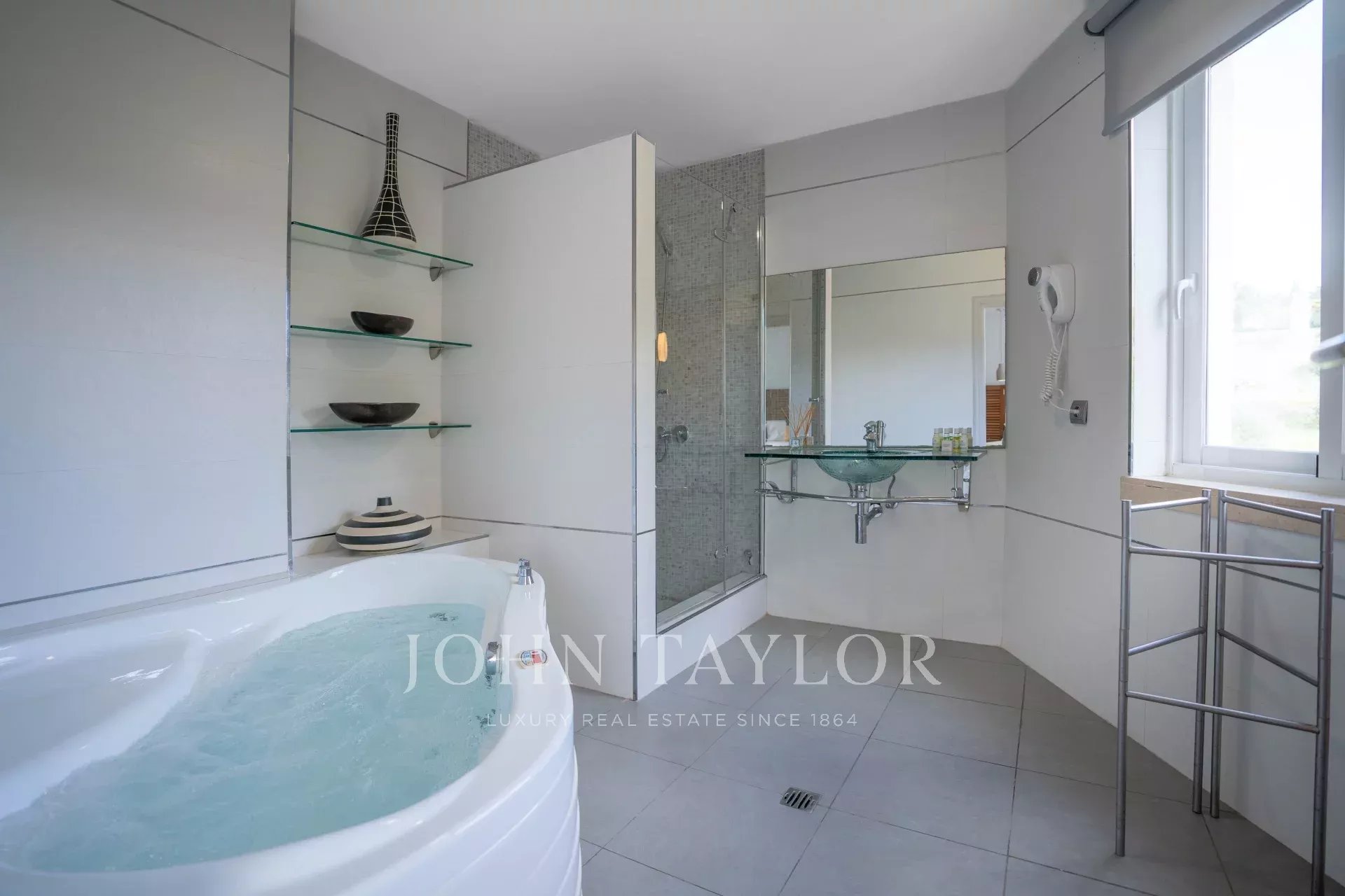 Avec une surface construite de 330 m2, cette villa est entourée de 6000 m2 de jardins méditerranéens privés luxuriants remplis de belles fleurs et de fontaines, et comprend une piscine, un barbecue et un terrain de football privé.